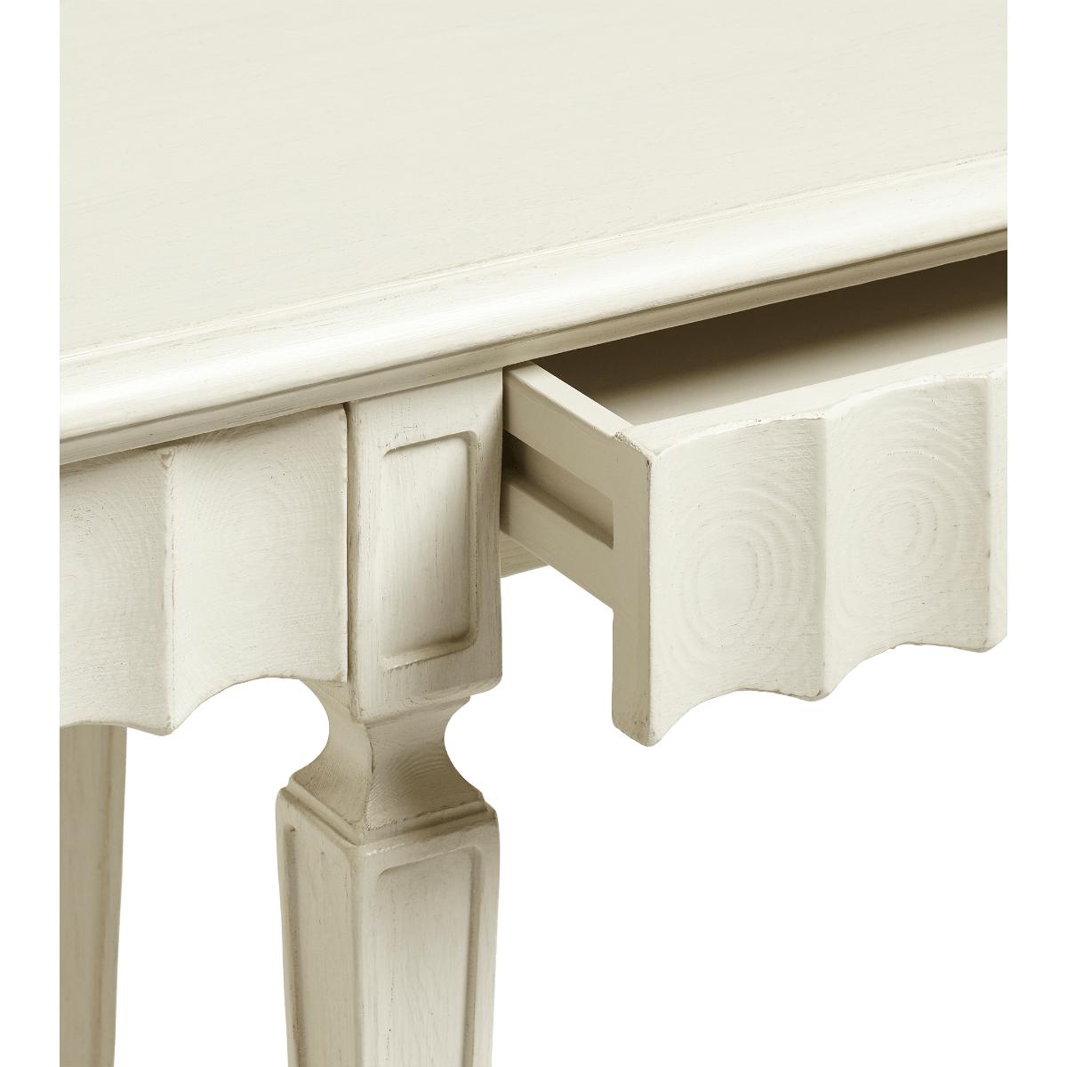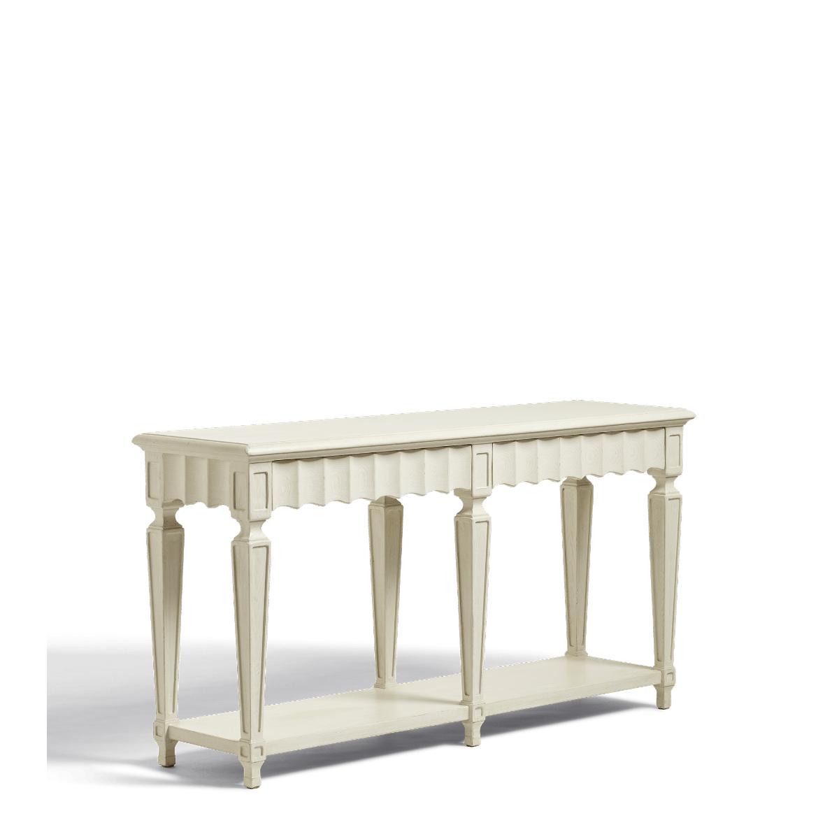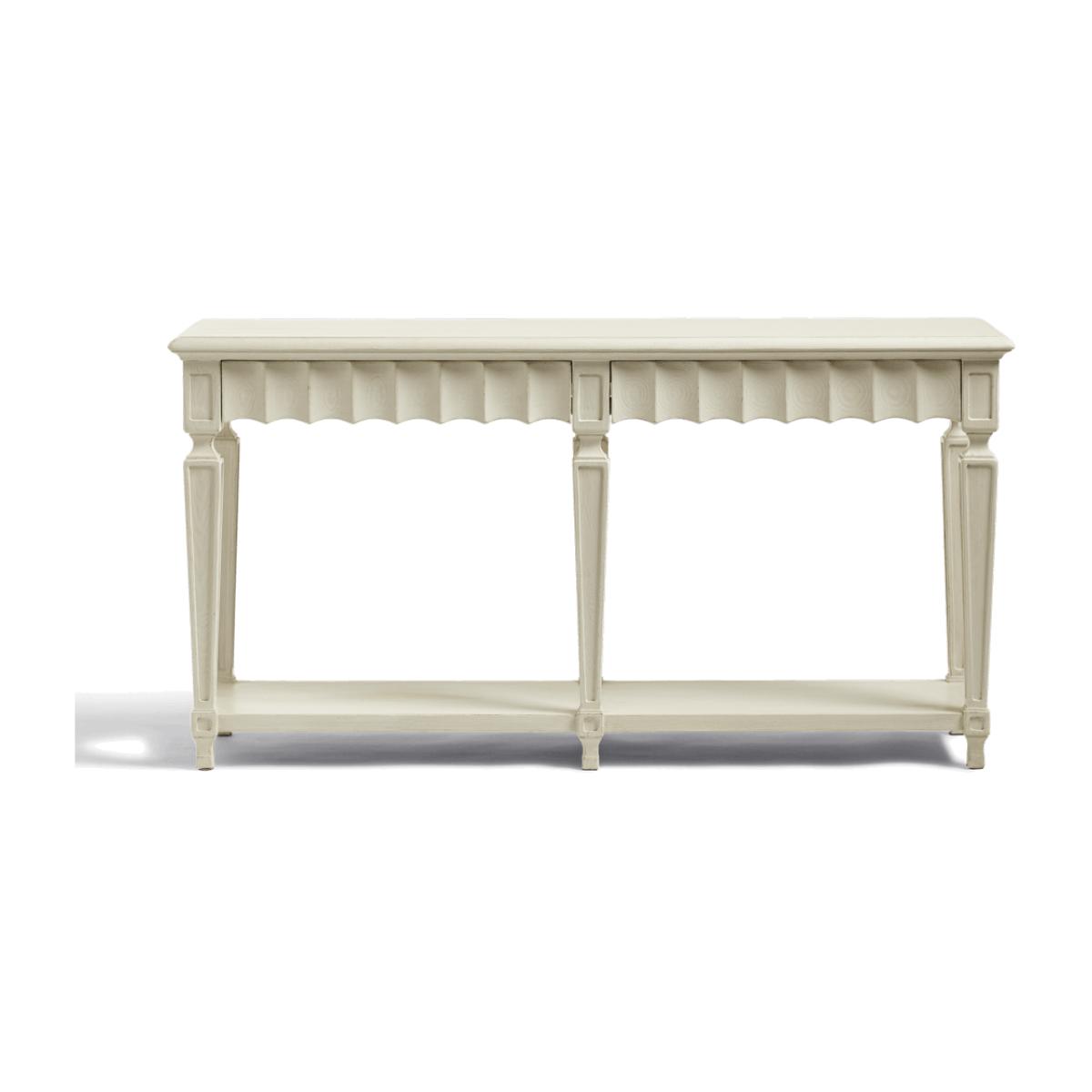 Seeking frills? Make space in your scheme for our antique Gustavian-inspired Ruffelen pieces. The collection comprises two dining tables (one extendable, one oval) and a matching console table – all of which are hand-painted a period-appropriate pale grey-green hue. This console is ideal if you’re short on square footage but need lots of storage; display your favourite ornaments on the two-tiered silhouette, which nods to vintage Scandinavian furniture with its tapered legs, ruffle trim and small feet.