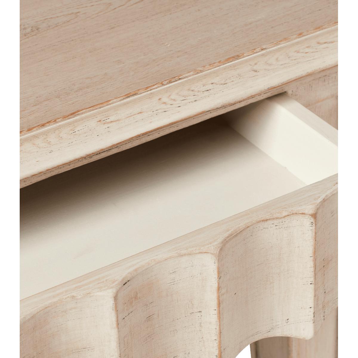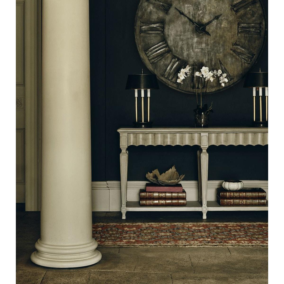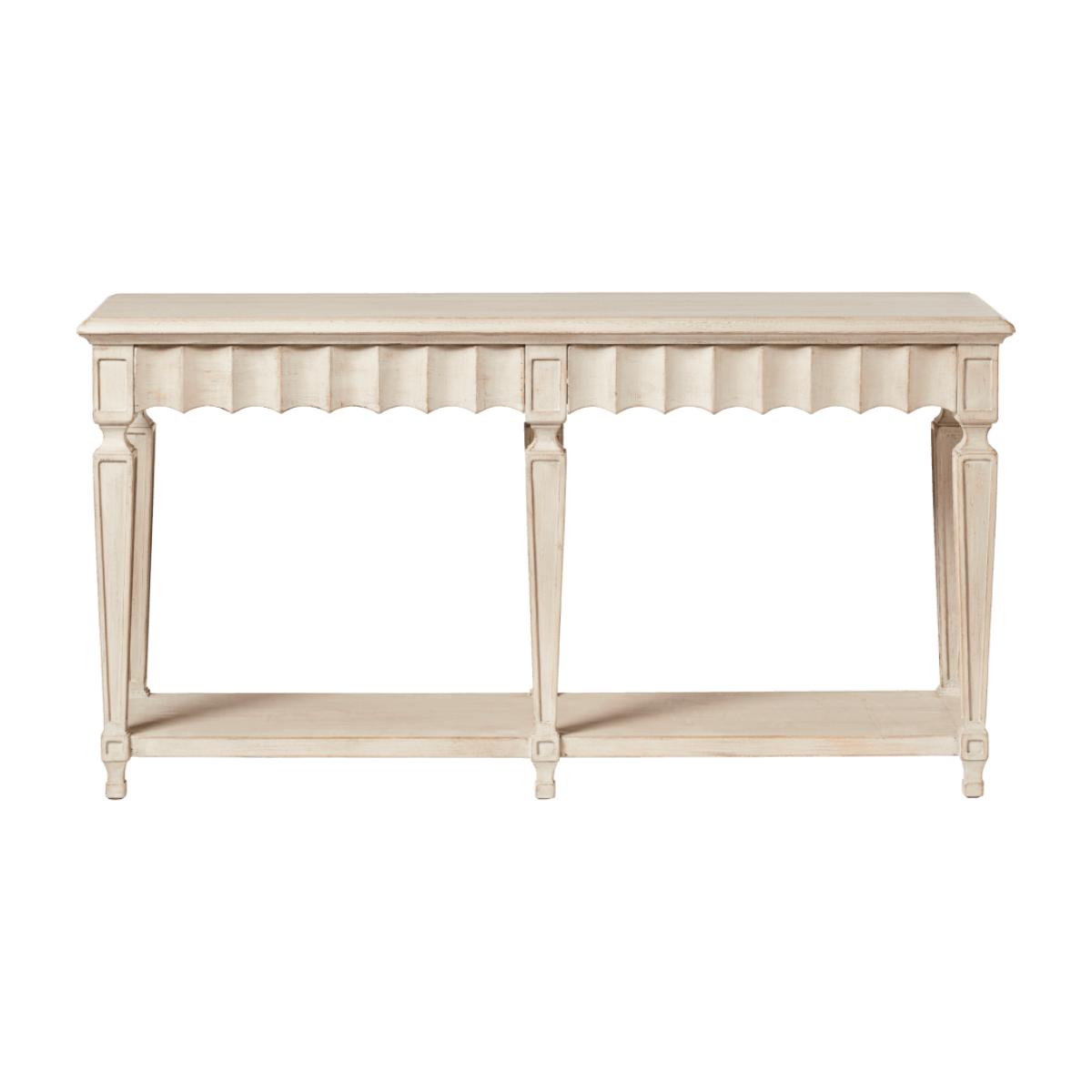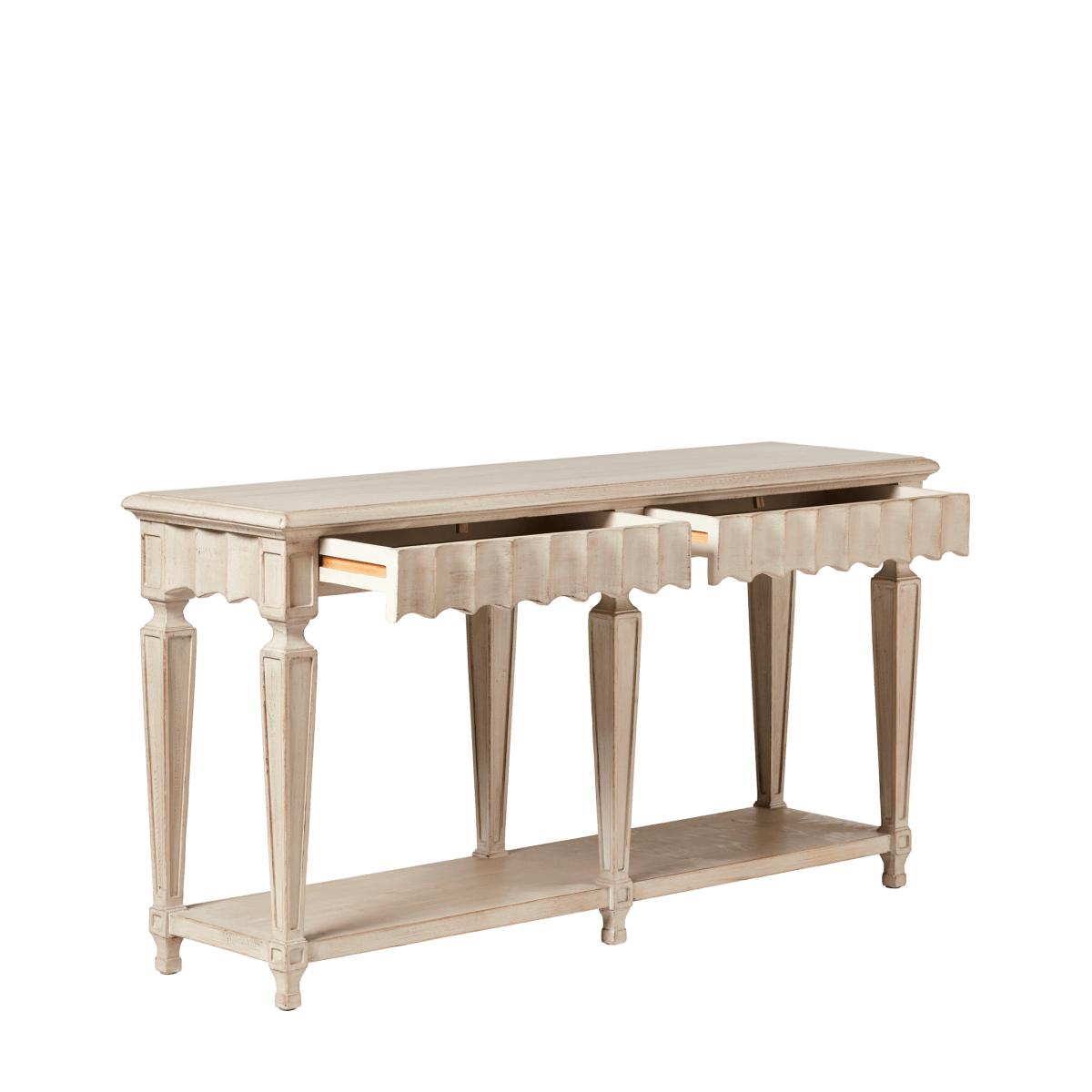 Seeking frills? Make space in your scheme for our antique Gustavian-inspired Ruffelen pieces. The collection comprises two dining tables (one extendable, one oval) and a matching console table – all of which are hand-painted a period-appropriate pale grey-green hue. This console is ideal if you’re short on square footage but need lots of storage; display your favourite ornaments on the two-tiered silhouette, which nods to vintage Scandinavian furniture with its tapered legs, ruffle trim and small feet.