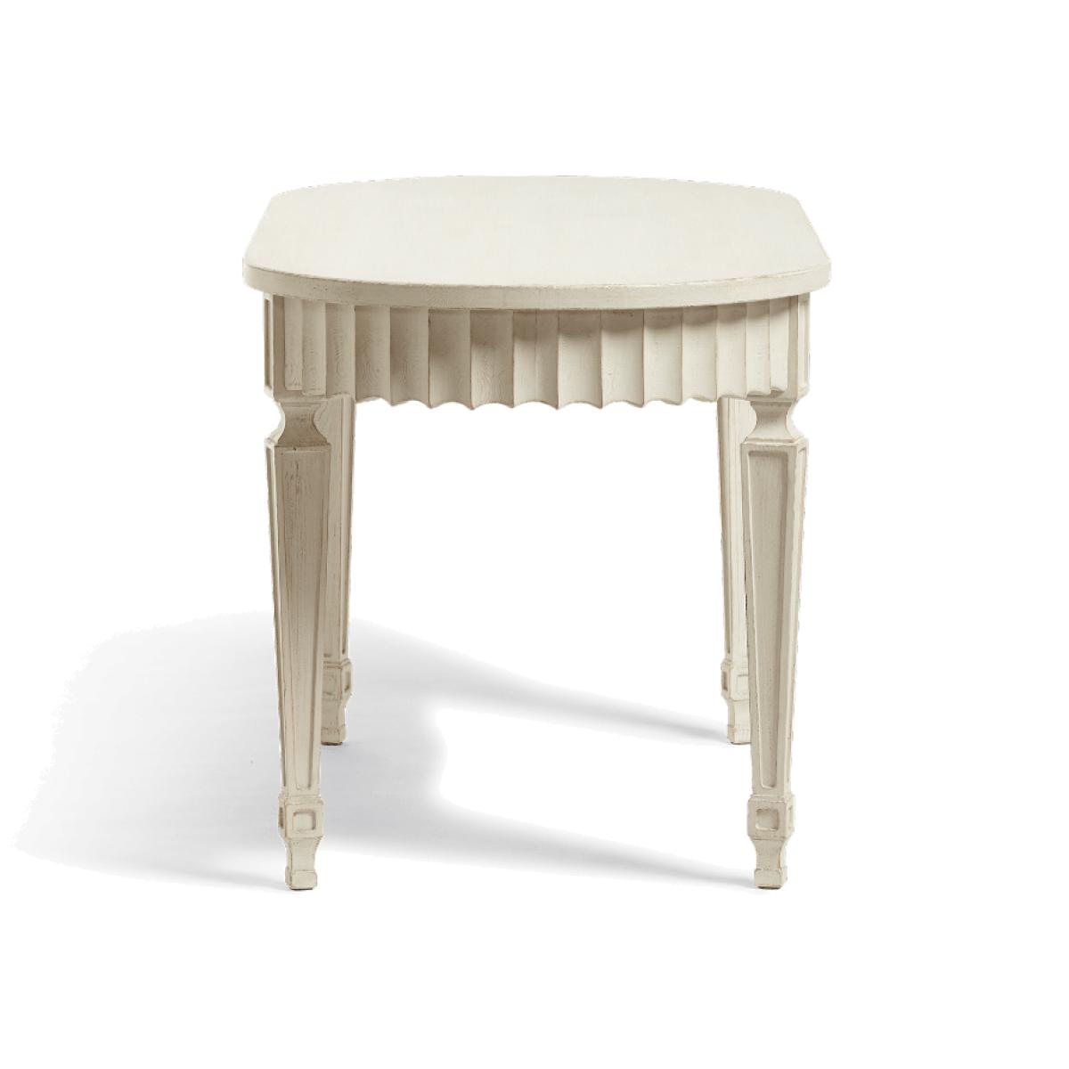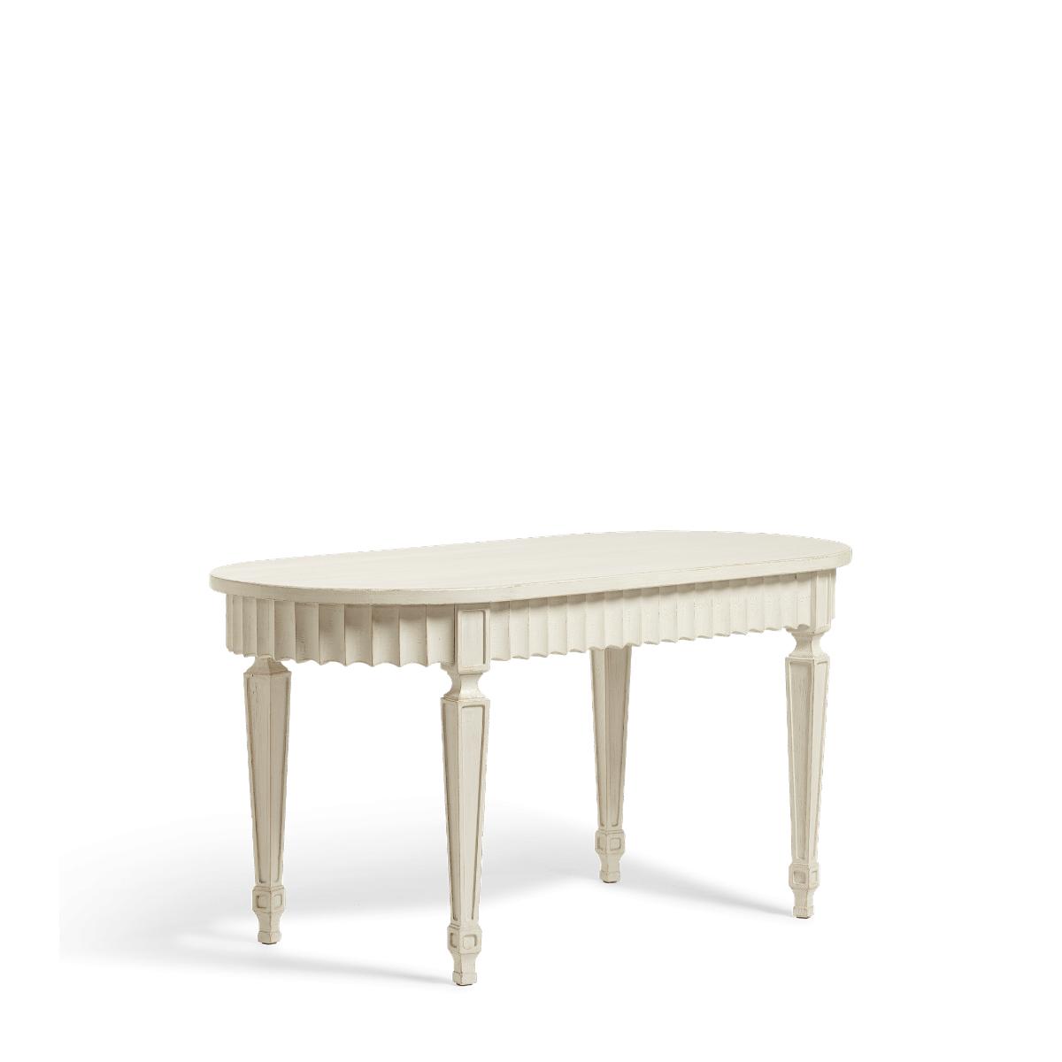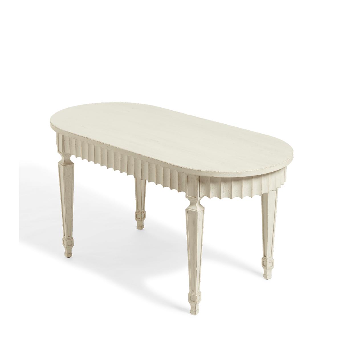 Seeking frills? Make space in your scheme for our antique Gustavian-inspired Ruffelen pieces. The collection comprises two dining tables (one extendable, one oval) and a matching console table – all of which are hand-painted a period-appropriate pale grey-green hue. Seating four, the oval-shaped table is a good fit for linear living spaces; its rounded finish feels soft and inviting, while its carved legs hit the right level of ornamental detail.