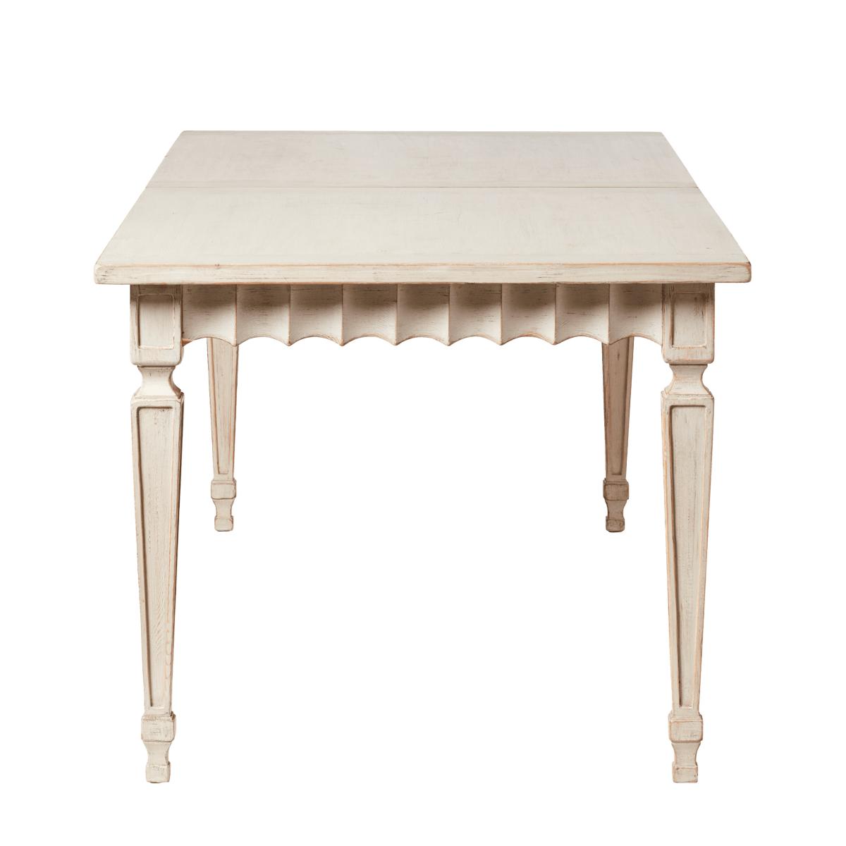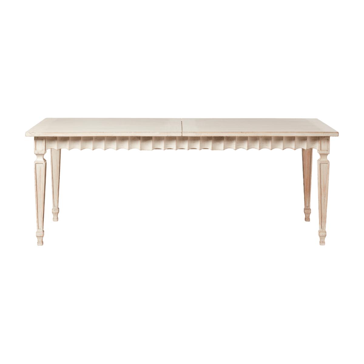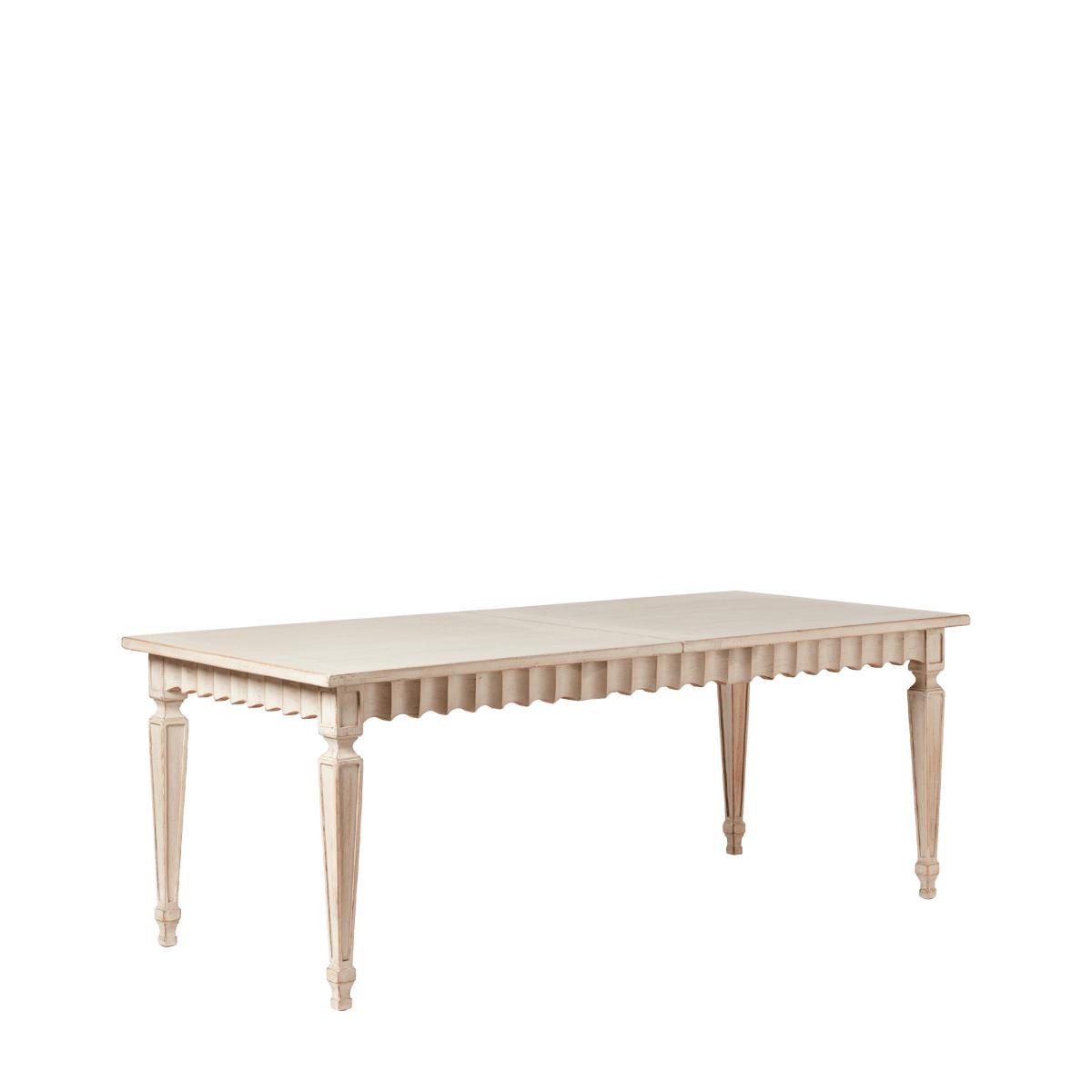 Seeking frills? Make space in your scheme for our antique Gustavian-inspired Ruffelen pieces. The collection comprises two dining tables (one extendable, one oval) and a matching console table – all of which are hand-painted a period-appropriate pale grey-green hue. Seating six to eight people, the extendable dining table is perfect for large households, as well as those that love hosting. Noteworthy details include tapered legs, a ruffle trim and a tabletop that opens to fit additional leaves.