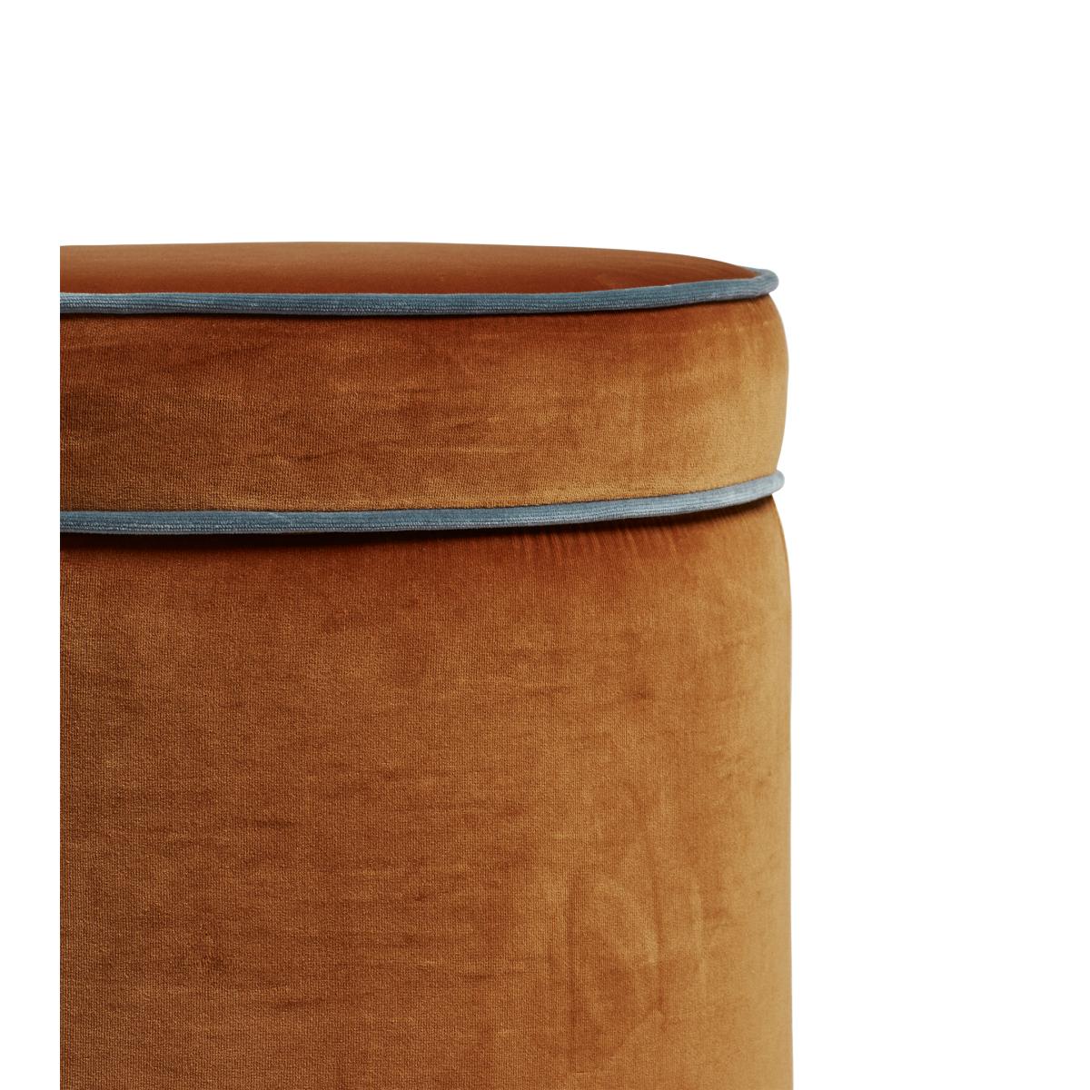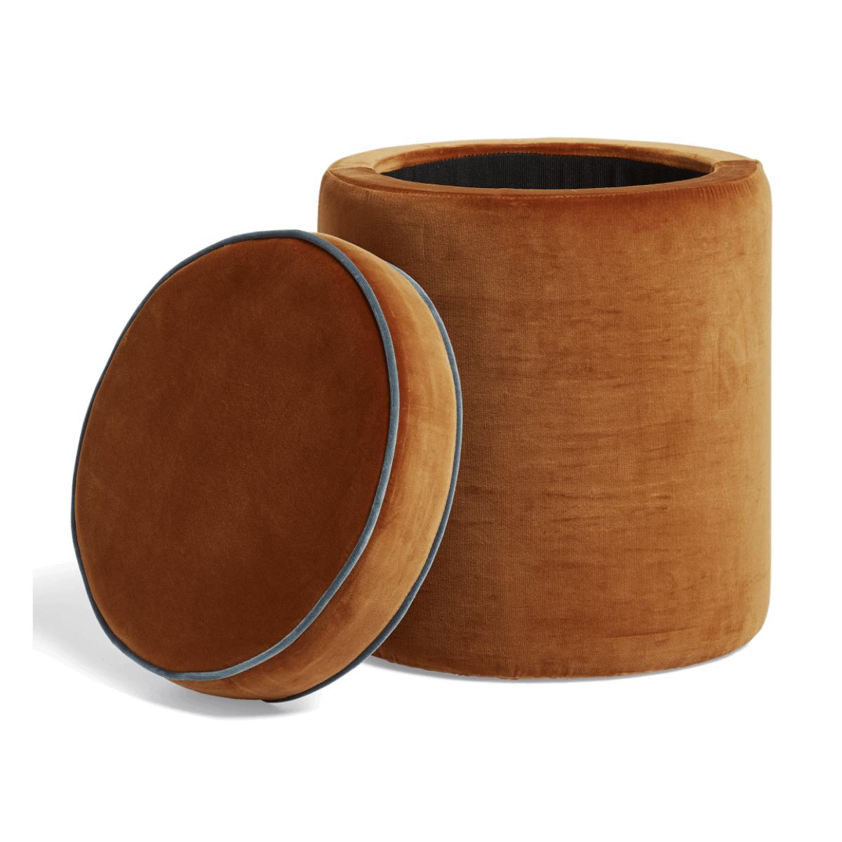 With a name meaning ‘secret’ in Tongan, the Samena is cleverly designed with hidden storage: its seat is a lid that lifts off and slots back in securely. Upholstered in Dirty Orange velvet, it’s finished with complementary Air Force Blue piping that disguises its seam while looking pretty.