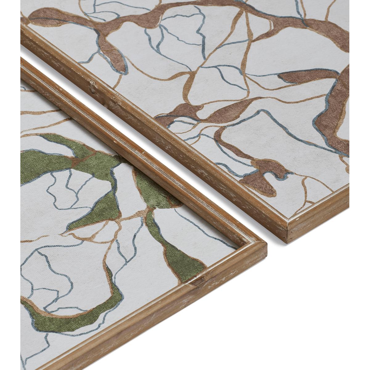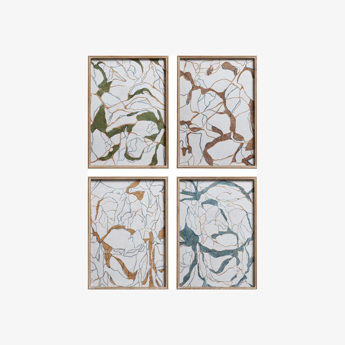 Our Ravina prints are abstract works of art that focus on line and contour. The meandering lines create spaces that are filled with warm, muted colours in a contemporary mosaic style that could blend into many different styles of interior. They work well as a set or, placed separately to draw the eye around the room. Framed in hand-distressed natural fir wood frames. Sold as a set of four.