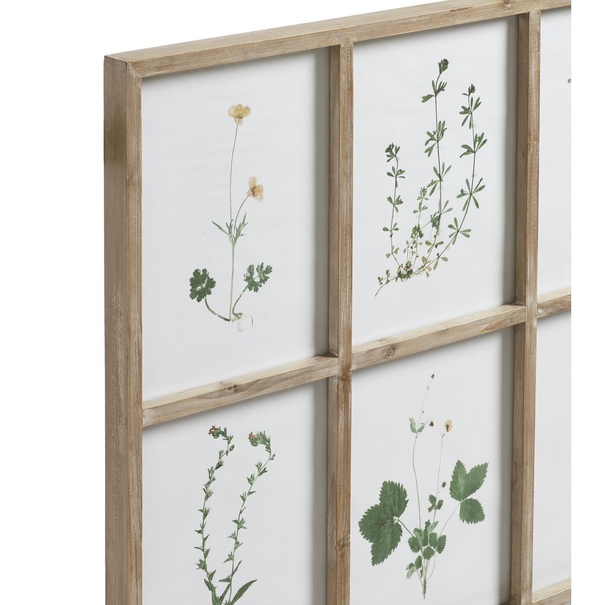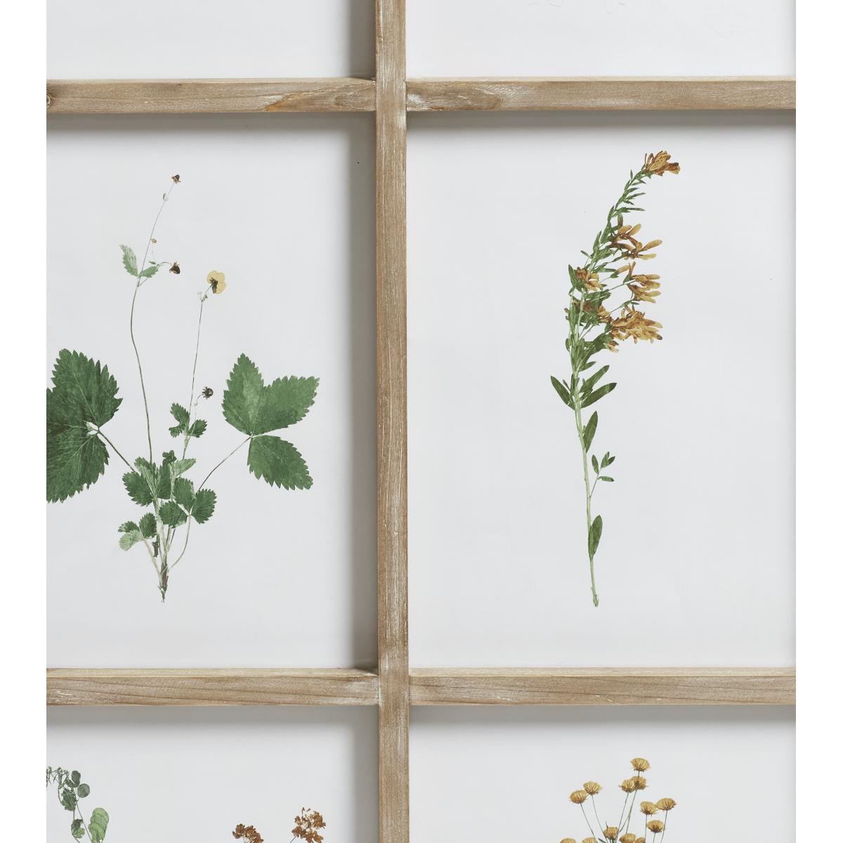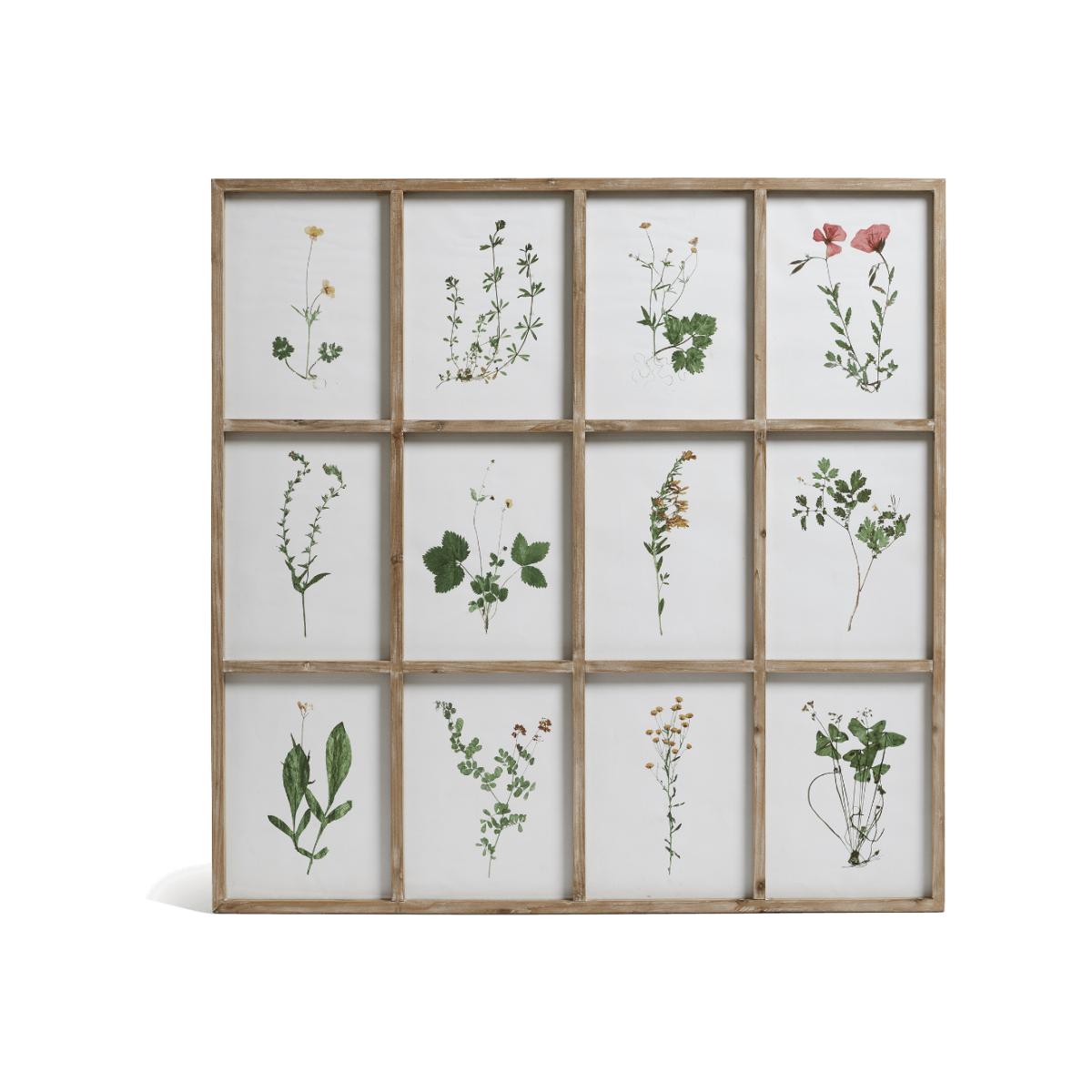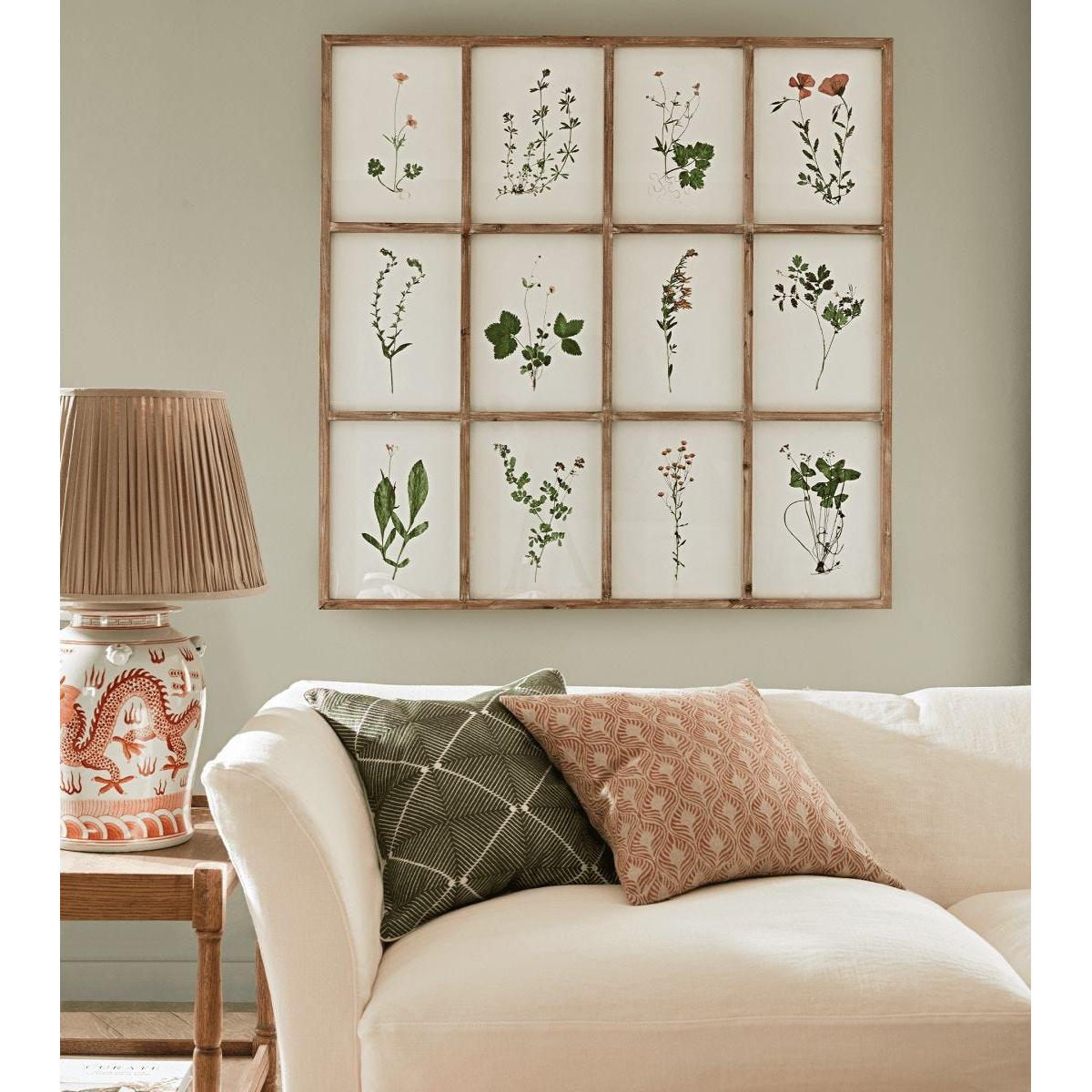 This hand-painted window-style fir wood frame showcases 12 pressed flower prints. There is a whimsical and wild touch to the piece, with each flower chosen for its delicate appearance and muted colour tones.