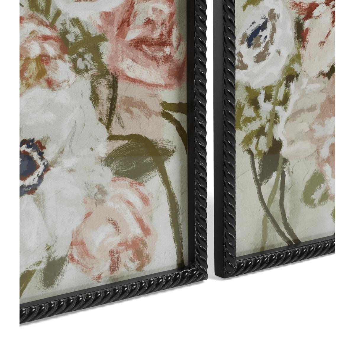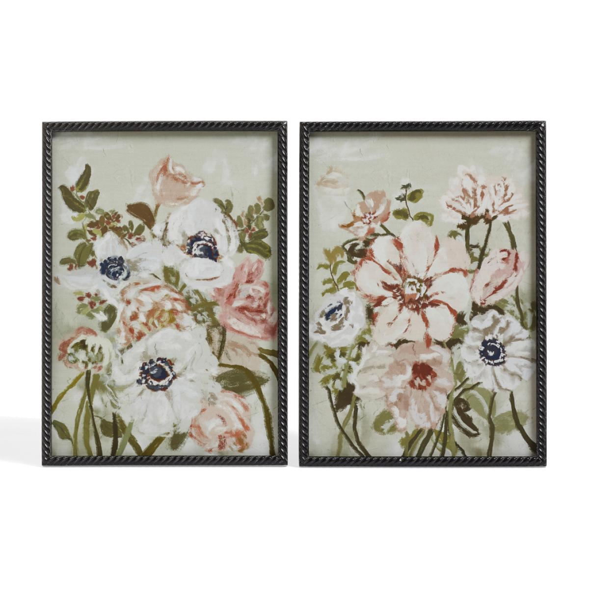 Our Elizabeth prints lean towards a more traditional style of artwork, mimicking floral paintings with their big blooms and visible brushstrokes. The pastel tones really pop with the touches of indigo that are reflected in the black of the hand-painted twisted frames.