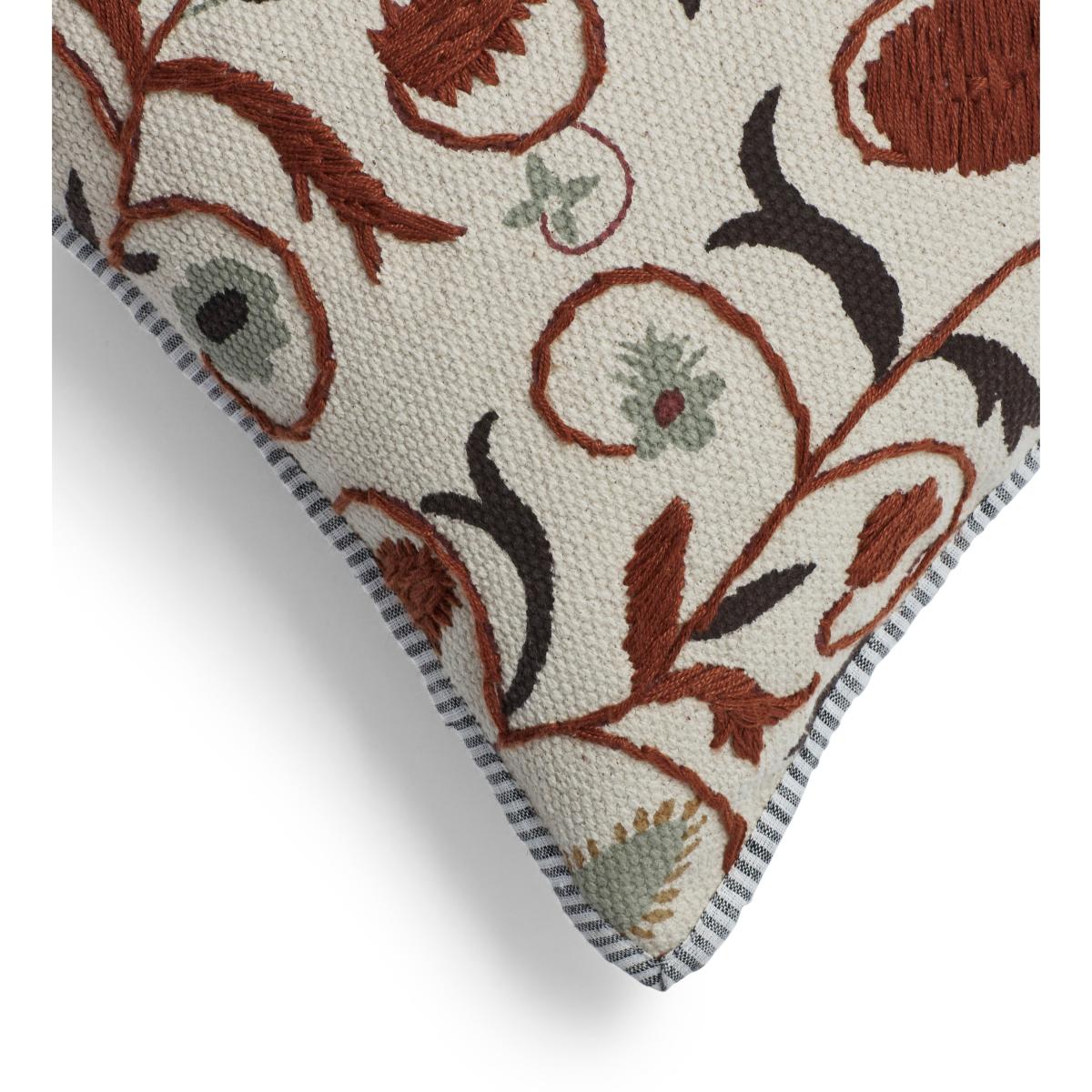 One of OKA’s Icons, the original Sheki design is inspired by antique Indian designs and was developed in partnership between Sue Jones, our co-founder and one of our longest standing manufacturing partners in Jaipur. The range now includes the square Sheki Cushion Cover with the distinctive pattern screen-printed and hand-embroidered on soft cotton in an earthy-red colourway. Striped linen on the reverse adds further interest and style.