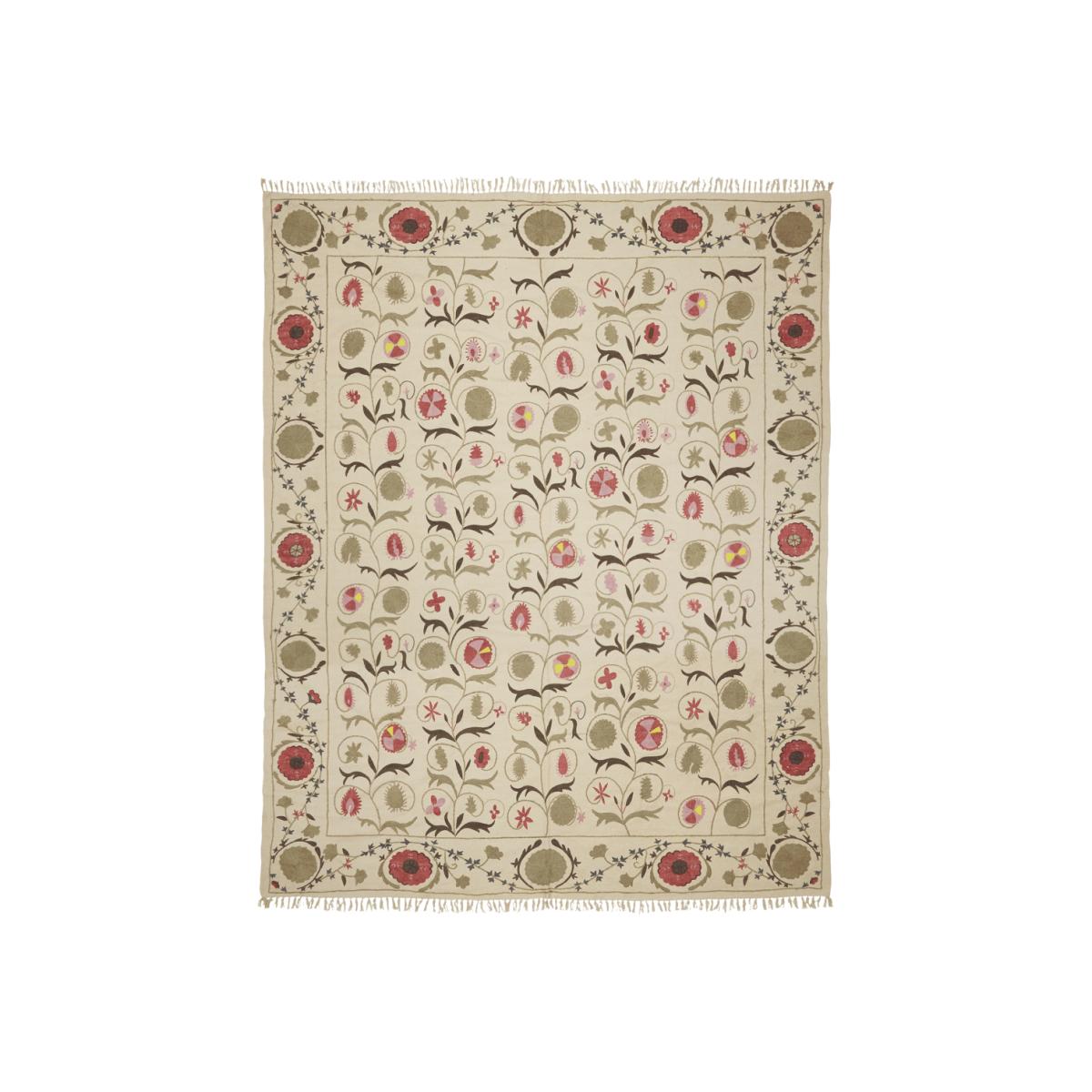 A natural-colored rug with an abstract floral design and olive-toned accents. The stitches from the intricate hand-embroidery are visible when you turn over one of the corners of the rug.