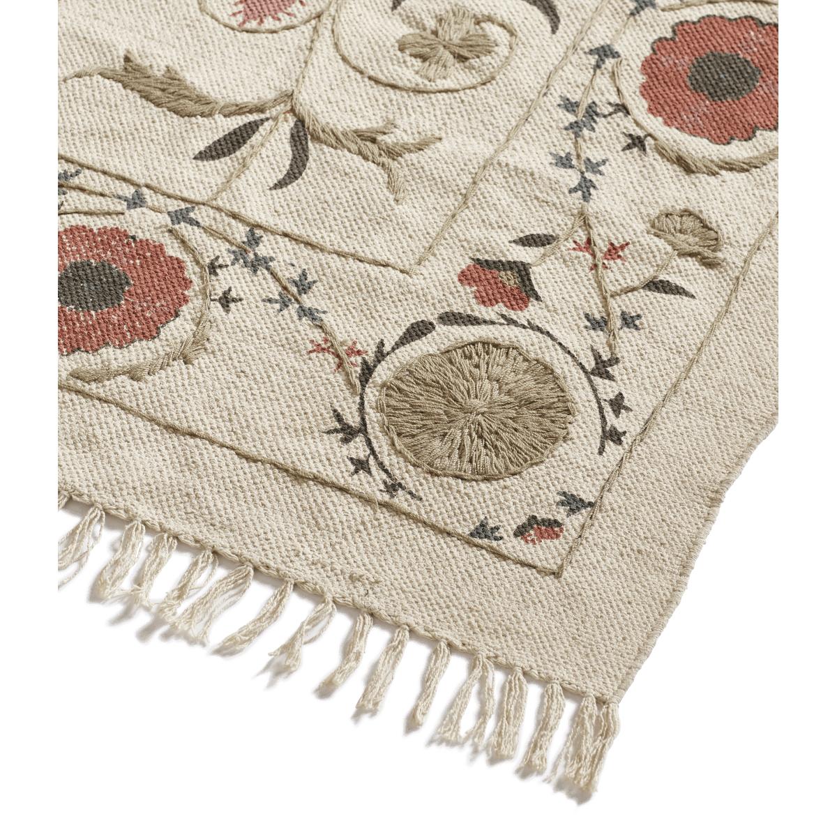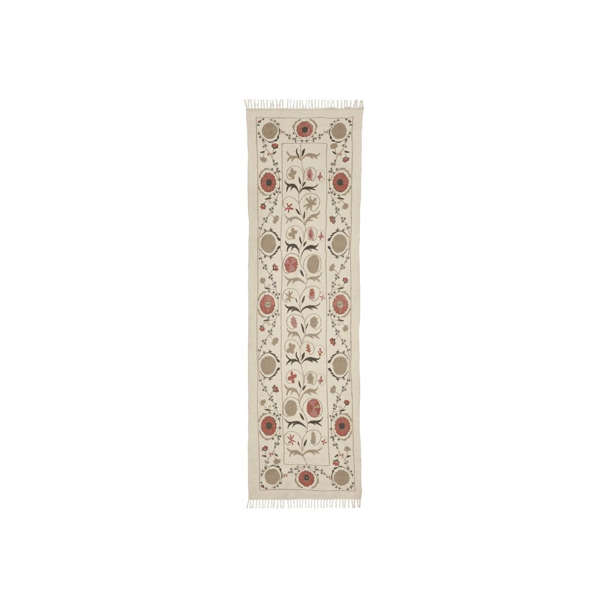 A natural-coloured, hand-knotted runner, crafted carefully from wool. Turn over a corner of the traditional floral design and you'll see the full extent of the work that goes into each rug; the stitches from the intricate hand embroidery are visible on the reverse. Due to the artisanal crafting process, each piece will have individual characteristics and no two pieces will be the same.