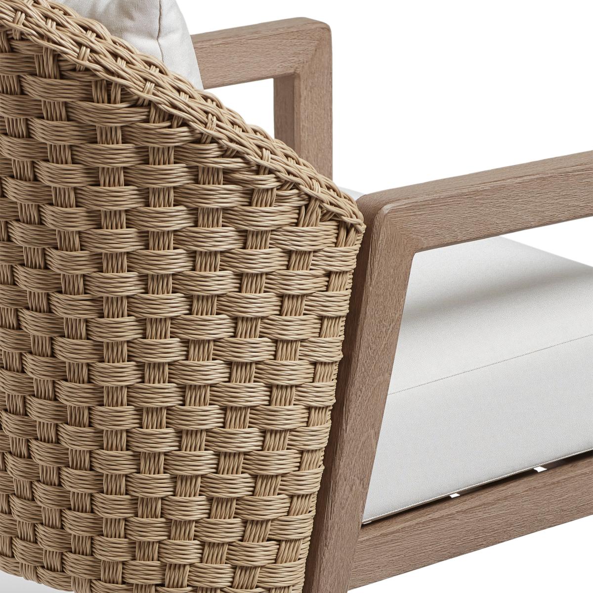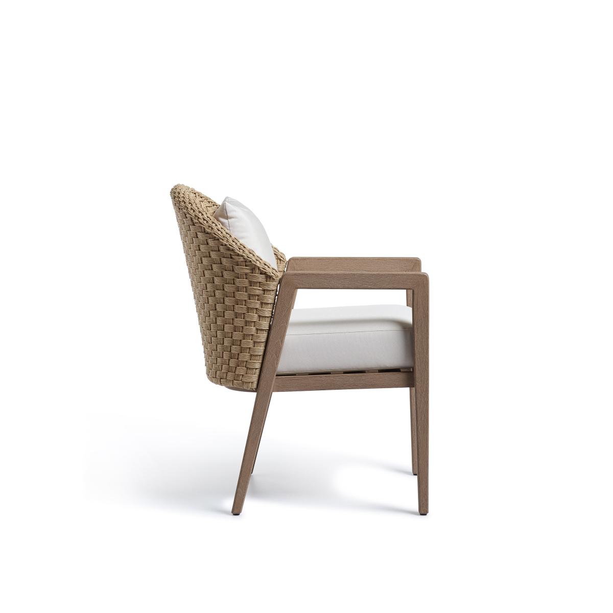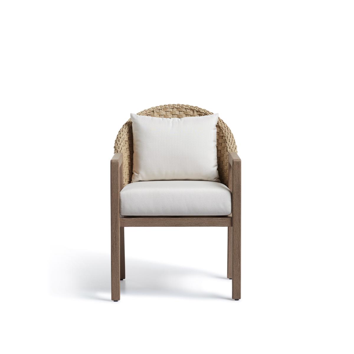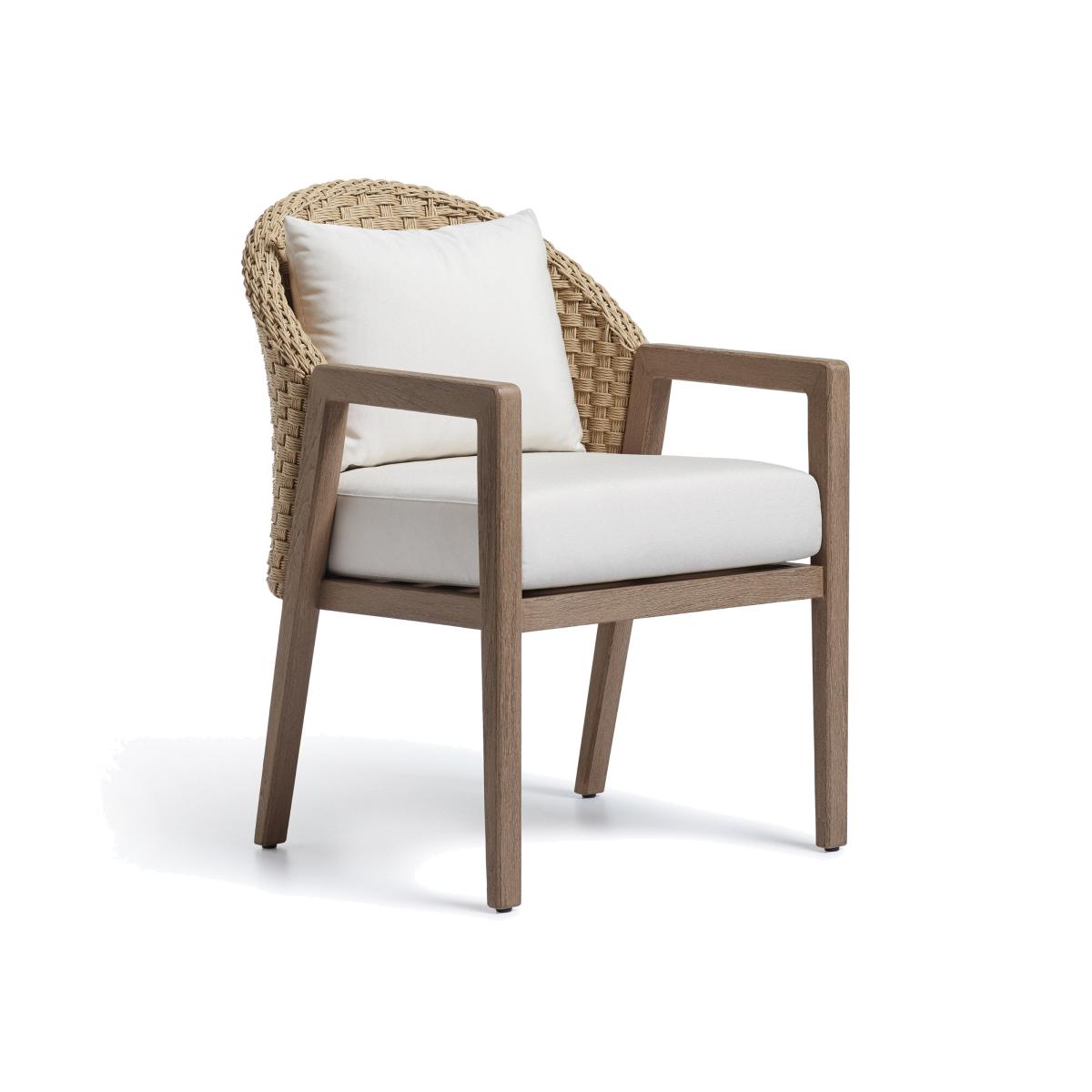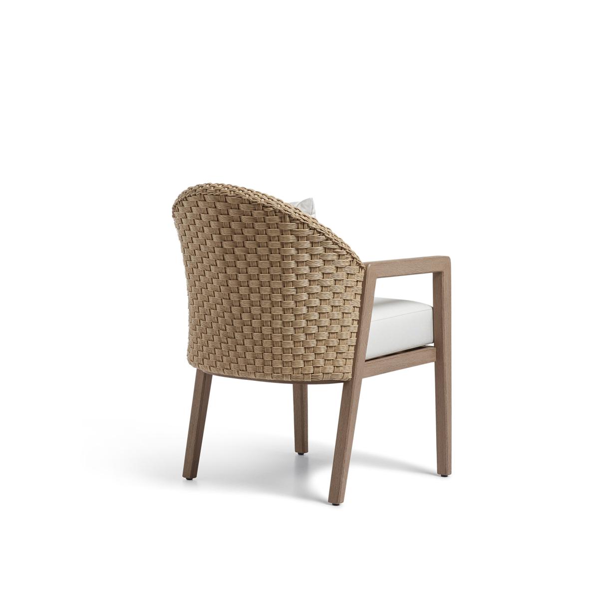 The graceful curves of the Shorwell Garden Dining Chair are hand constructed from two of garden furniture's best materials; teak and synthetic rattan. The chair base is topped with a dense seat cushion and a back cushion for extra comfort.