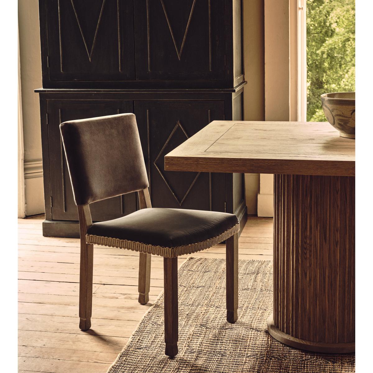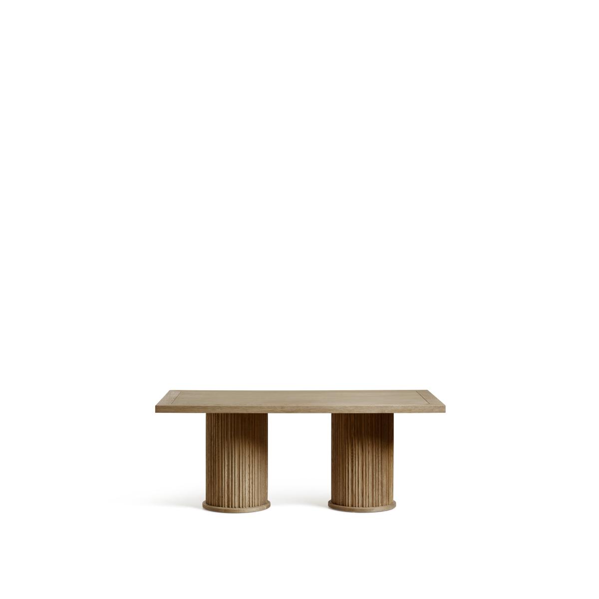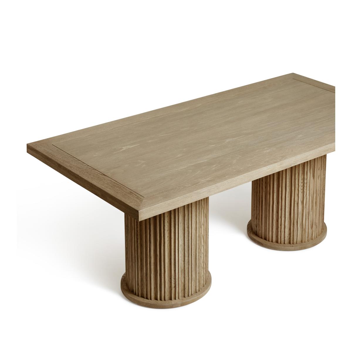 Our Marcus Dining Table features a smart, fluted column base. This is the smallest of our three rectangular versions, though it is also available in two round variations. Round tables create a more intimate experience while the linear version is a more traditional choice. All the tops feature an indentation that frames the edge, drawing attention to the character in the textured grain of the oak. This version comes in a light Weathered Oak, but it is also available in a warm Burnt Oak finish.
