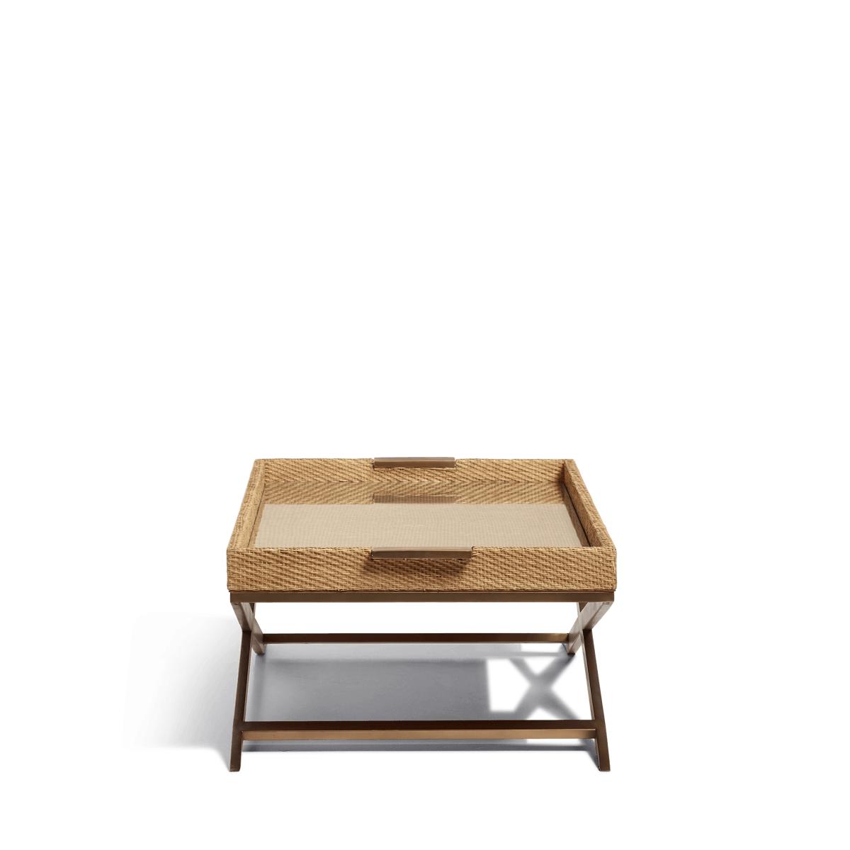 Inspired by the classic Butler’s tray, the Sovannah Coffee Table features a rattan top in a wicker weave, sat upon a brass-finished frame. The rattan is coated and topped with a glass panel that protects it from spills and provides a stable surface – perfect for resting drinks.