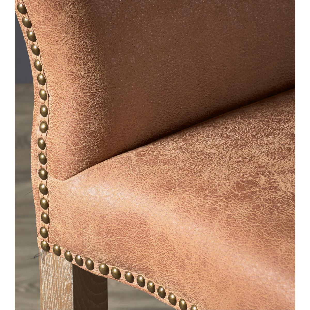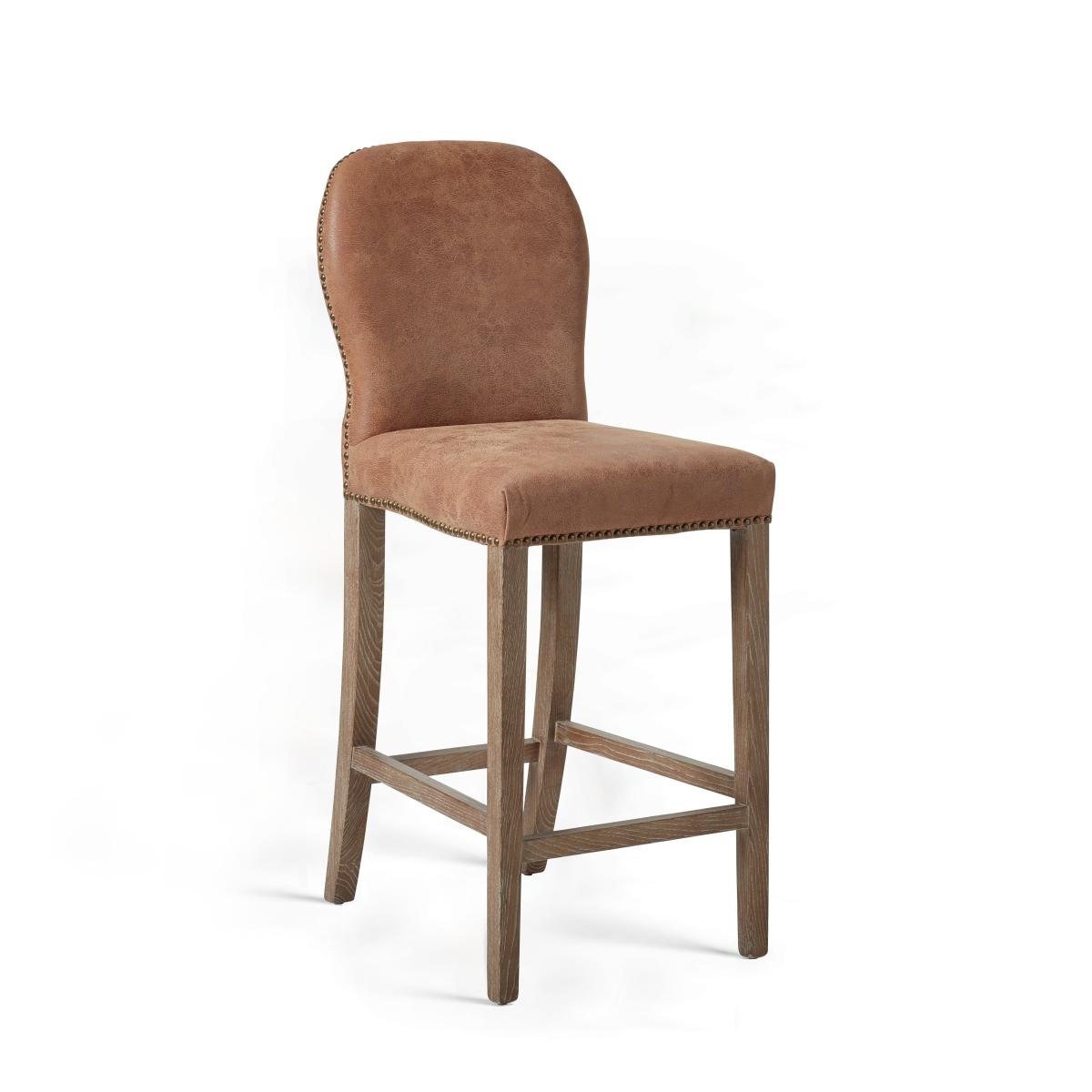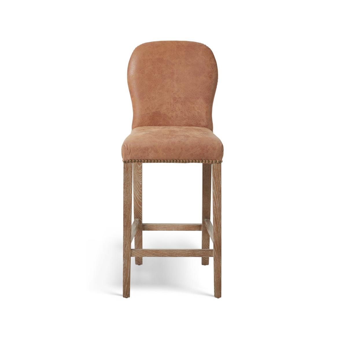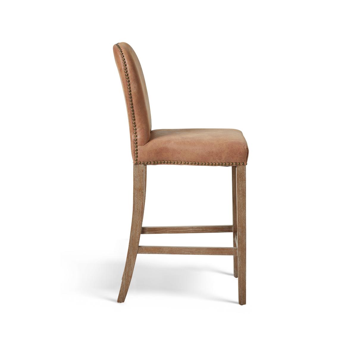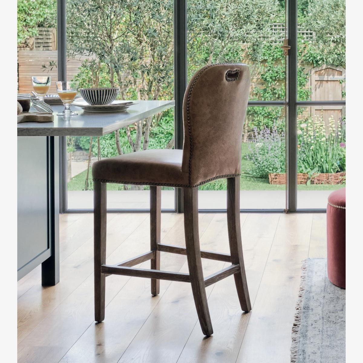 The Stafford Dining Chair has been an OKA best seller ever since it launched in 2015. It was created by Annabel Astor, when she was unable to find the perfect upholstered dining chair. Every season, we reimagine this classic chair in new ways, introducing different colours and finishes to the range. Given the popularity of kitchen islands and home bars, it made perfect sense to develop a matching Stafford Stool. Our bar chair features the same stained oak wood legs, comfortable backrest and stud detailing, but it is fixed at worktop height and includes a useful footrest. This version features warm Aged Tobacco leather. Every element of the stool, from each metal stud hammered into place by hand to the real leather upholstery and stained legs, will result in the stool having individual character.
