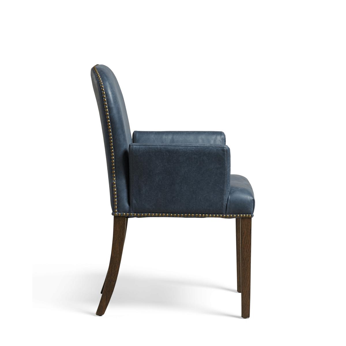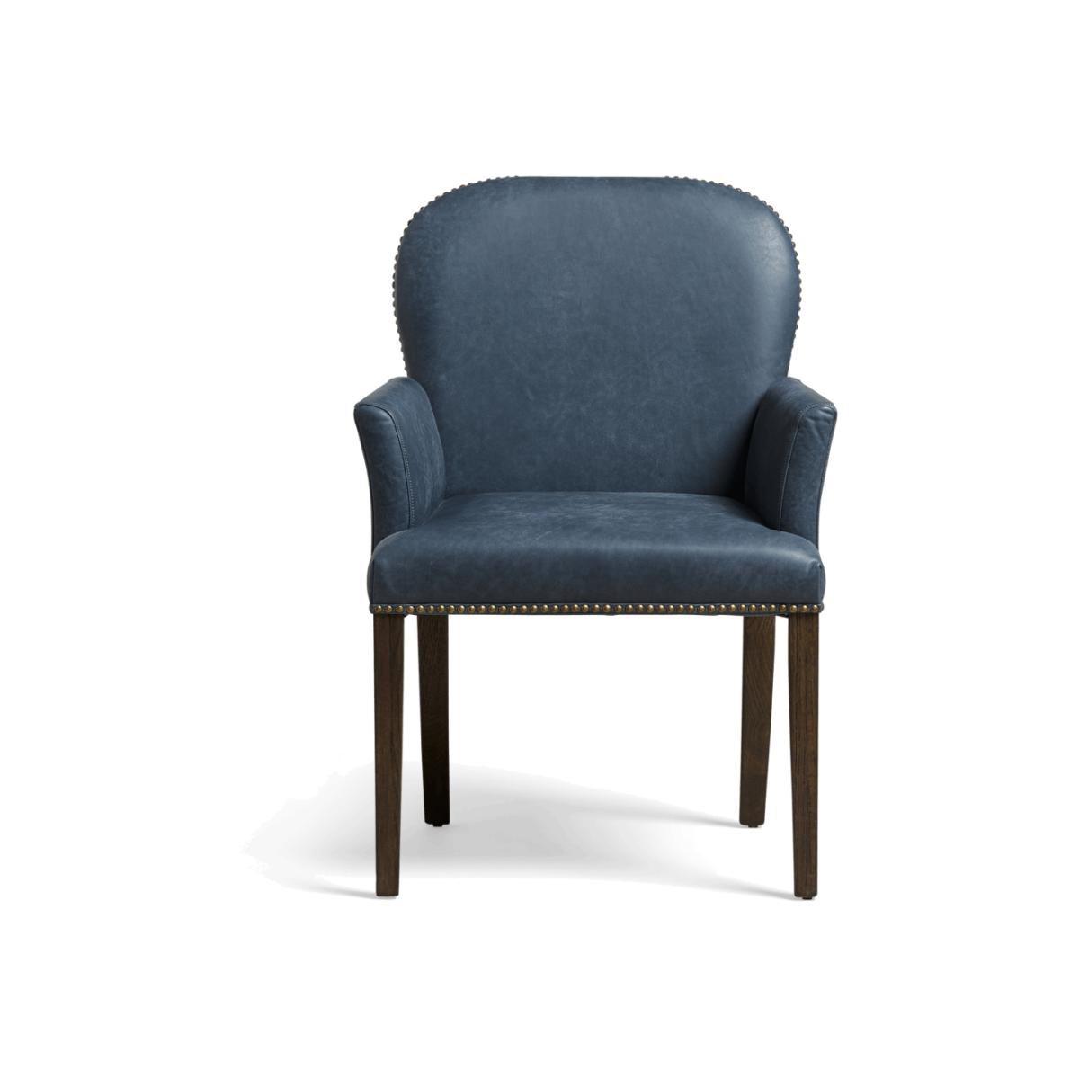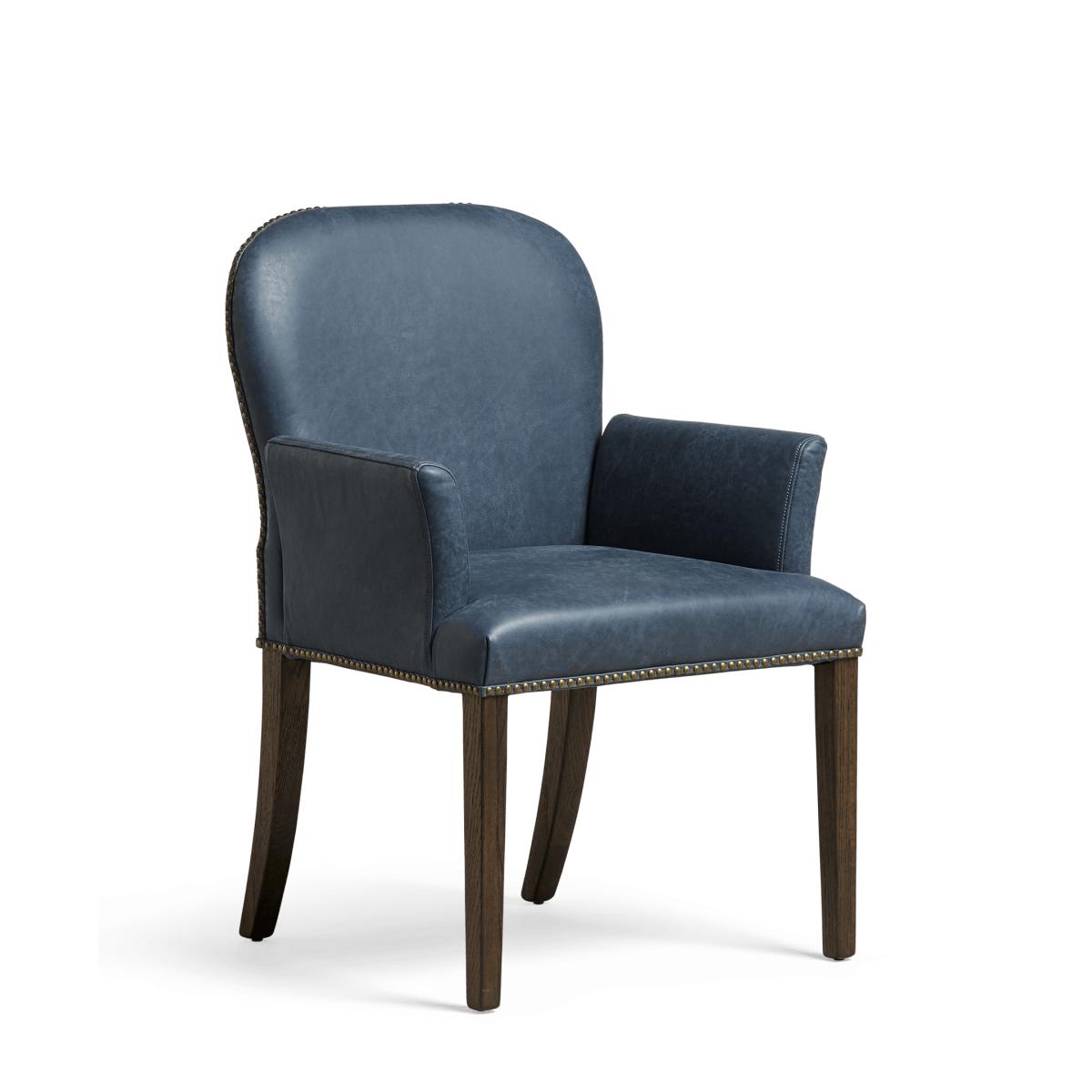 Pair your classic Stafford Dining Chairs with this matching seat, which features gently curved arms for even greater comfort as you while away time with loved ones. As with the rest of the Stafford range, this armchair is finished with brass studding and has a handle crafted into the back to make it easy to move and manoeuvre around the dining table. This version features China Clay cream-coloured leather upholstery. Every element of the chair, from each metal stud hammered into place by hand to the real leather upholstery and stained legs, will result in the chair having individual character.