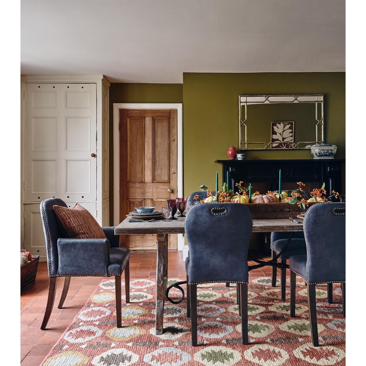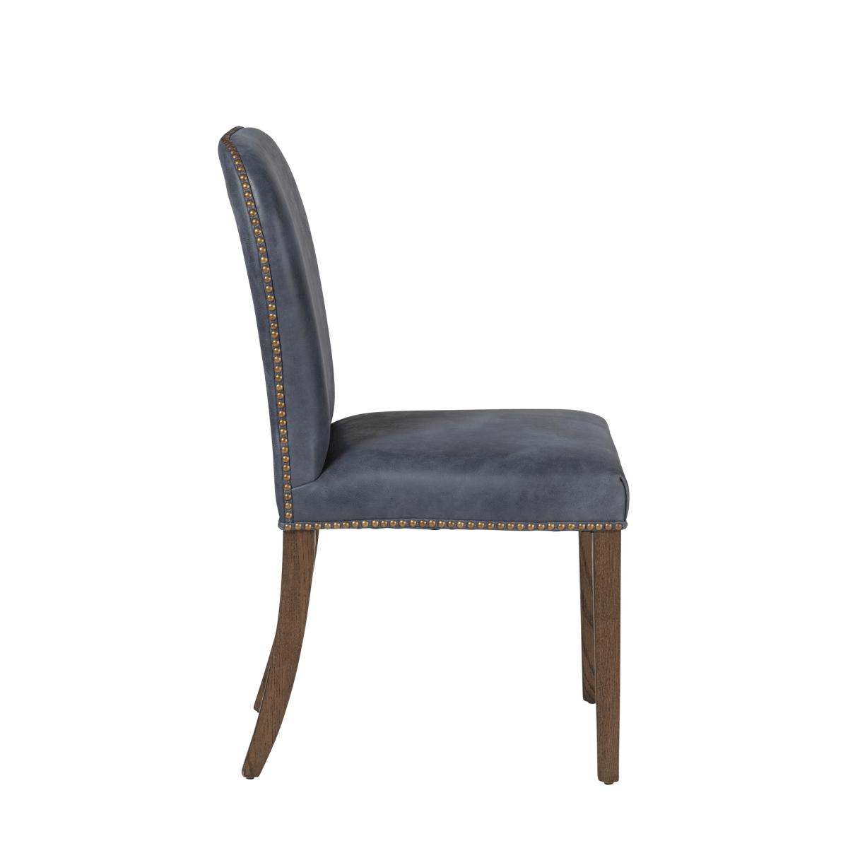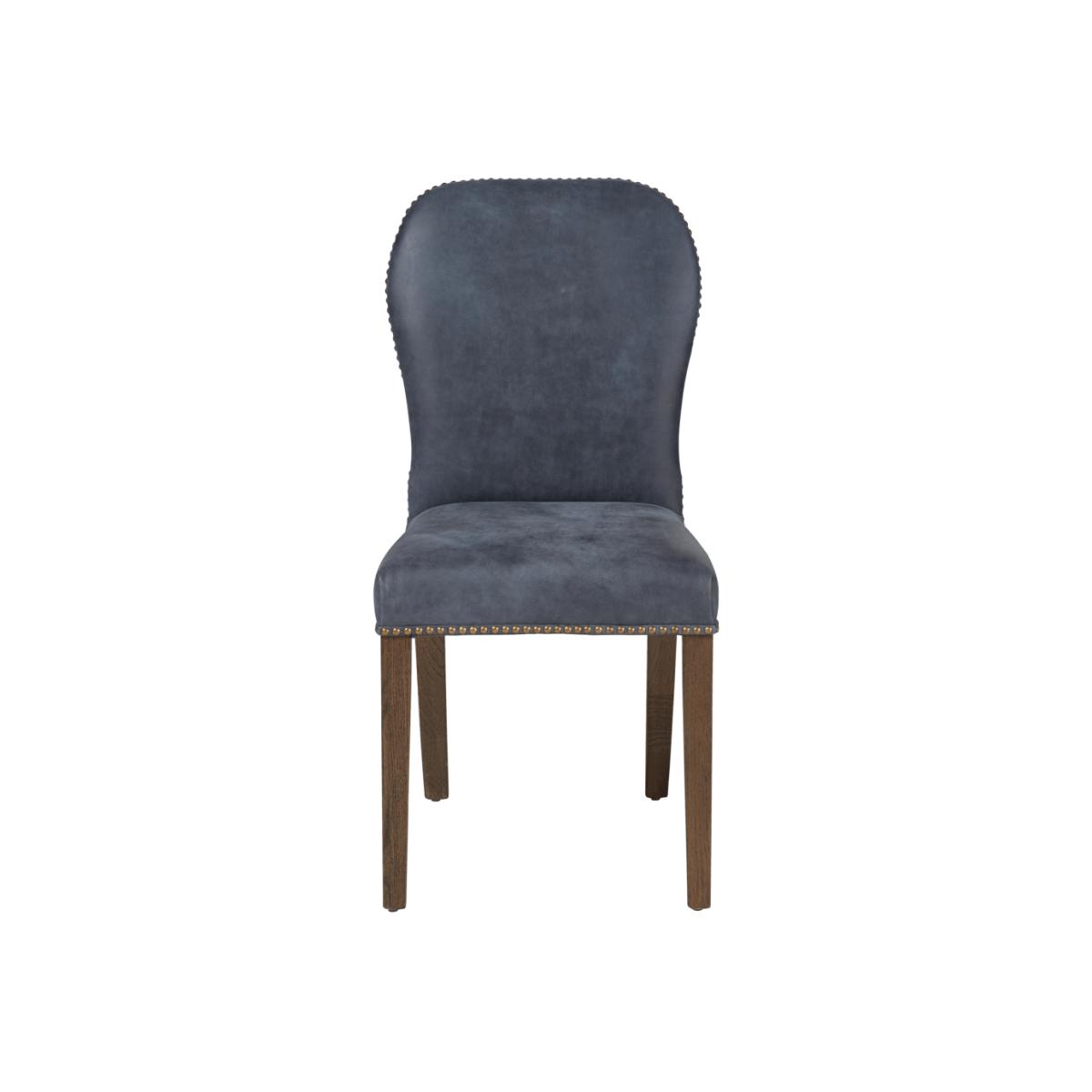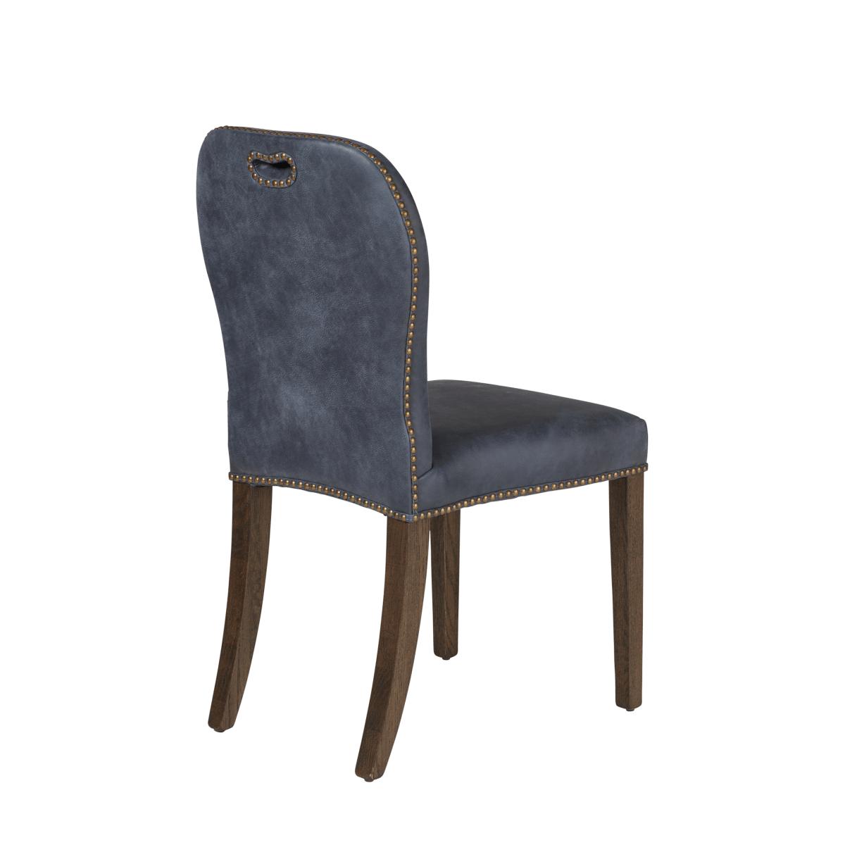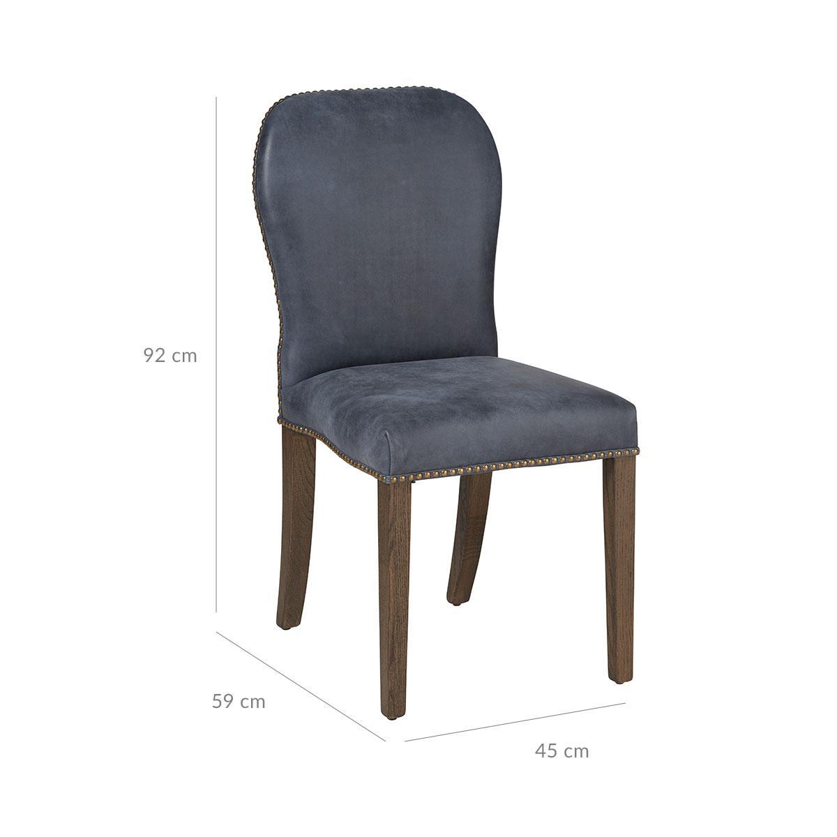 Our Stafford Dining Chair was created by Annabel Astor, when she was unable to find the perfect upholstered dining chair. Designed with a sleek, narrow silhouette, they allow you to get more of them around the table, but still deliver superior comfort. Other unique features include a border of brass-coloured studs and a back pull, adding interest to both aspects of the chair. This version features a sophisticated Smoke Blue leather. Every element of the chair, from each metal stud hammered into place by hand to the real leather upholstery and stained legs, will result in the chair having individual character.