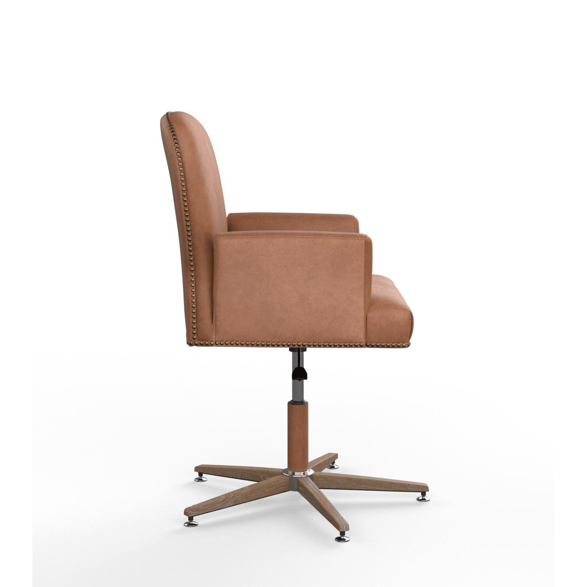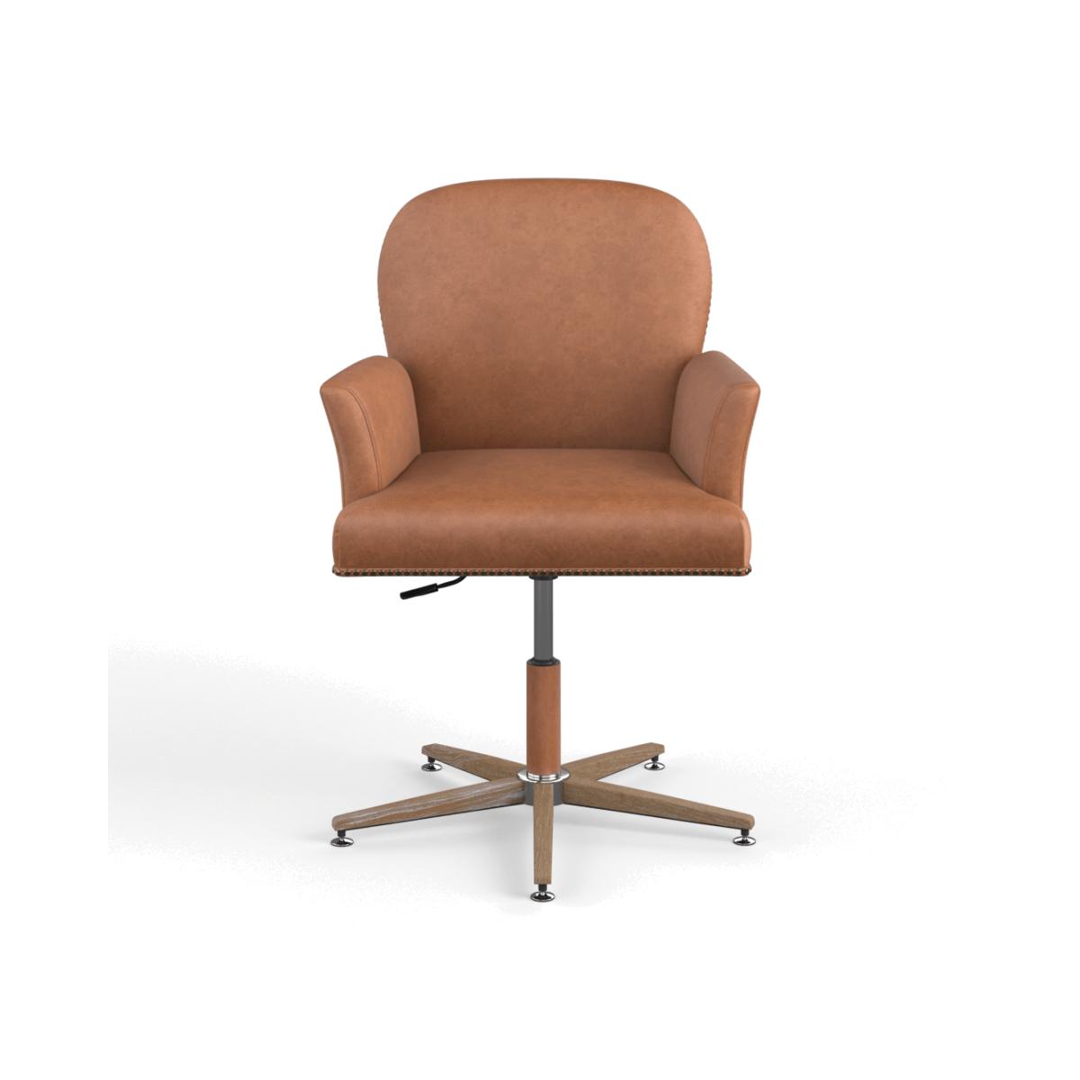 Our iconic Stafford Chair, originally designed by co-founder Annabel Astor for dining, has been reimagined as the perfect perch for office spaces. With a swivelling base, you can spin 360 degrees while retaining the sophisticated Stafford style – from the decorative studding to the sloping arms and the Hazelnut Brown leather finish. Not only does it come with a built in lever for adjusting the height, but you can also alter the base so that it sits on glides to stand still, or wheels for mobility. Once the chosen feet are installed, they can not be removed.