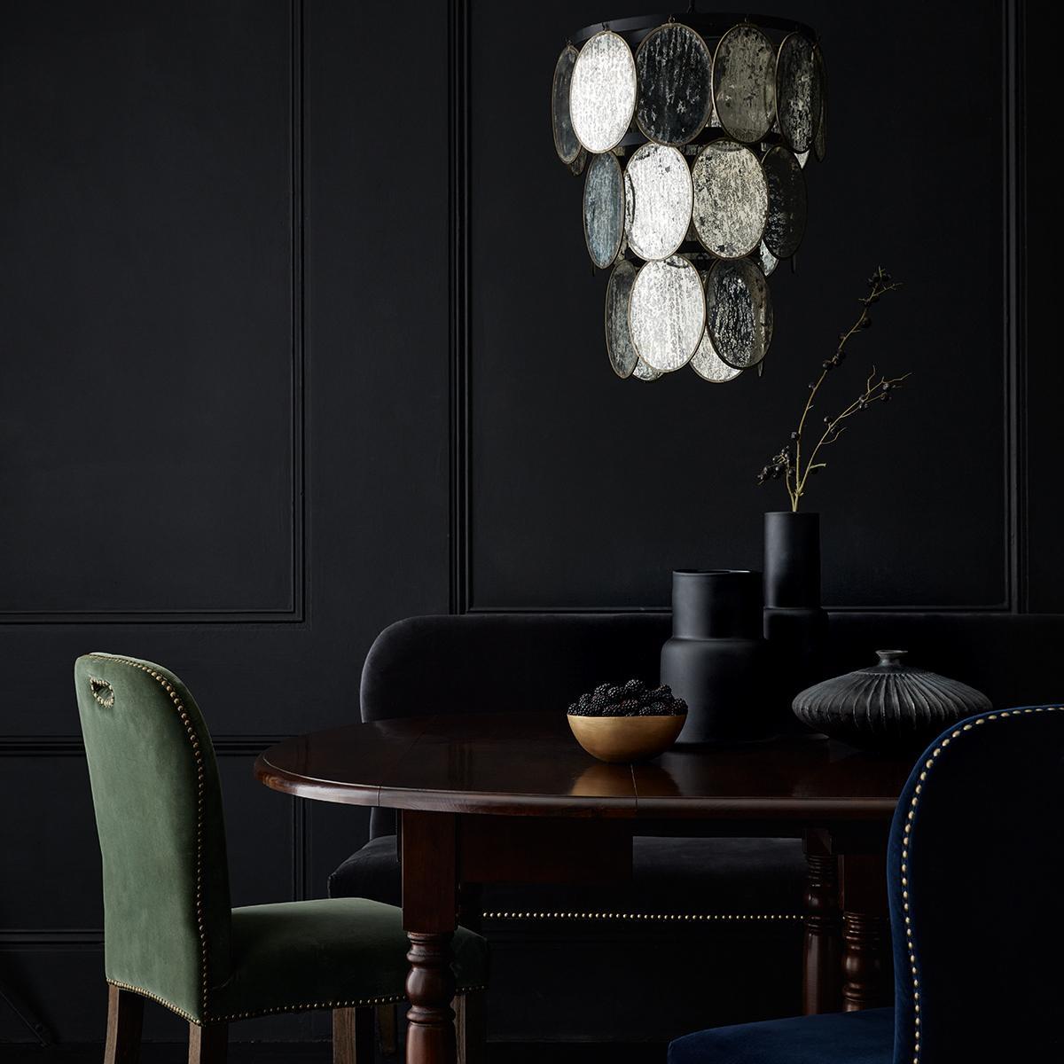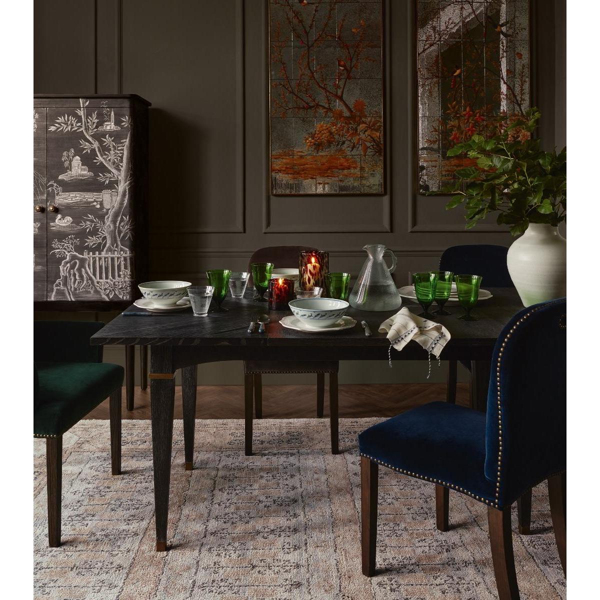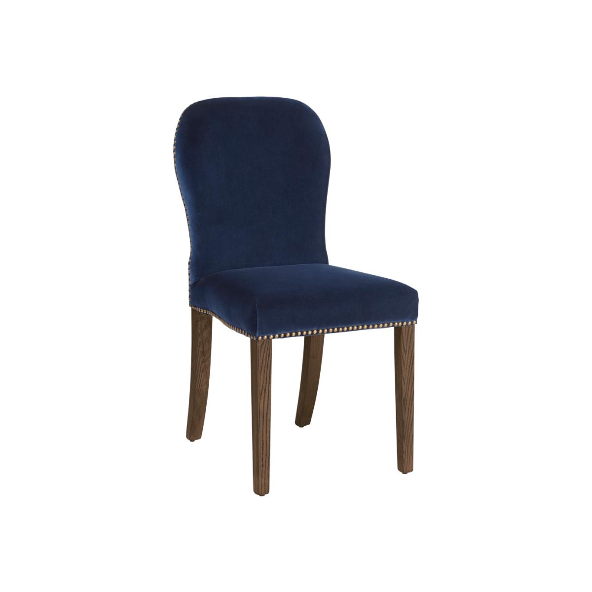 Our Stafford Dining Chair in Perfect Navy velvet was created by Annabel Astor herself when she was unable to find the perfect upholstered dining chair. Designed with a sleek, narrow silhouette, they allow you to get more of them around the table, but still deliver superior comfort. Other unique features include a border of brass-coloured studs and a back pull. Every element of the chair, from each metal stud hammered into place by hand to the velvet pile and stained legs, will result in the chair having individual character.
