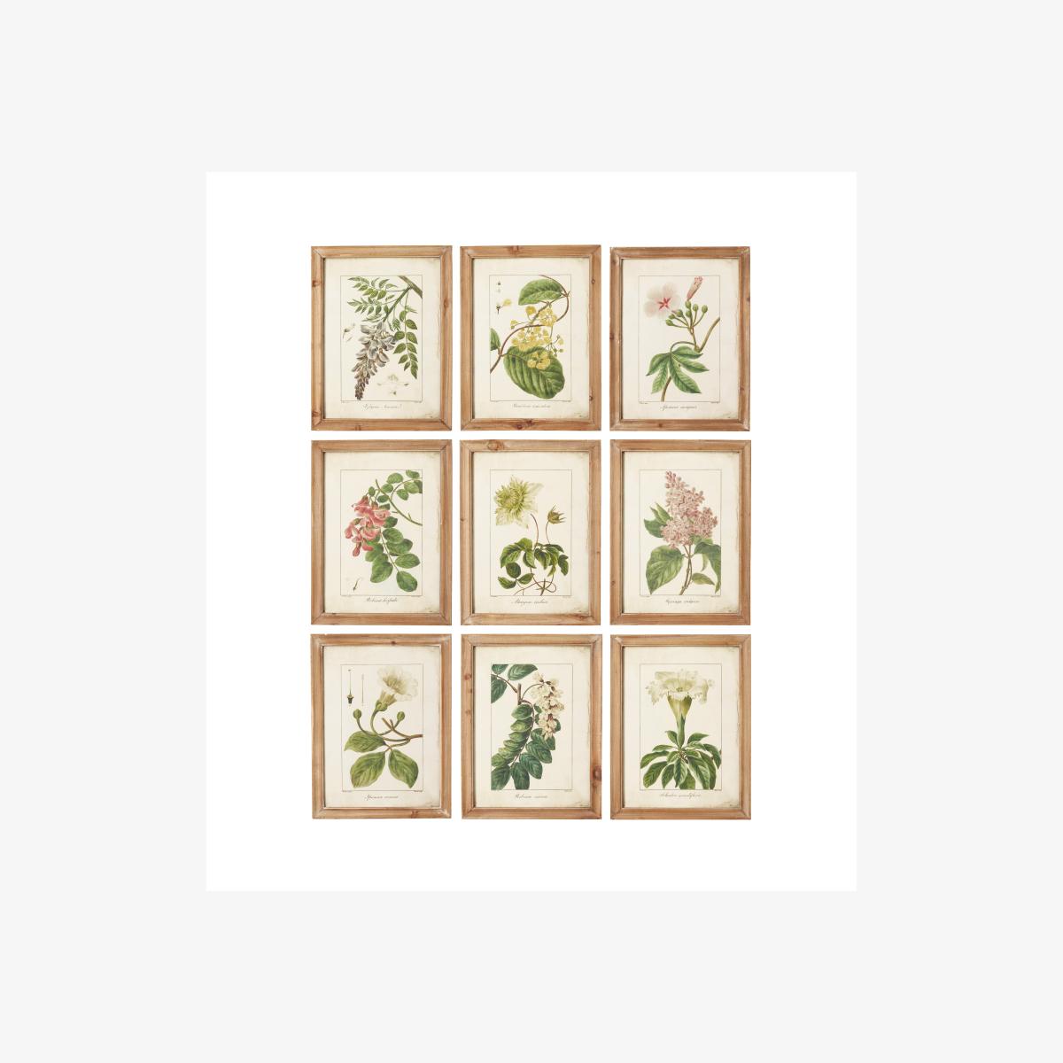 A set of nine framed prints, based on 19th-century scientific illustrations, each of these wood-framed images - which are printed on antique-effect paper, and identified with their Latin names beneath - features a different flower or plant. Flower varieties shown include lilac, rose acacia, clematis and chalice vine. Hung together, they make a striking display of wall art in a country home, but these pieces are equally effective combined with other art work, or even seen individually.