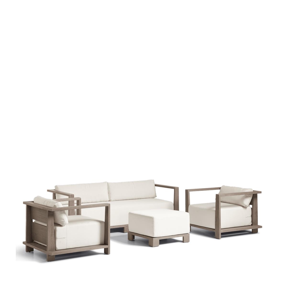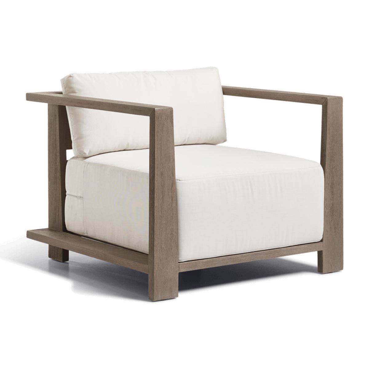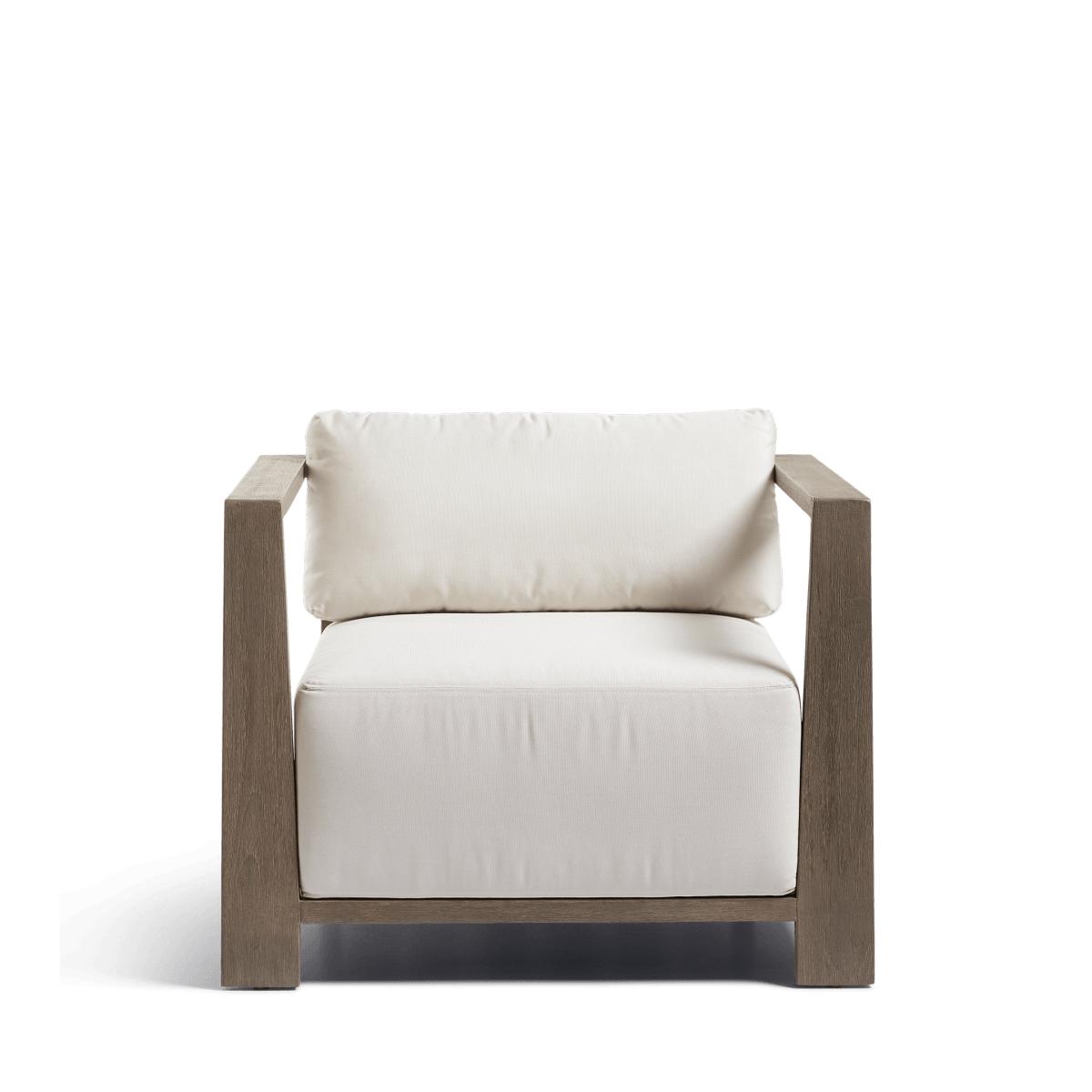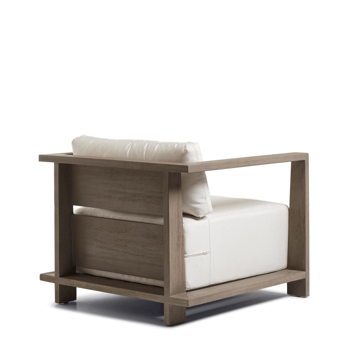 Our Swanmore Garden Armchair is sleek and modern with its angular wooden frame. It is formed from teak, which is a dense wood high in natural oils that makes it strong, durable and weather resistant. The usually smooth wood is wire brushed and hand painted for an authentic weathered wood appearance. Topped with weather-resistant cushions, the armchair couldn’t be more comfortable. Due to the natural materials and artisanal finishing process, each piece may have individual characteristics.