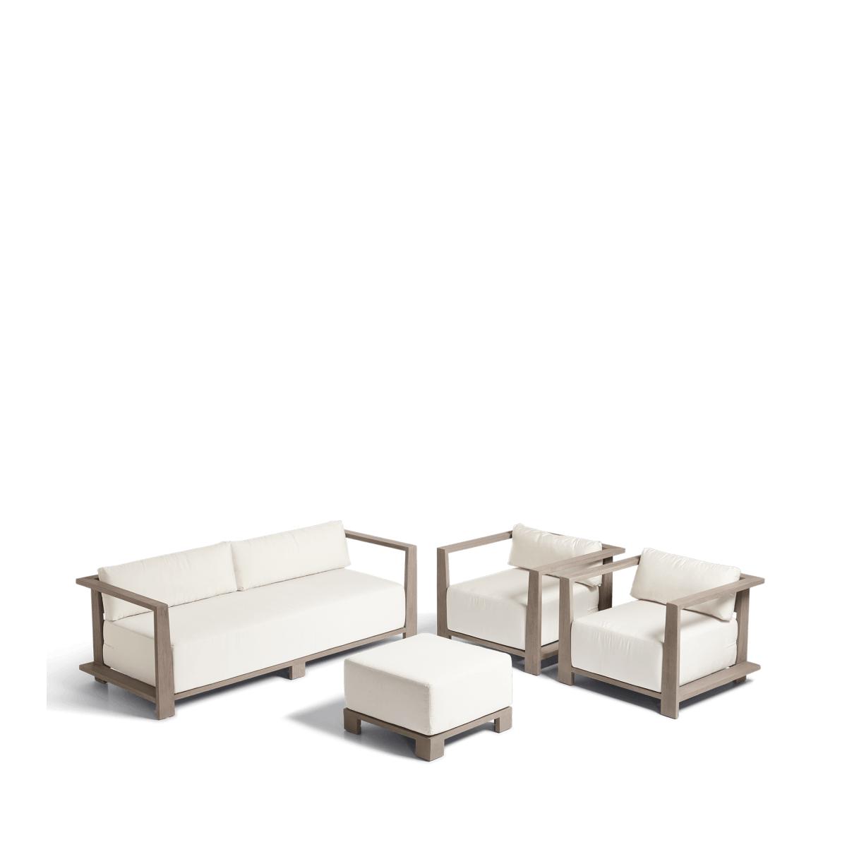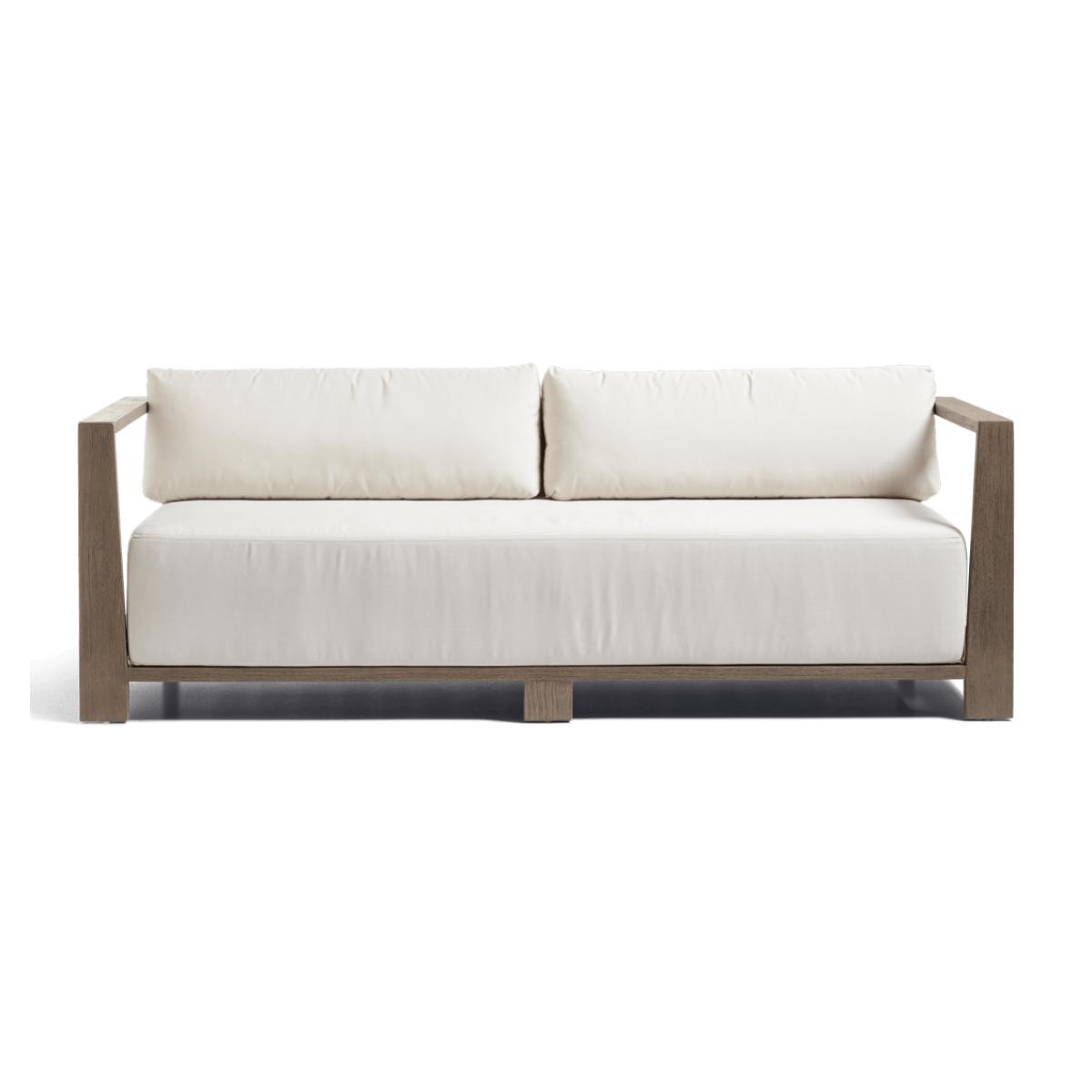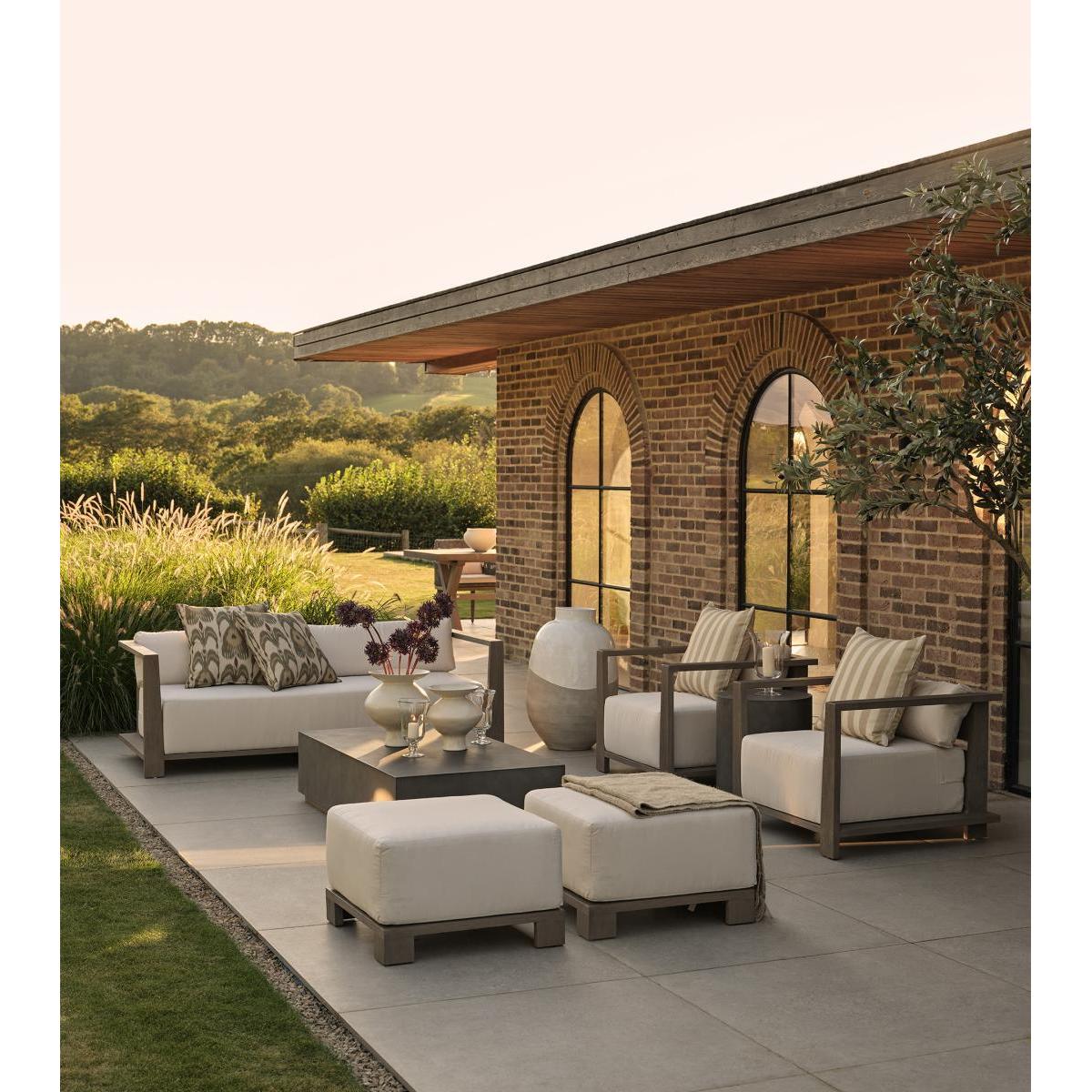 Our Swanmore Garden Sofa is sleek and modern with its angular wooden frame. It is formed from teak, which is a dense wood high in natural oils that makes it strong, durable and weather resistant. The usually smooth wood is wire brushed and hand painted for an authentic weathered wood appearance. Topped with weather-resistant cushions, the sofa couldn’t be more comfortable. Pair it with the Swanmore Garden Ottoman to form an L-shaped sofa. Due to the natural materials and artisanal finishing process, each piece may have individual characteristics.