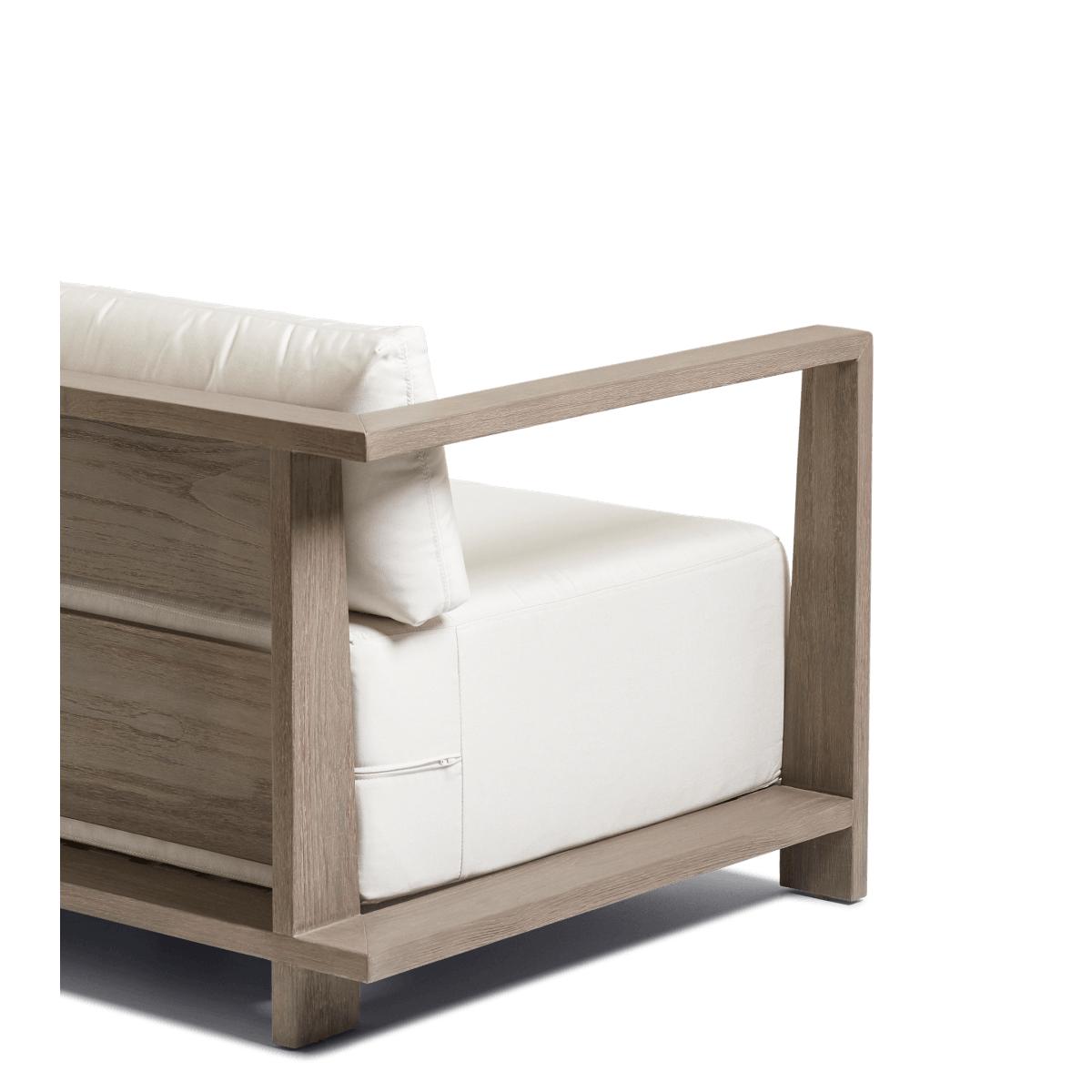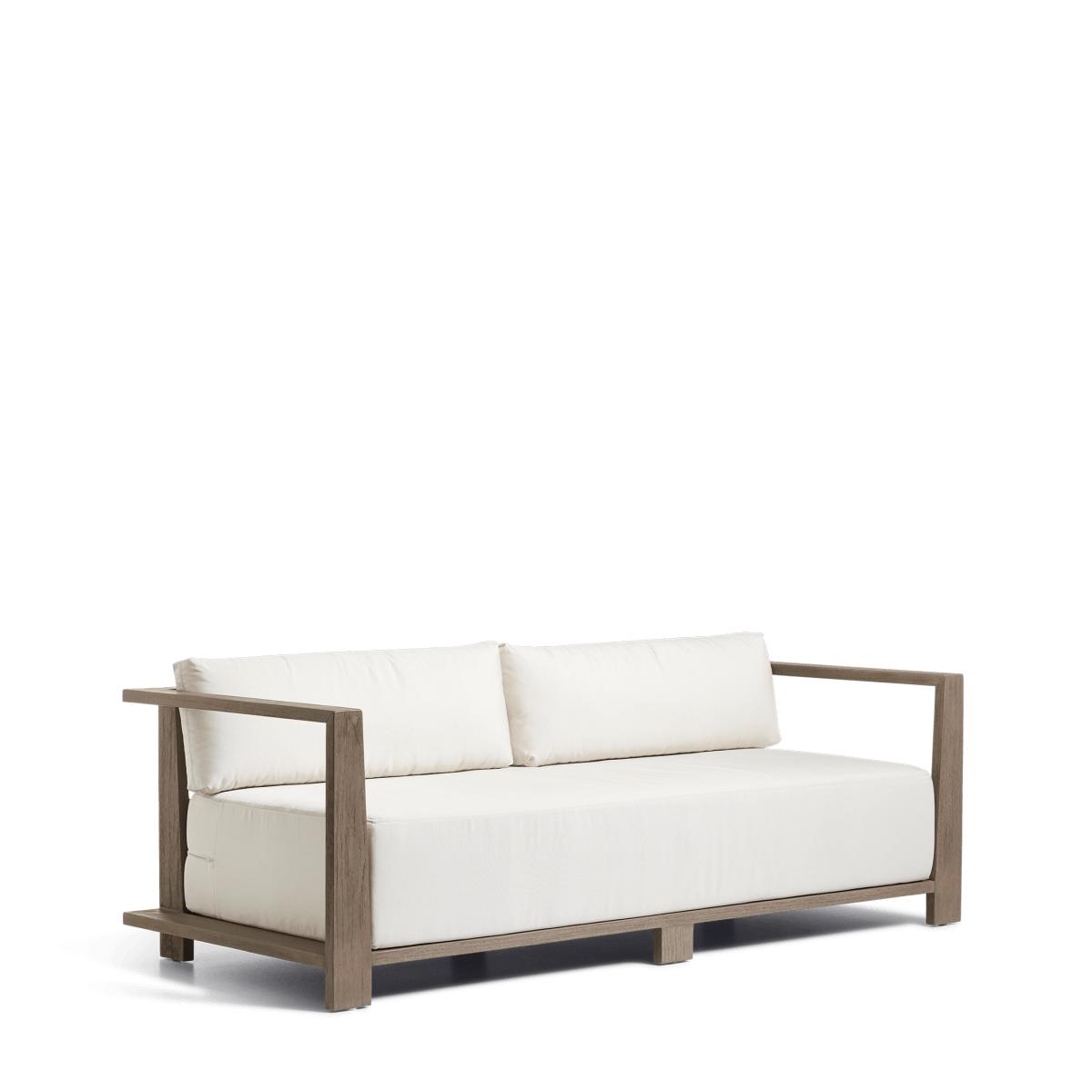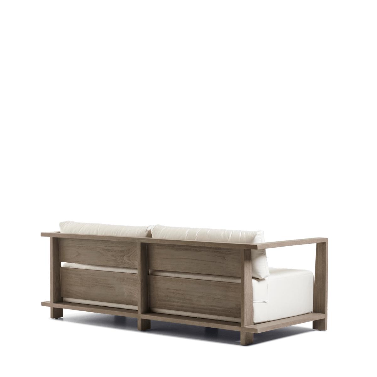 Our Swanmore Garden Sofa is sleek and modern with its angular wooden frame. It is formed from teak, which is a dense wood high in natural oils that makes it strong, durable and weather resistant. The usually smooth wood is wire brushed and hand painted for an authentic weathered wood appearance. Topped with weather-resistant cushions, the sofa couldn’t be more comfortable. Pair it with the Swanmore Garden Ottoman to form an L-shaped sofa. Due to the natural materials and artisanal finishing process, each piece may have individual characteristics.