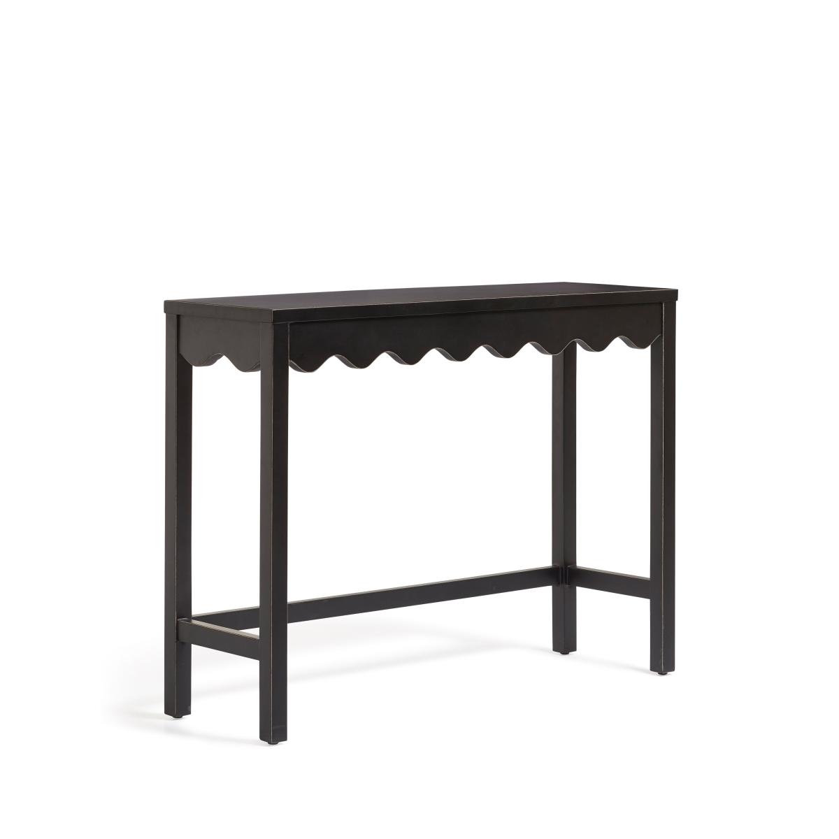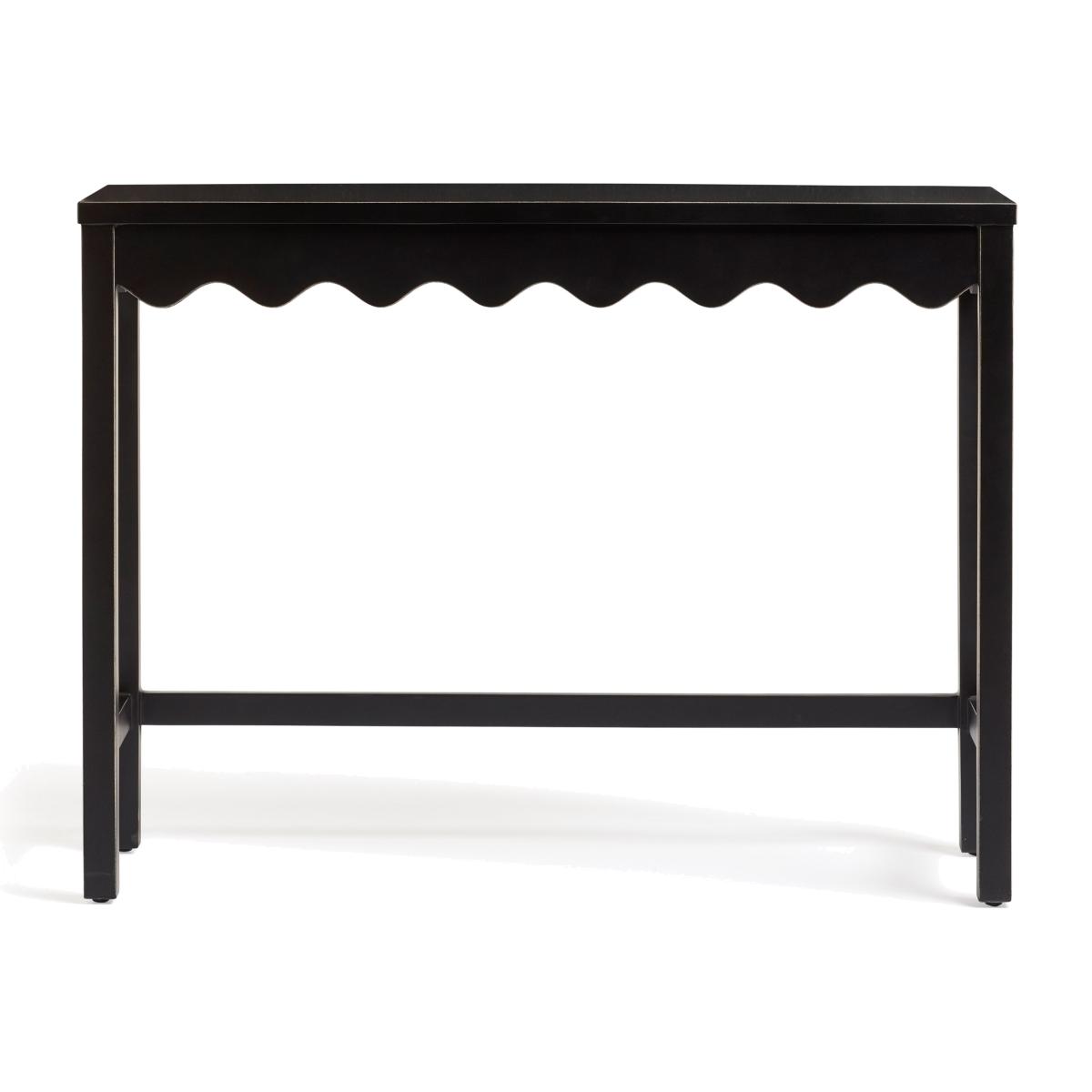 Our Talasa Console Table is named after the Greek word for 'sea', in homage to its hand-carved undulating edge that resembles a wave. The scalloped shape was originally applied to a tray which was, in turn, based upon an antique. The mango wood is hand painted a matte black before the edges are rubbed to reveal the wood beneath. Due to the manual technique, each piece will have individual characteristics that add to their charm.