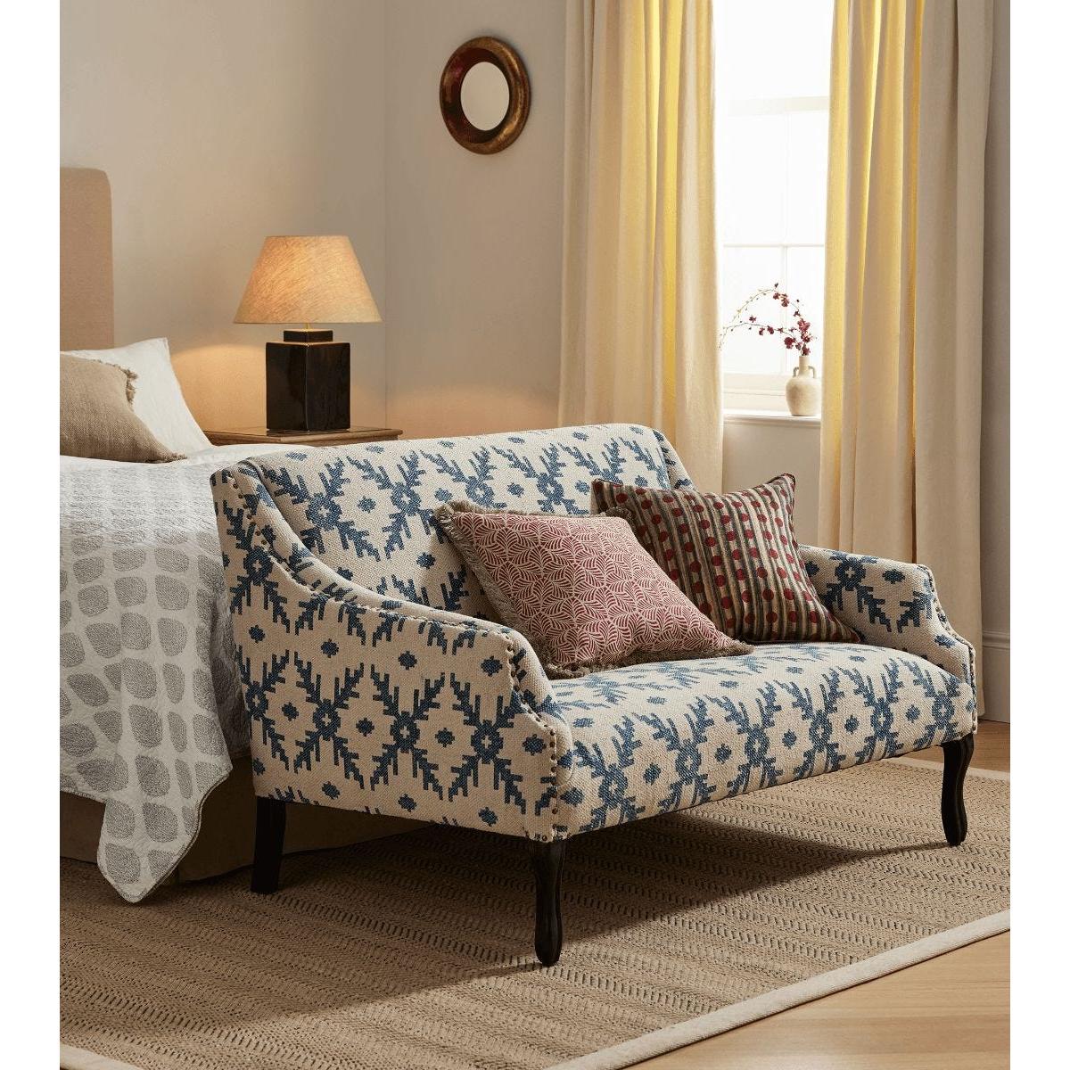 I love this sofa for its bold geometric pattern and vibrant Lazaret Blue hue, which makes it a real statement piece. It works well in eclectic, modern, or even bohemian interiors where colour and pattern are key. Its cotton upholstery adds a tactile, relaxed feel-perfect for casual living or a family room. For styling tips, consider pairing it with neutral-toned cushions or adding textured accessories like a woven throw to soften the look. The fringed detailing at the base also lends a playful touch, making it a versatile anchor for both contemporary and vintage-inspired spaces.