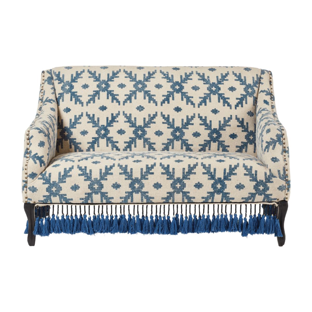 Smaller than the average 2-seater sofa, the Tarma's petite frame makes it the perfect piece for a cosy nook or snug Covered with our hand-dyed Lazaret print in Dark Blue and White, and finished with (removable) tassels, this compact sofa packs a big design punch.