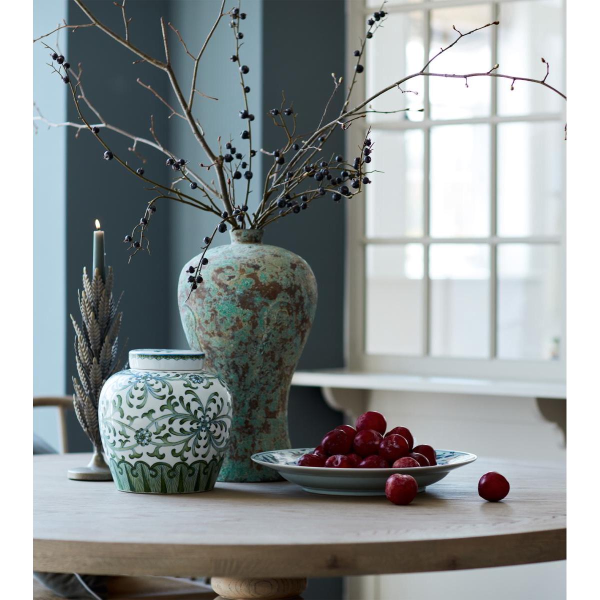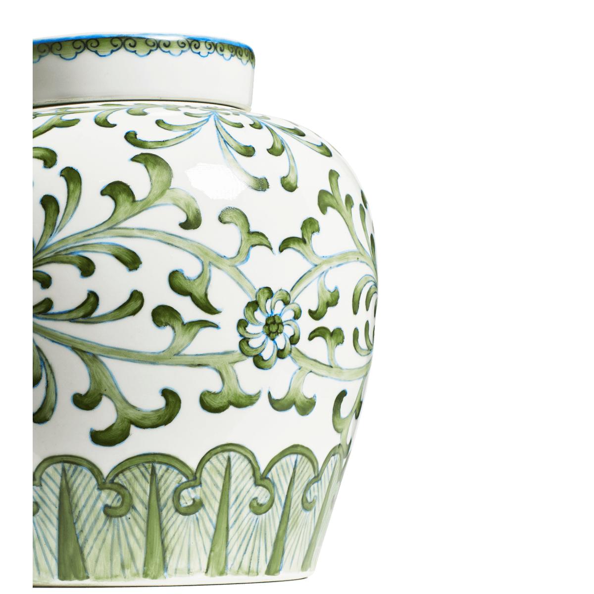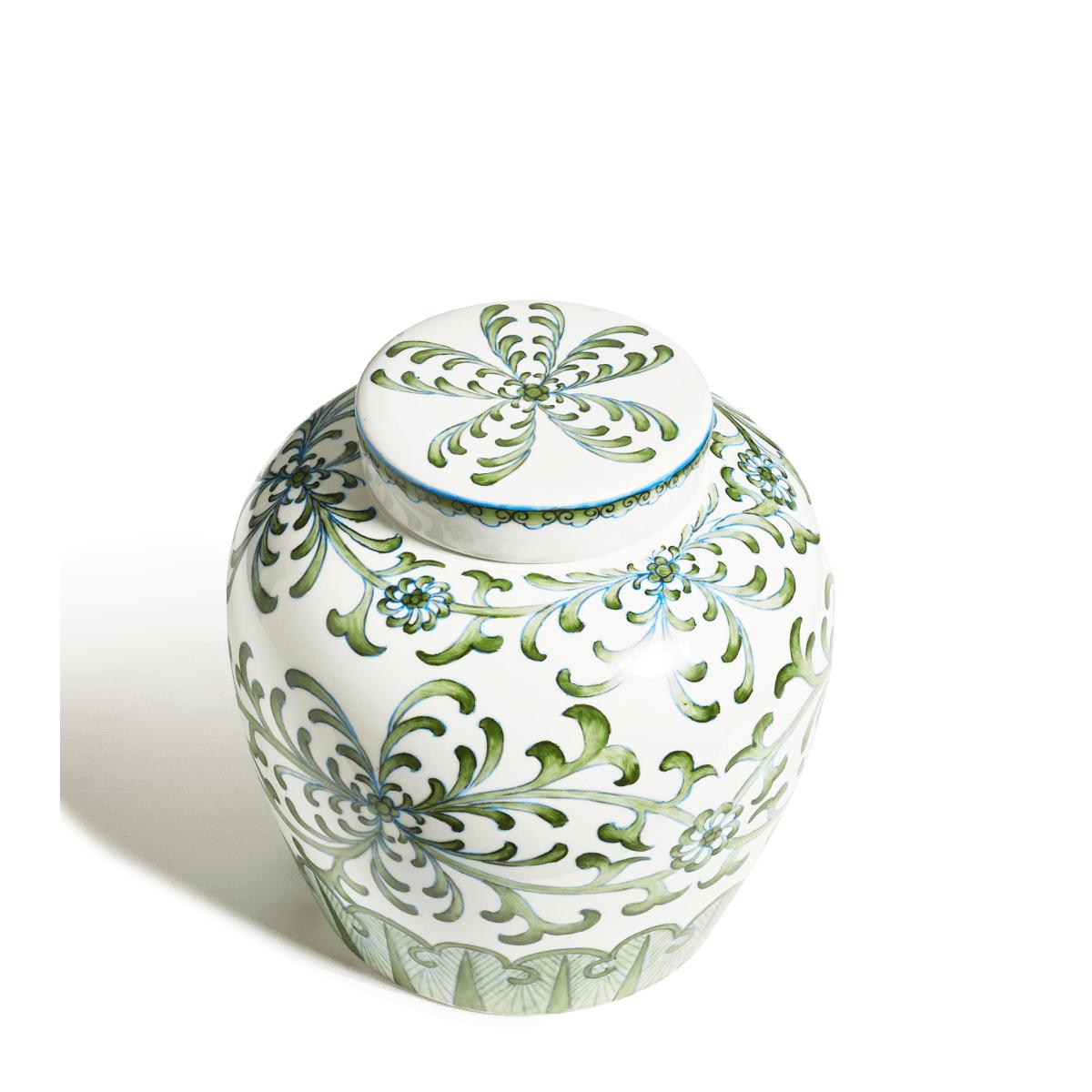 Téngwàn is a Mandarin word meaning ‘vine’, which perfectly encapsulates the curving green pattern decorating this lidded pot. Our Tengwan Pot is made from porcelain, with the florals hand painted by skilled artisans and fired at a high temperature to achieve the shine. If you look closely, you can see the blue edging on the green patterns that give them a sense of depth.
