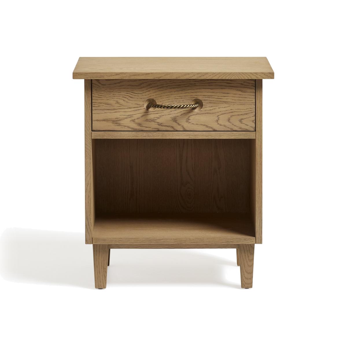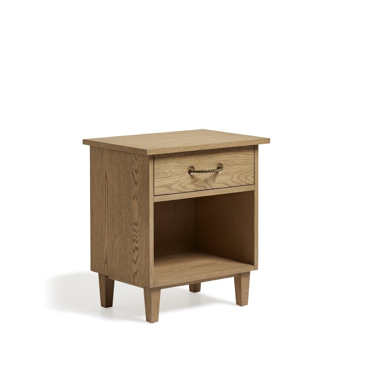 The Theseus Range is a great example of neat woodwork and conscious metal detailing. The weathered oak facade of the Side Table makes a feature of the natural grain of the wood. A rope-style, twisted metal handle, with an antique brass finish, is inset into a carved dish detail on the front of the drawer.