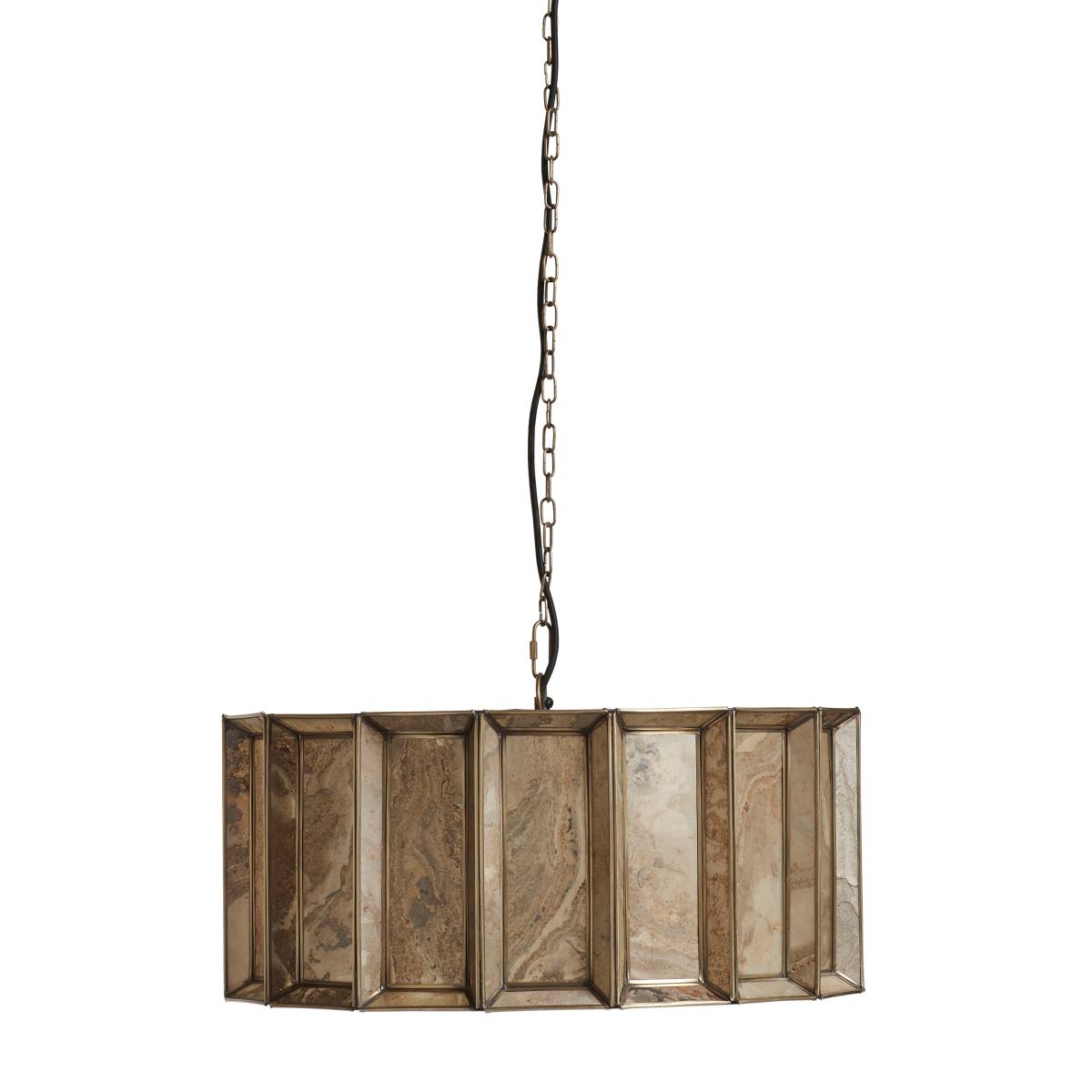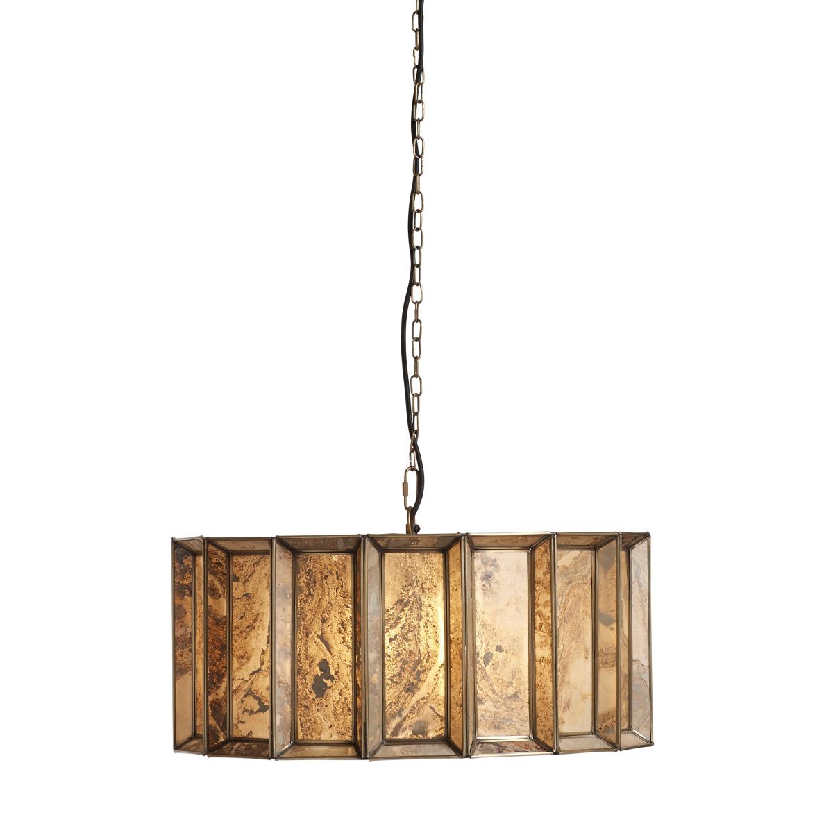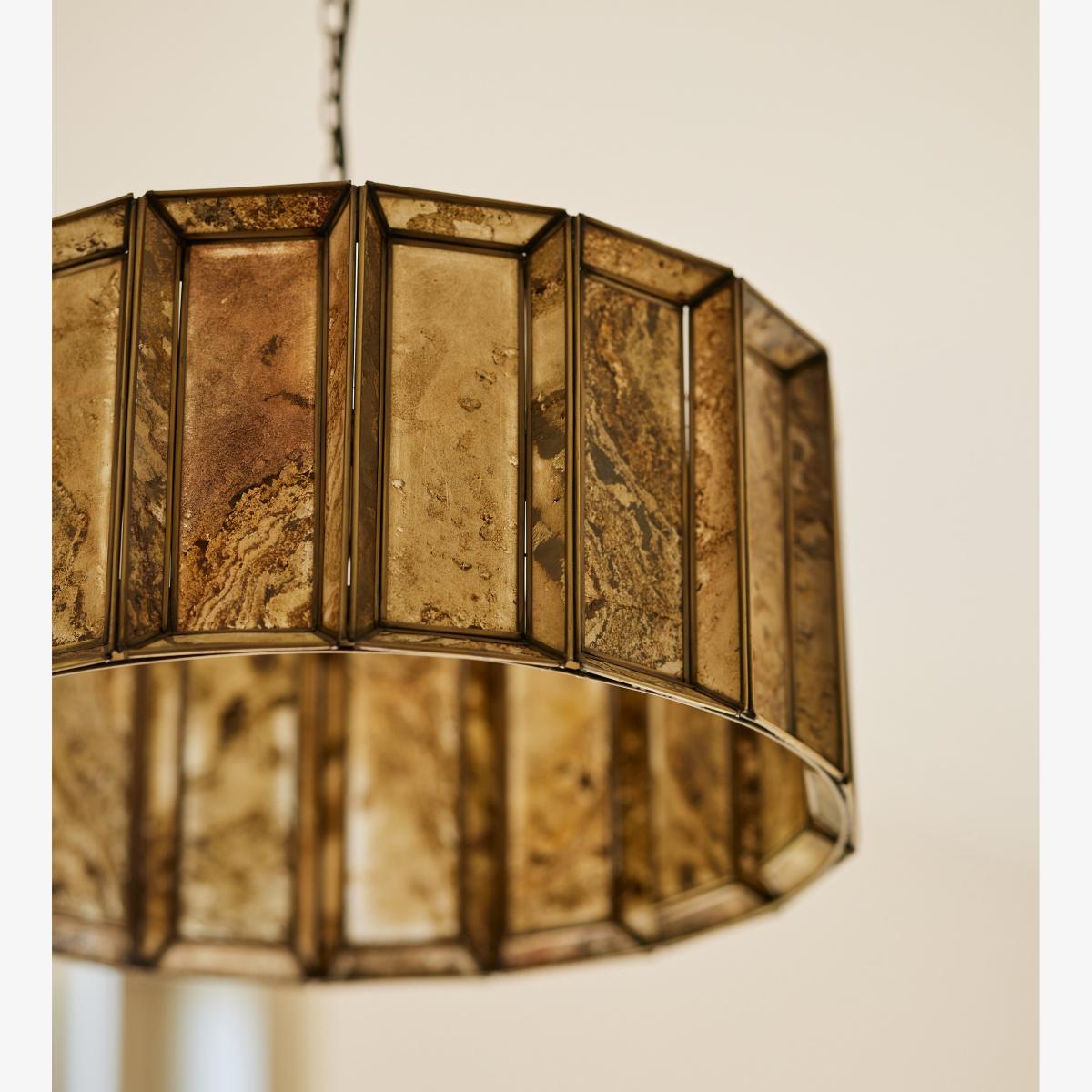 Torsten is made from a beautiful tan stone that’s delicately-shaved and hand-applied to the frame of the pendant to create a multi-faceted design that looks different according to whether the lamp is on or off. The antique-brass metal finish on the edges and chain add to its awe-inspiring aesthetics.