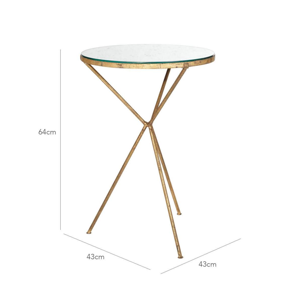 An unobtrusive side table featuring slender tripod legs in distressed metal and a circular antique mirrored top. Perfectly sized for small spaces.