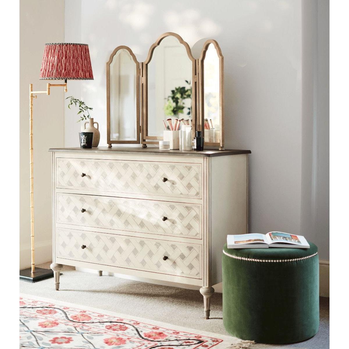 I love the OKA Trois Mirror for its versatile antique silver finish and elegant design, which lends itself beautifully to both classic and contemporary interiors. It works particularly well in boutique bedrooms, sophisticated dressing areas, or as a statement piece above a console or fireplace. Practical styling tips include pairing it with warm metallic accessories to emphasise the antique silver tone, or combining it with soft furnishings in neutral tones for a timeless look. Its tri-fold design also adds a touch of decadence and functionality, making it ideal for spaces where practicality with style is key.