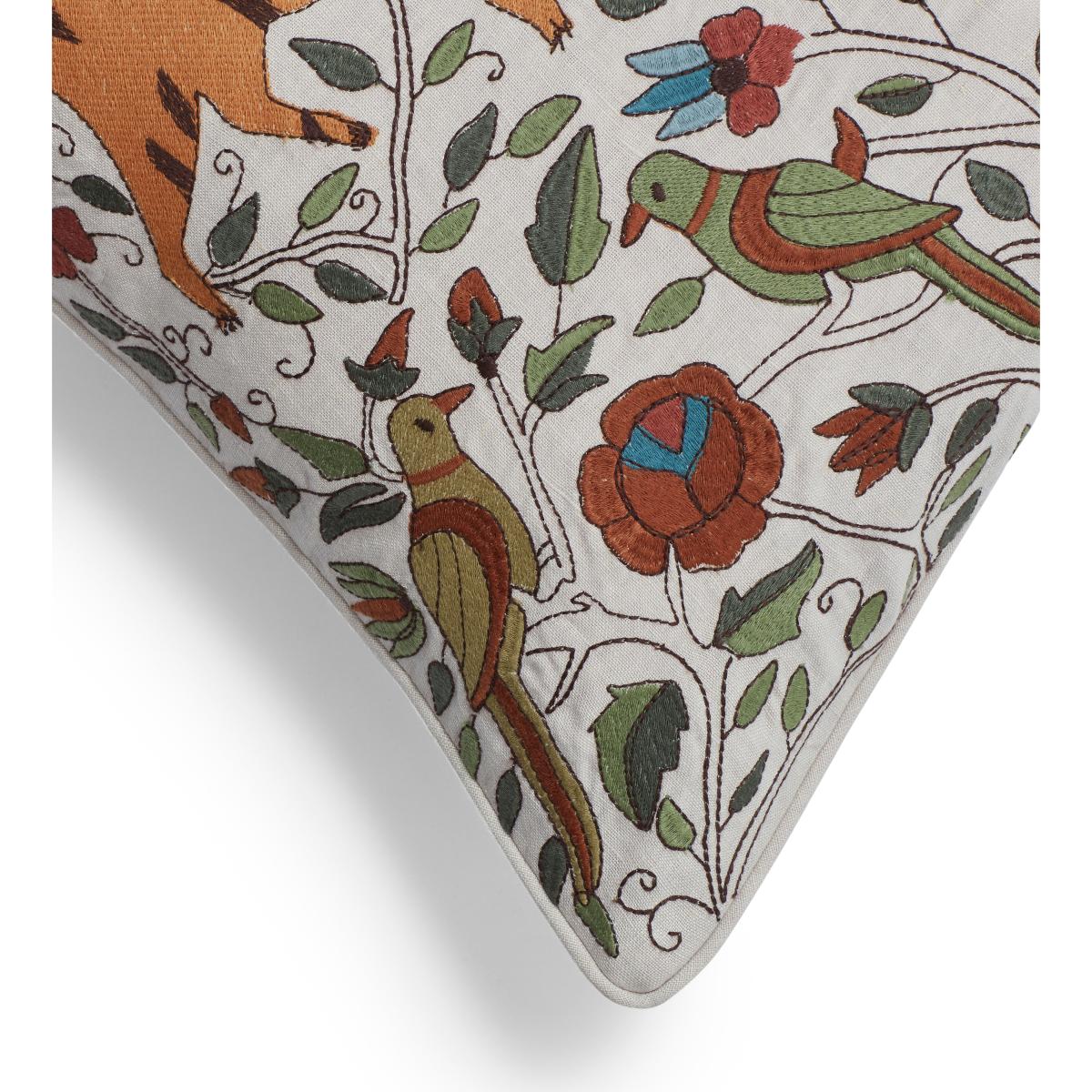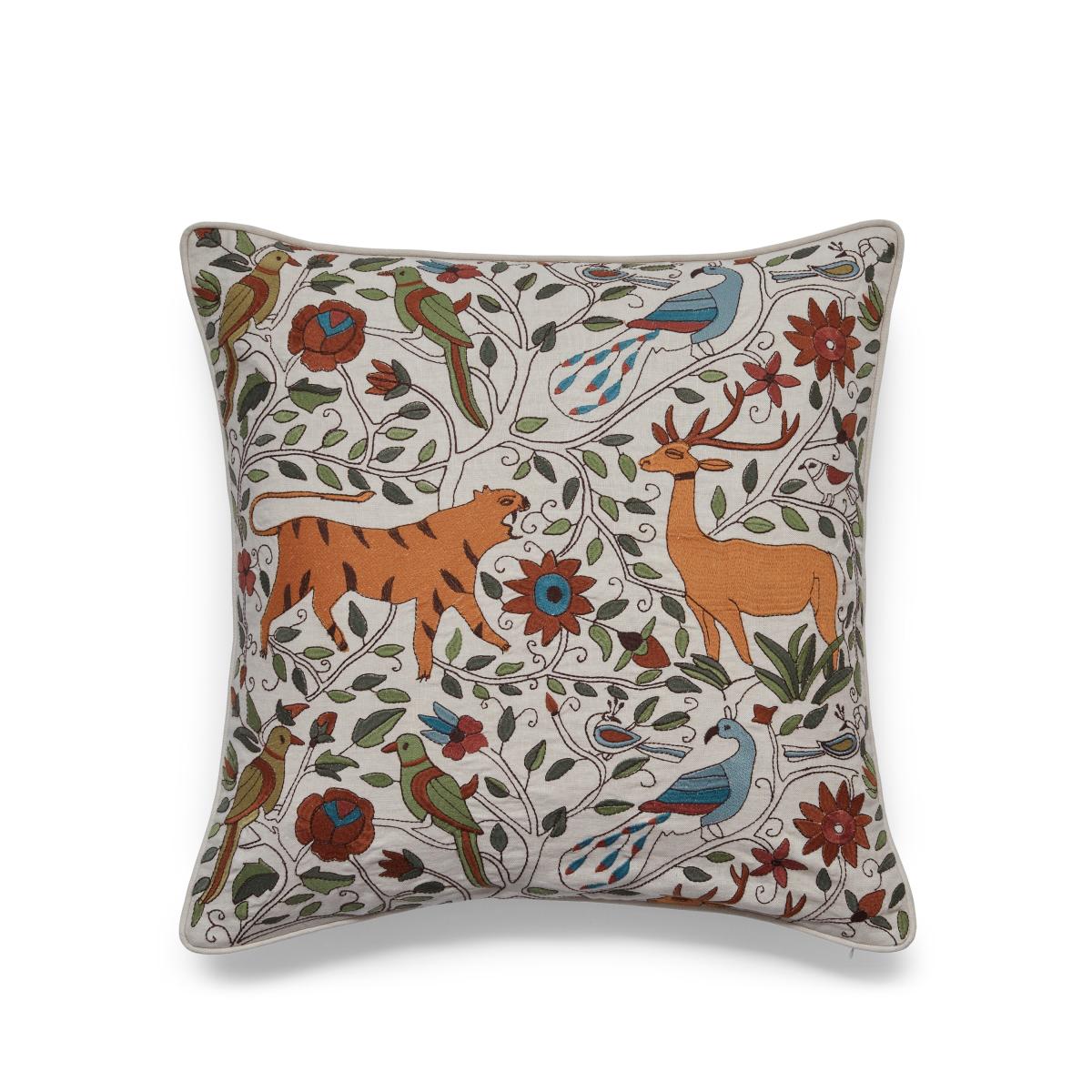 The square Troupeau Cushion Cover features an animal print – inspired by antique Indian Kantha embroidery known for its simple running stitches. This embroidered cushion includes piping around the edges which adds an interesting accent.