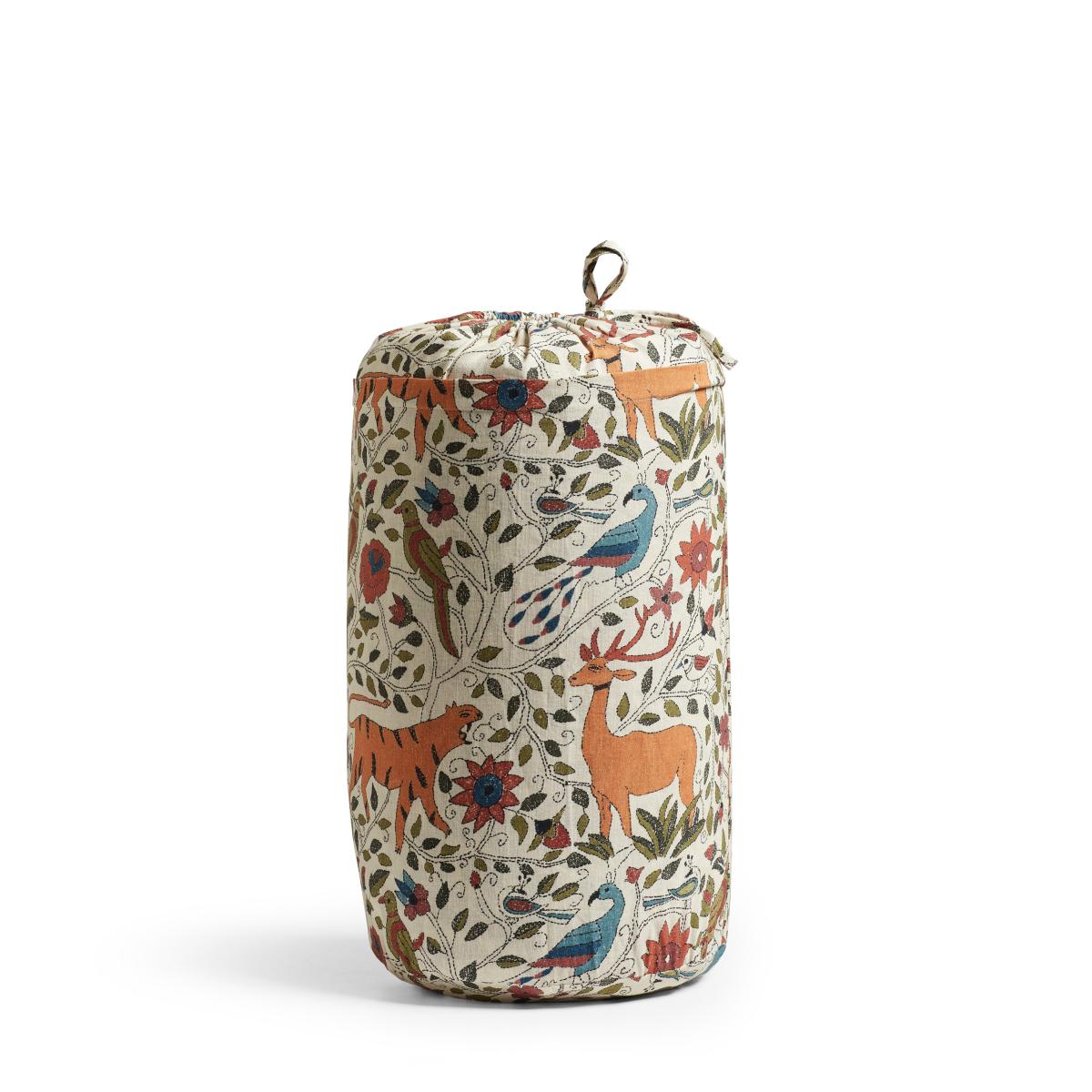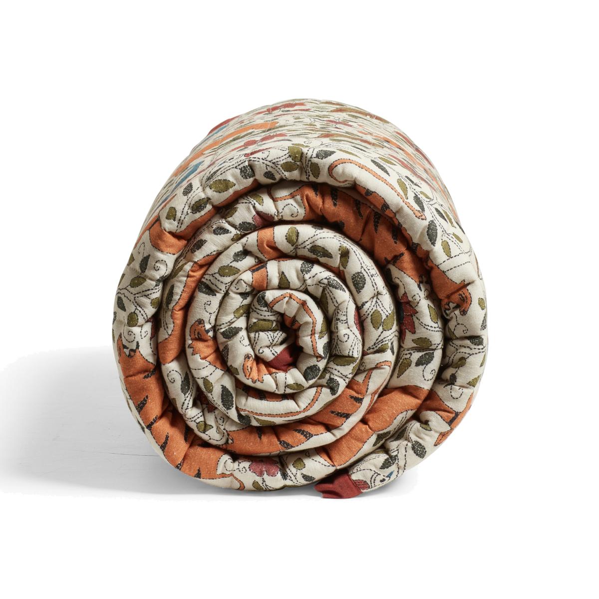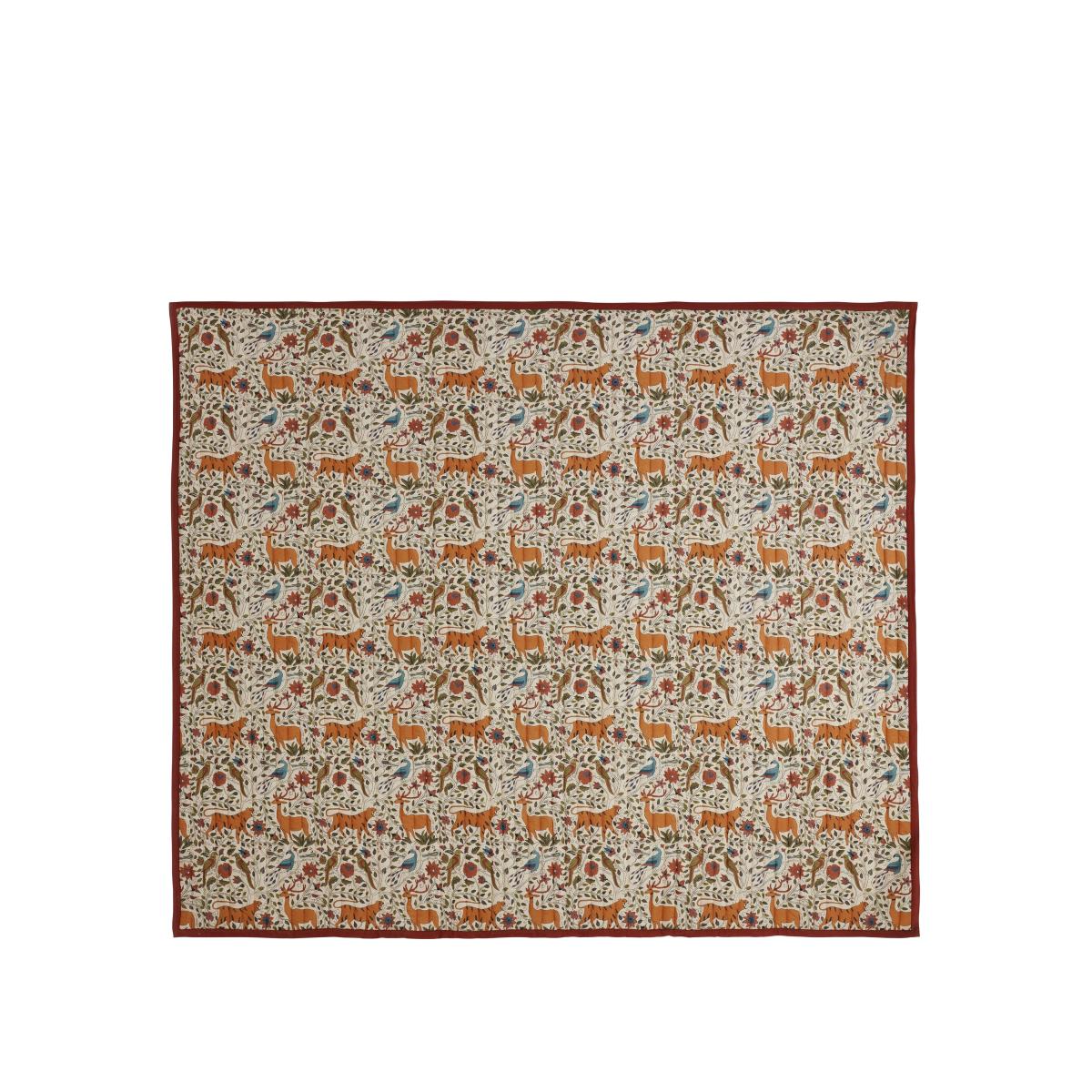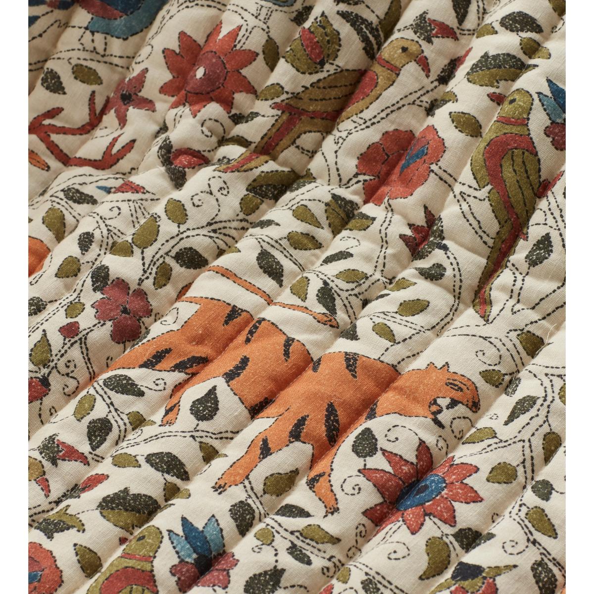The Troupeau Quilt features a quirky animal pattern on one side – inspired by an antique Indian Kantha swatch – that’s embroidered using a hand-guided technique on dyed cotton fabric. The piping around the edges adds a decorative accent.