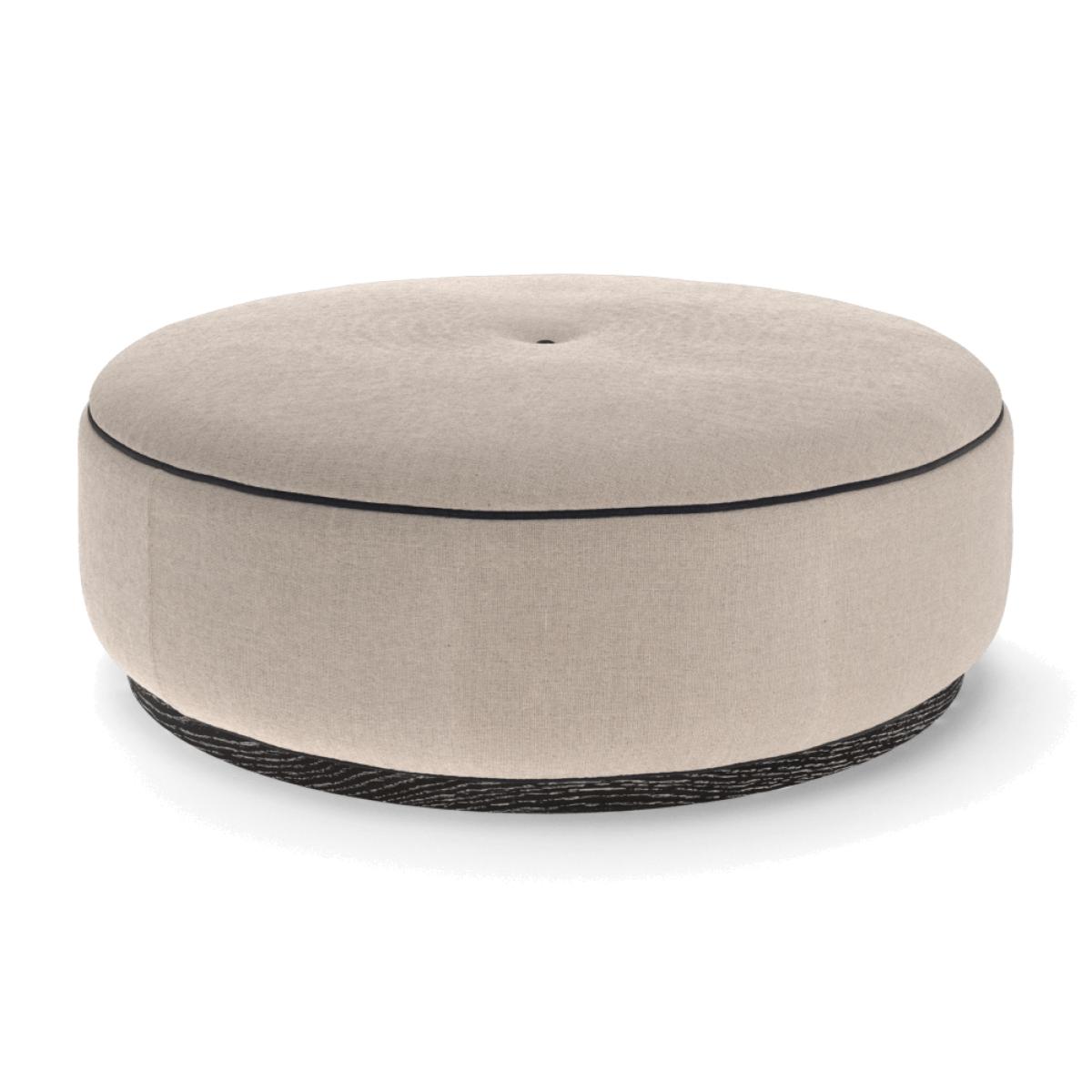 This versatile ottoman works in the sitting room, bedroom, or just about anywhere you'd like to rest your feet. Its wooden frame and base are covered with cushioned silver-grey linen upholstery offset by a dark charcoal trim. The pleasingly round shape will look great in contemporary settings.