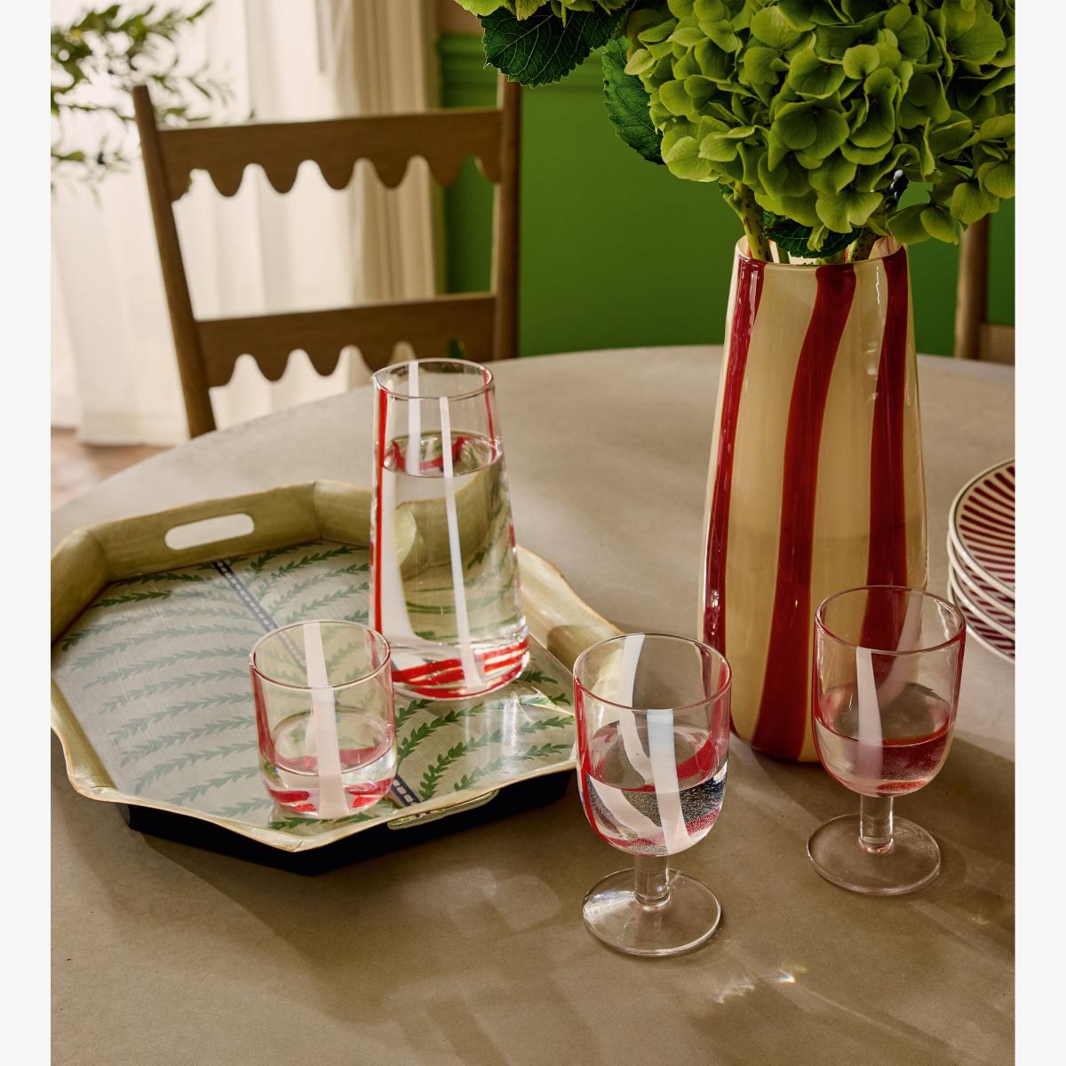 The pleasing painterly effect of our Twistle Vase is achieved through the artisanal process of mouth-blown glass. It features stripes of deep red on a vellum backdrop with an antique effect. The edge is hot cut for a rounded rim that retains a chunky, organic style which highlights the handmade nature. Due to this, each piece will have individual characteristics that add to their charm.