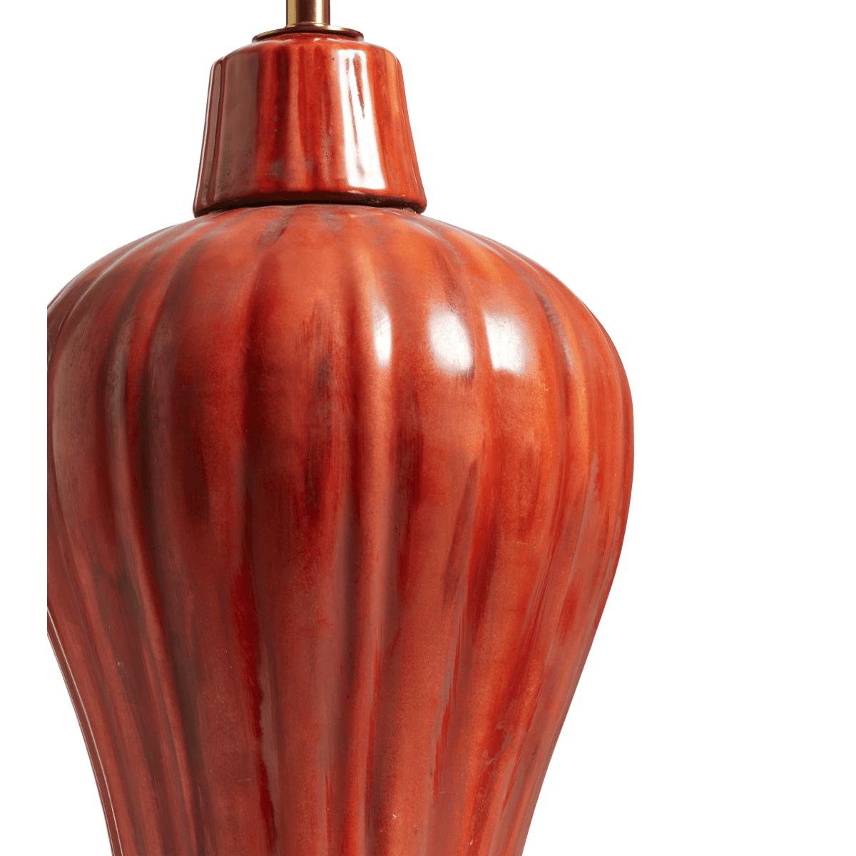 The pleasing form of our ceramic Udara Table Lamp is perfect for sporting large, striking lampshades. The deep orange hue is notably the most difficult to achieve through pottery firing due to the high temperatures required. The delicately ribbed body highlights the light and dark hues in the coral shade for a unique effect.