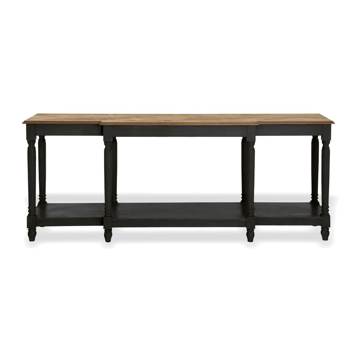 Our large, break-fronted Upton Console Table is perfectly sized to act as a sideboard in the kitchen, dining room or in a large hall. Painted a dramatic black with a solid weathered oak top and a useful shelf below it is a great and useful addition to a larger-scaled room.