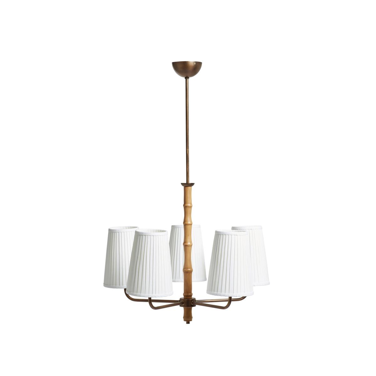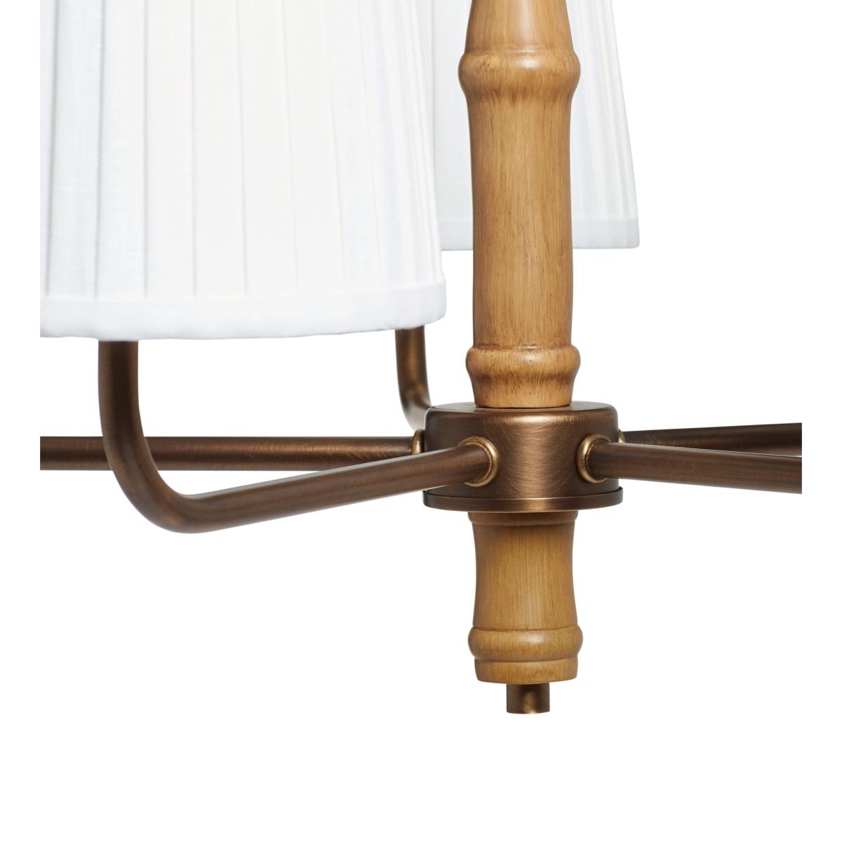 Our Verena Chandelier is based on an antique design. Its five metal arms are finished with hand-applied brushstrokes for an antiqued brass look. They branch out from a central faux bamboo stem, which has an adjustable drop height from the ceiling so that you can position it in the perfect place for your chosen room. Each off-white linen lampshade is hand pleated for a refined look.
