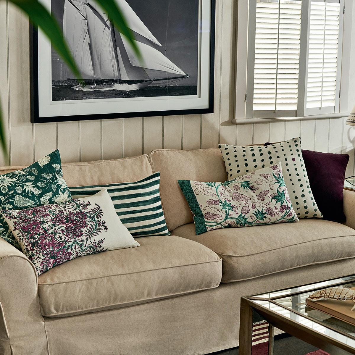 I love this OKA cushion cover because of its fresh floral design and versatile colour palette. The combination of green and purple makes it easy to incorporate into both neutral and more colourful interiors. It works particularly well in relaxed, classic schemes like cottagecore or bohemian setups, where its linen texture adds a touch of durability and natural appeal. Practical styling tips include pairing it with solid-coloured cushions in complementary shades, or using it as a focal point on a neutral sofa or bed. Its smaller size makes it ideal for layering or adding a pop of colour without overwhelming the space.
