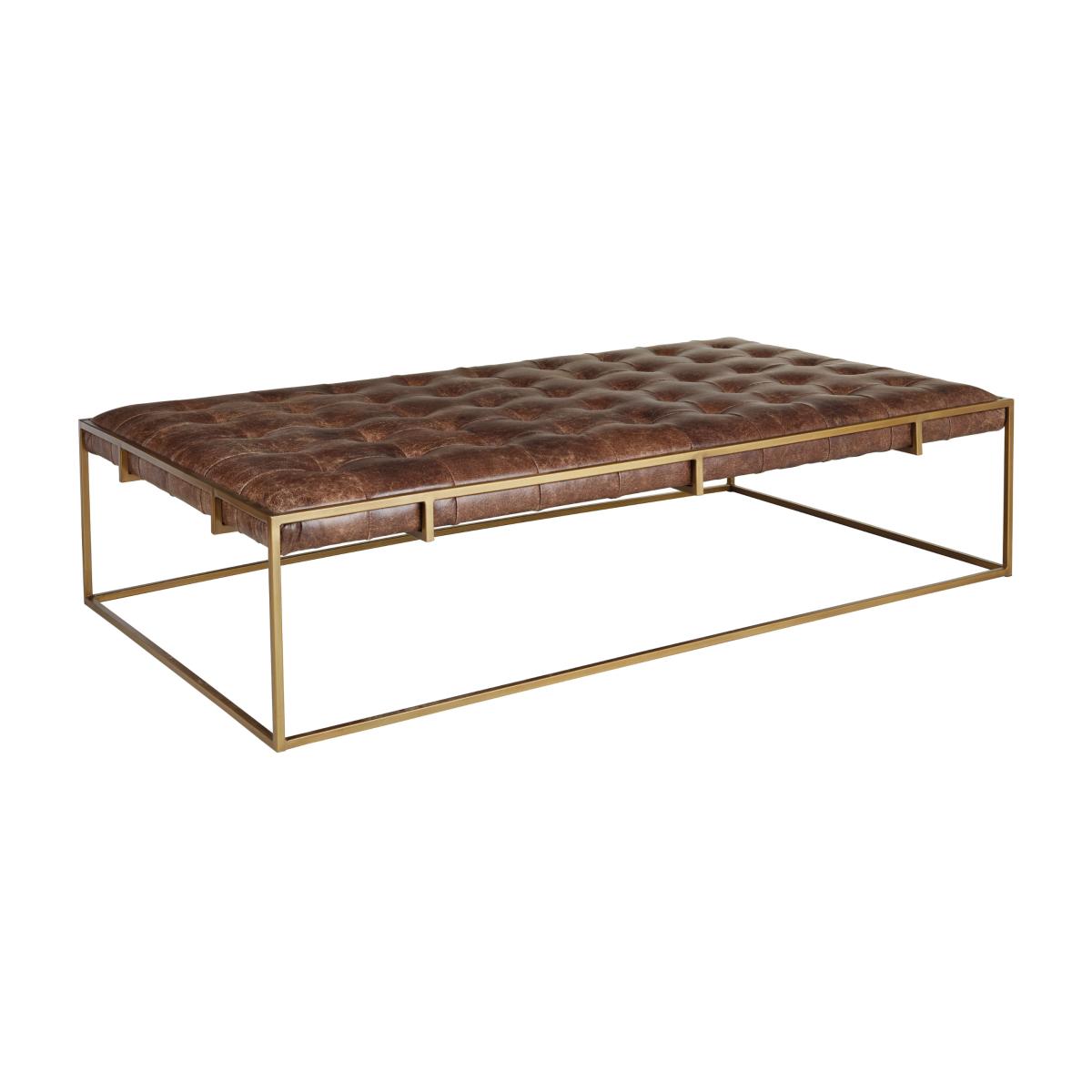A sophisticated handcrafted coffee table/ottoman with a masculine finish, this piece combines an angular, brass-coloured frame with a padded, buttoned bench top that is upholstered in aged hazelnut leather. Blending old and new materials, this versatile piece makes a smart centrepiece in a large sitting room, whether traditional or modern in style. It could be used for extra seating if needed and, as with all our leather pieces, it just gets better with age.