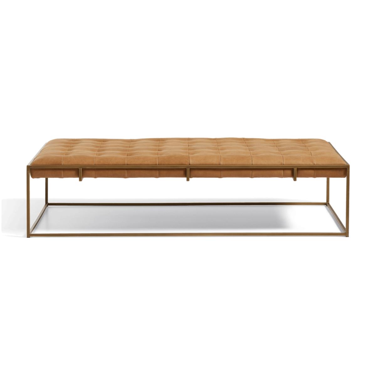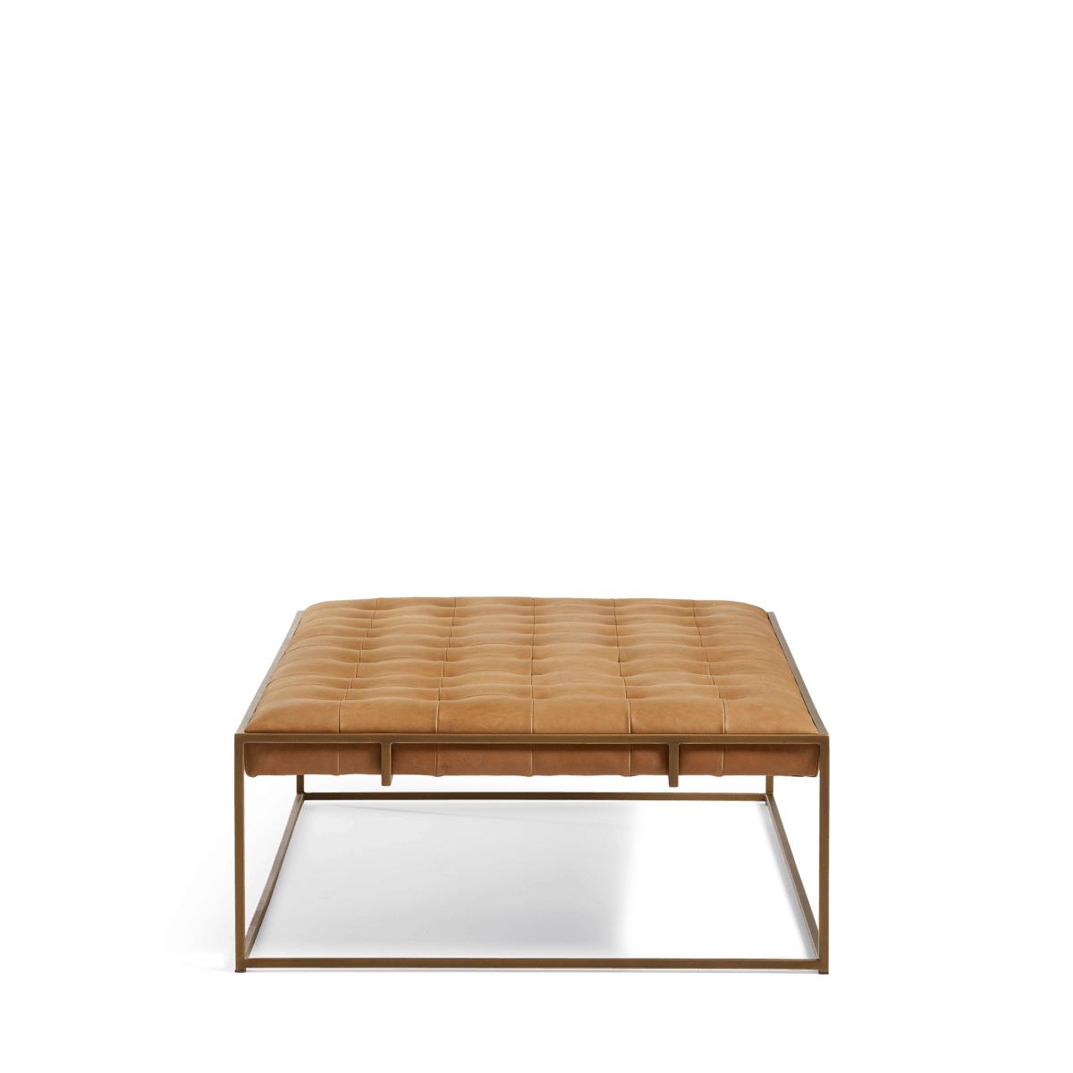 A sophisticated handcrafted coffee table/ottoman with a masculine finish, this piece combines an angular, brass-coloured frame with a padded, buttoned bench top that is upholstered in caramel-coloured leather. Blending contrasting materials, this versatile piece makes a smart centrepiece in a large sitting room, whether traditional or modern in style. It could be used for extra seating if needed and, as with all our leather pieces, it just gets better with age.