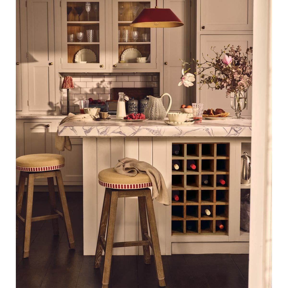 I’m a fan of the Weston stool for its simple hemp-linen seat and solid oak legs - the slim profile and subtle red stripe make it easy to slot into a variety of schemes. It works particularly well in Scandi-inspired kitchens, modern farmhouses or a relaxed coastal setting, where its natural tones and textural mix can be echoed in a neutral palette or offset with deeper blues and greens. For styling, I’d suggest pairing it with a marble or soap-stone island top, mixing in a leather-backed stool for contrast, and adding a slim footrest cushion in a complementary tone to enhance comfort without cluttering the look.