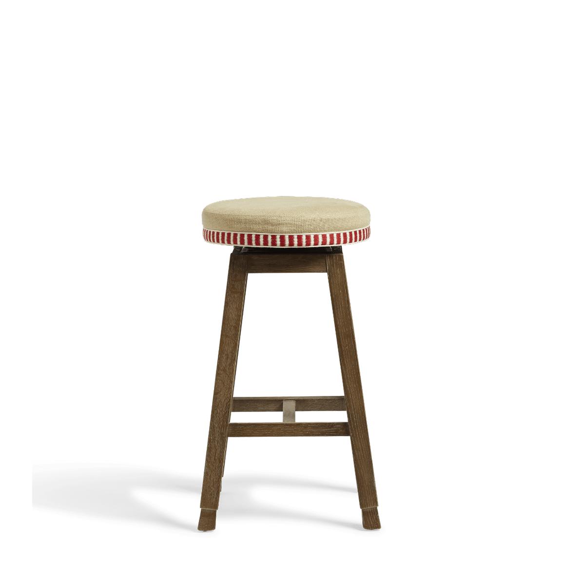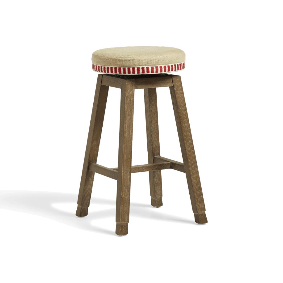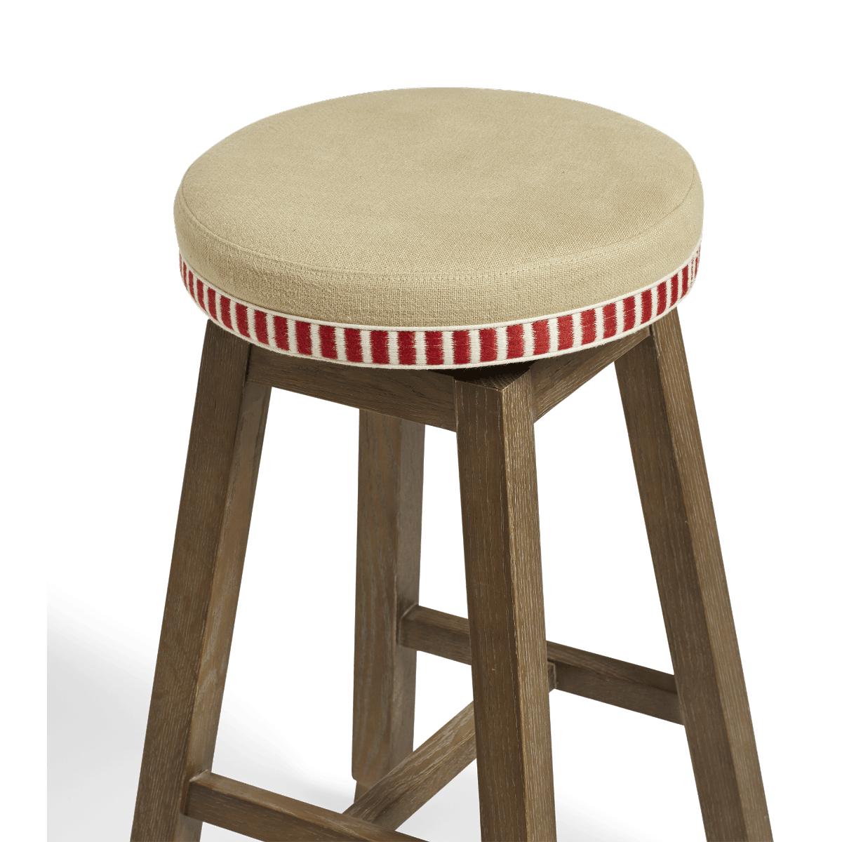 Our Weston Bar Stool has a round, swivelling seat that sits upon square-shapes wooden legs with hoof foot detailing. The Hemp-coloured linen is complemented by a red-and-white ikat-striped trim.