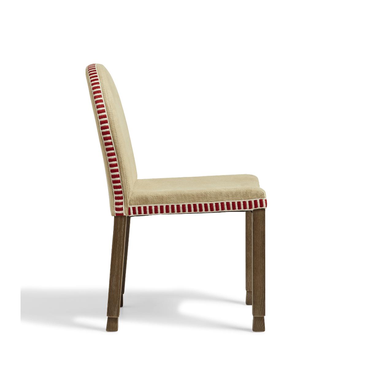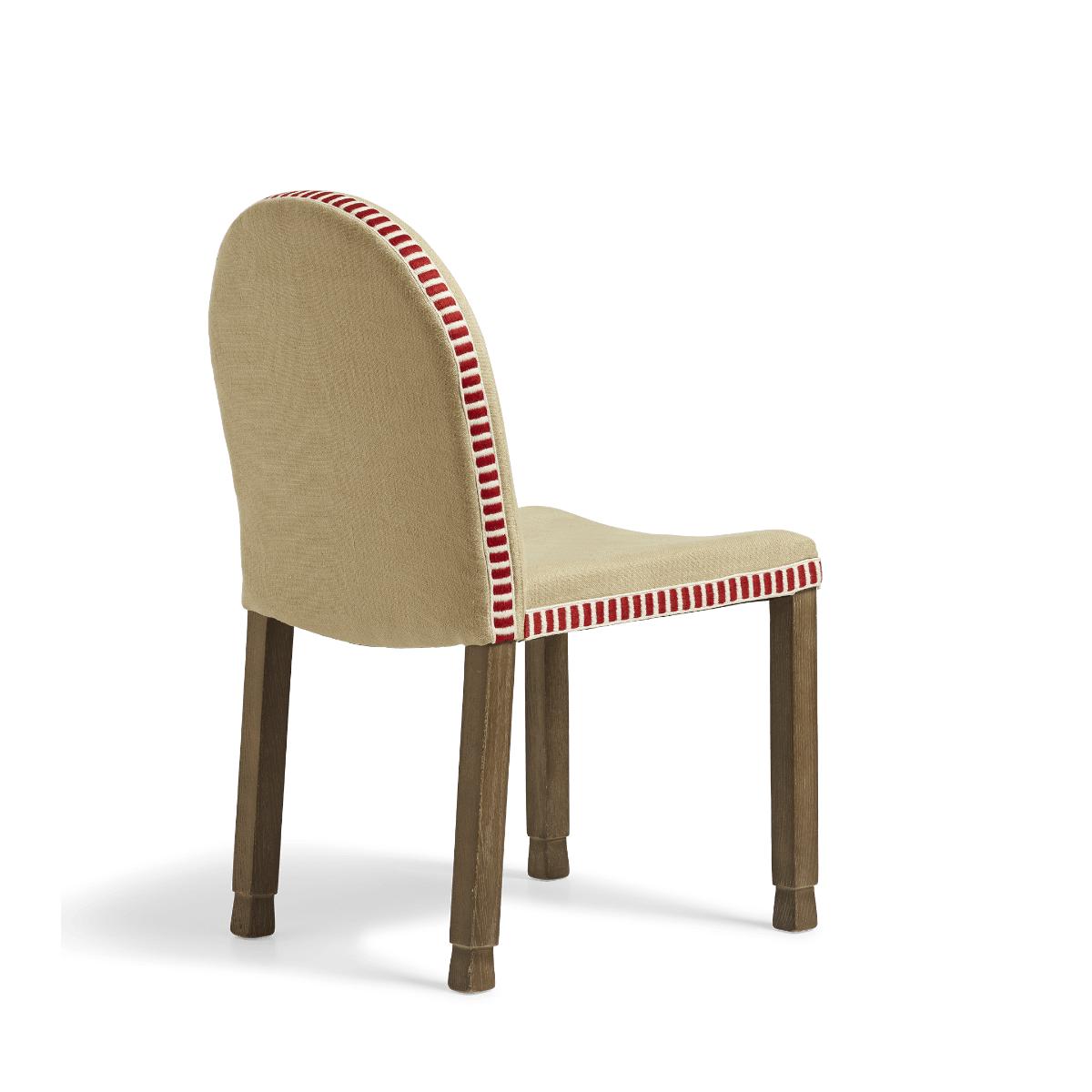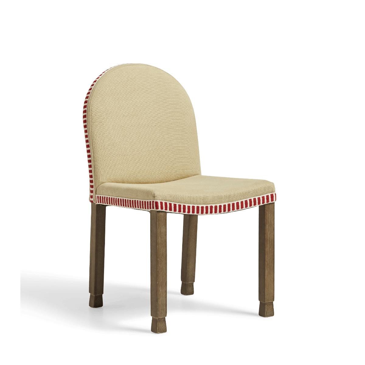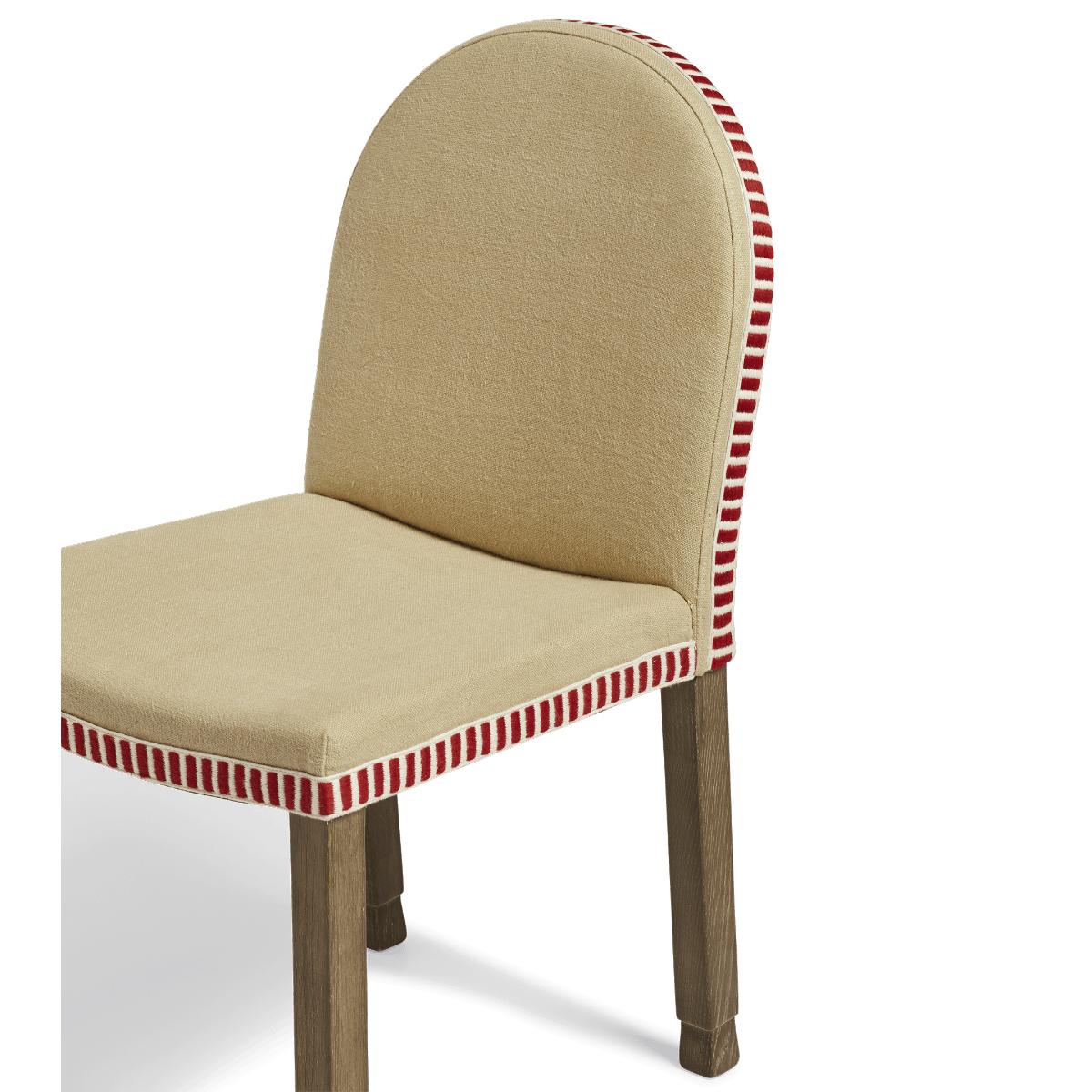 Our Weston Linen Dining Chair has a pleasingly modern curved back, quite in contrast to its square seat and legs. The Hemp-coloured linen is complemented by a red-and-white ikat-striped trim, all sitting upon wooden legs with a hoof foot detail.