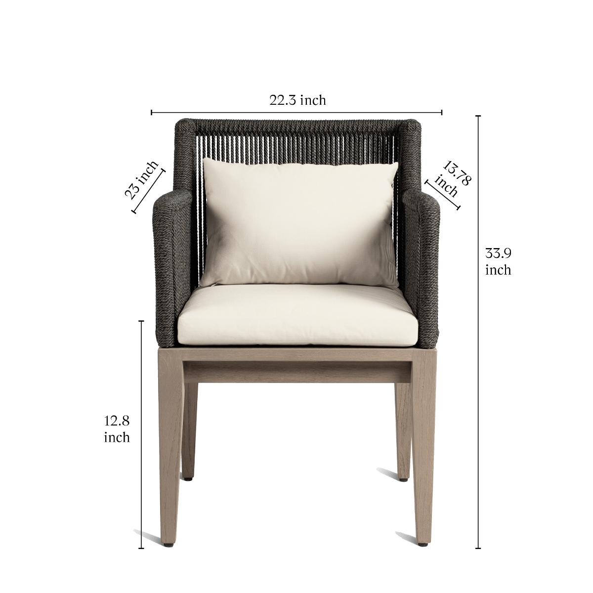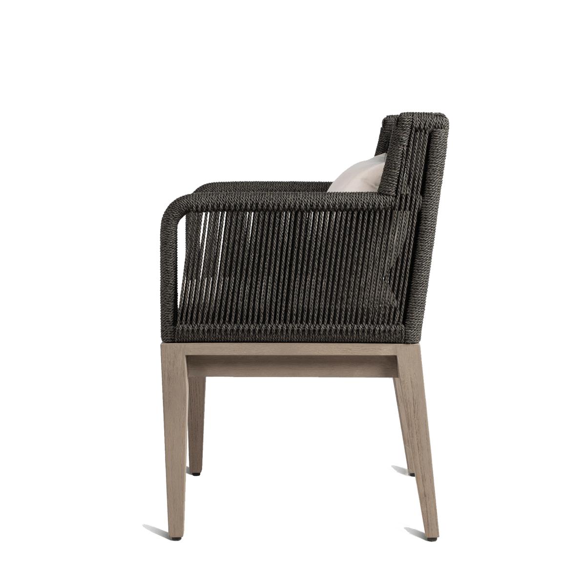 Our Whittaker Dining Chair has a smart, angular appearance with a leaning back and tapered legs. The base is formed from teak, which is wire-brushed and hand painted for an authentic weathered wood appearance. It has a slatted seat, topped with foam cushions that provide bundles of comfort, while the armrests and back are formed from aluminium, wrapped in a weather-resistant rope.