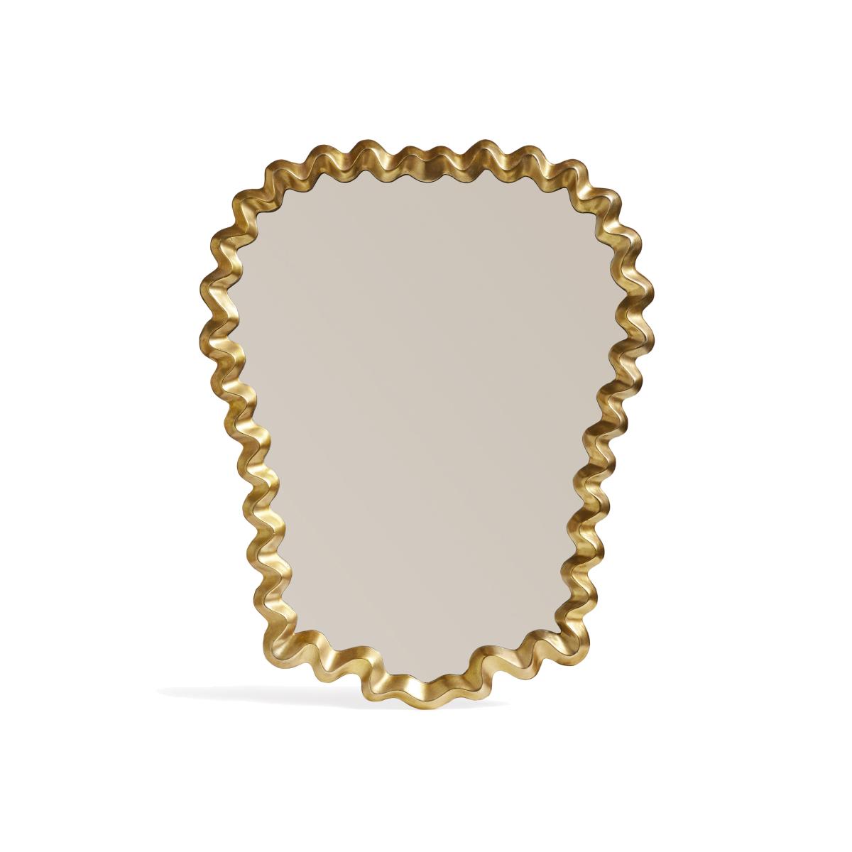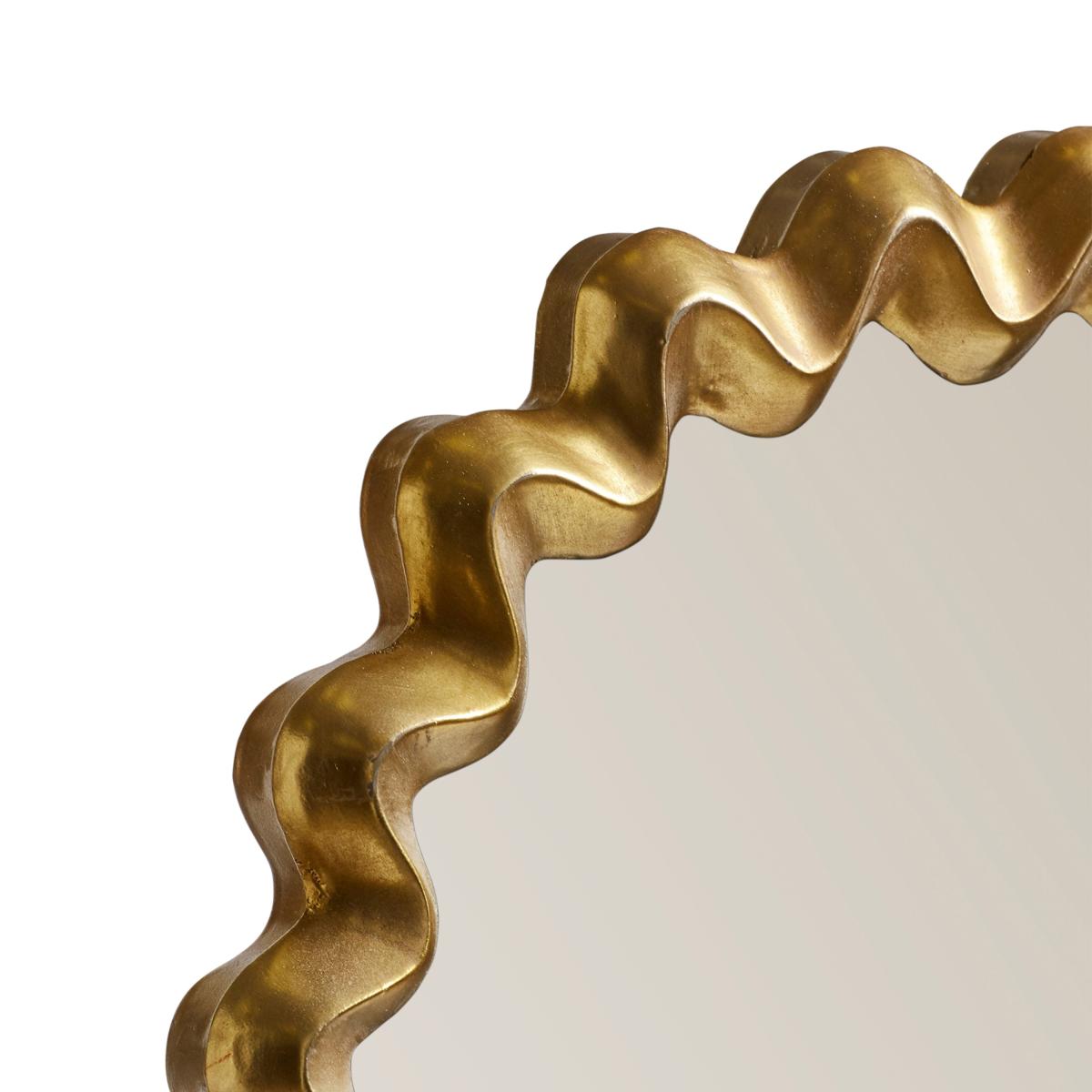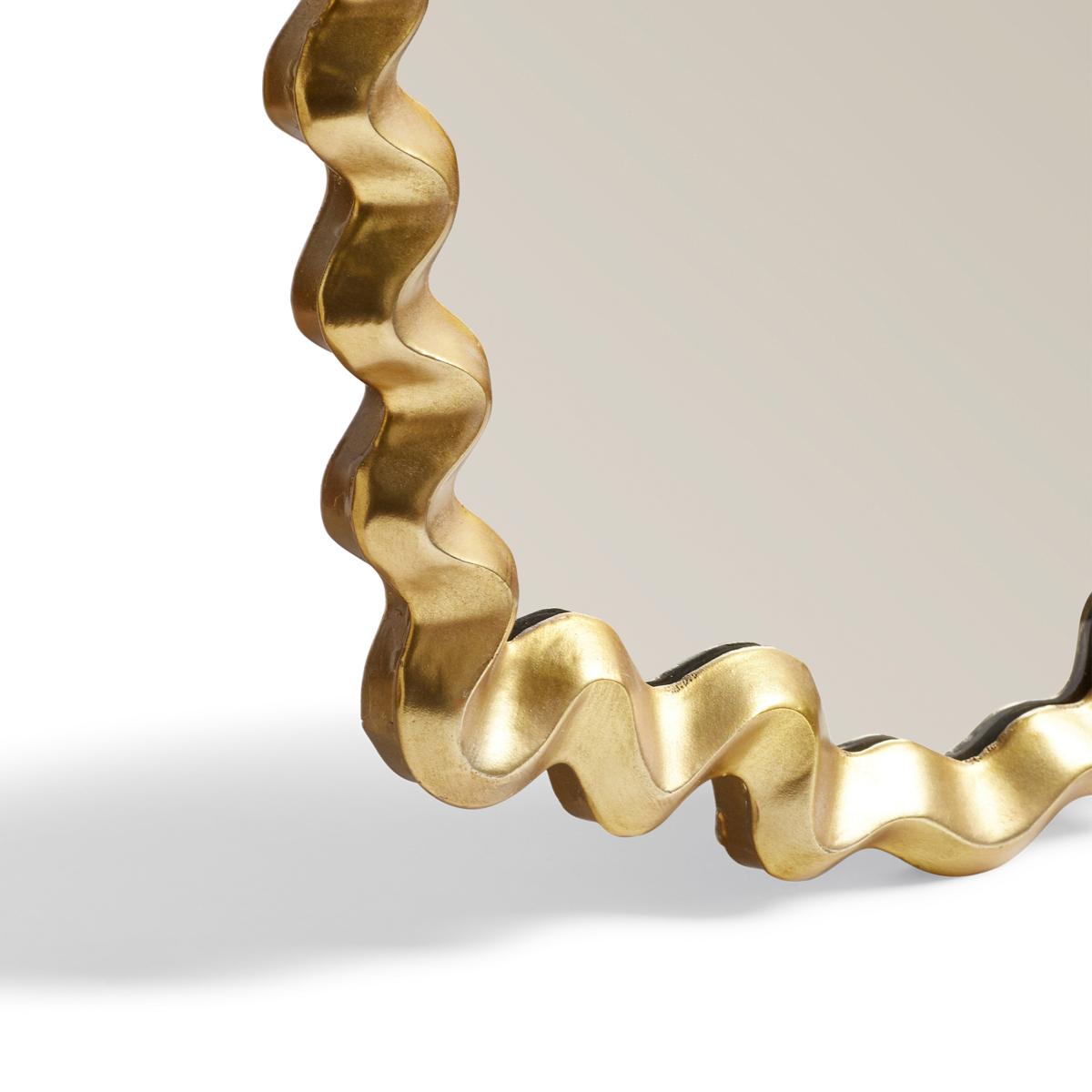 I love this mirror for its playful yet sophisticated design; the gold-wrapped wavy frame adds a touch of contemporary luxury without feeling overly formal. It works particularly well in eclectic, modern, or glam interiors, where it can serve as a statement piece or a charming accent. To style it effectively, consider pairing it with minimalist furniture or placing it above a console or sideboard to create a focal point. Practical tips include leaning it against a wall for a relaxed look or hanging it at eye level for daily use, ensuring it enhances the space's light and openness. Its unique shape and finish make it versatile enough to fit into various colour schemes, but it particularly shines when paired with neutral or soft-toned backgrounds.
