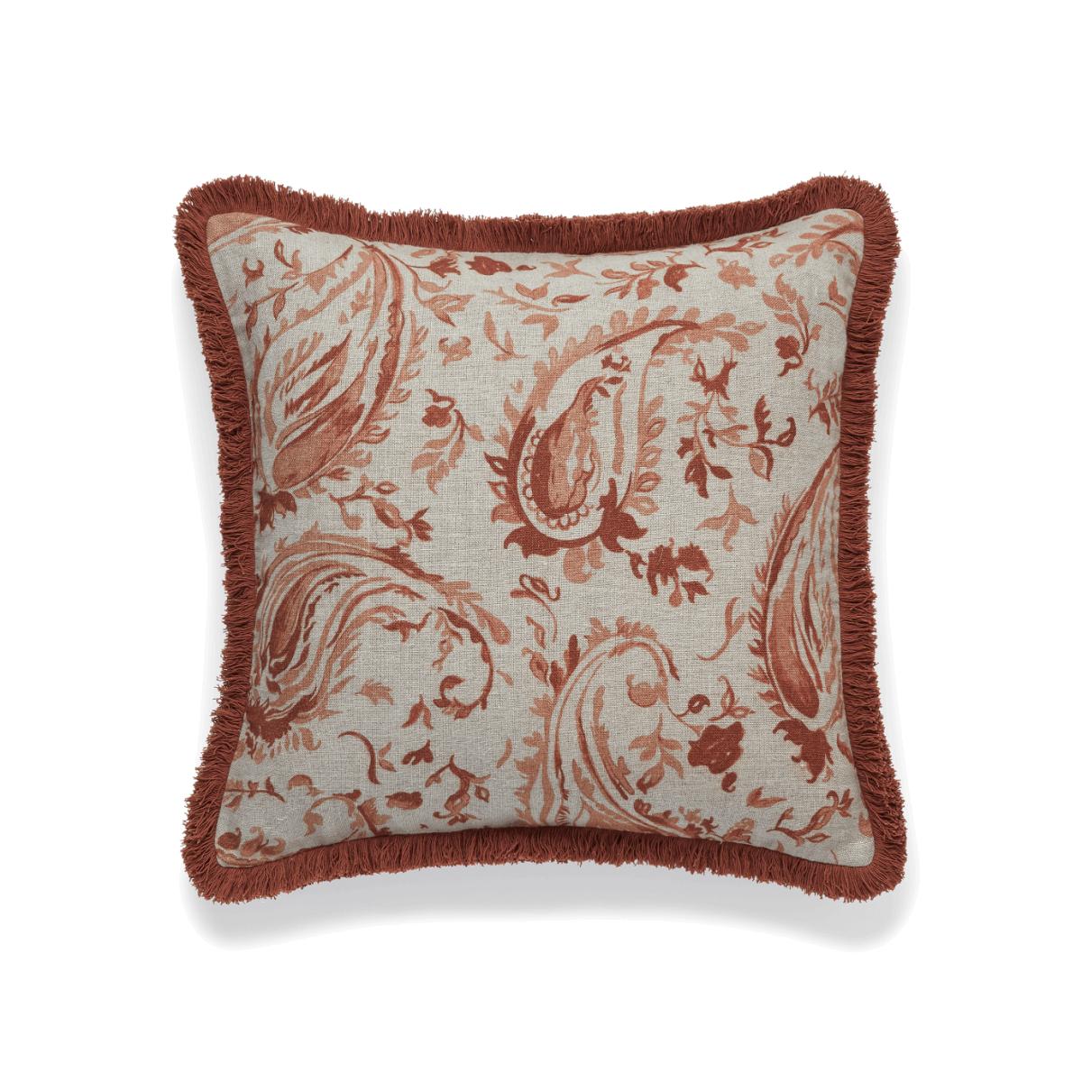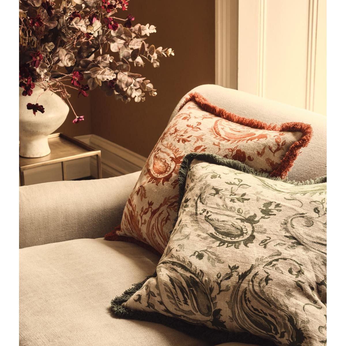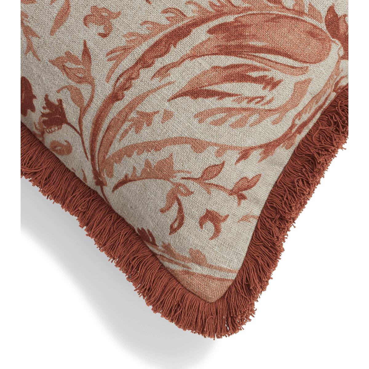 The watercolour style of our paisley-patterned Wilde Cushion Covers is cleverly digitally printed onto a linen base. This allows for a high level of detail and tonal variety in the finish. A matching Dirty Orange lace fringe runs around its edge, complemented by a solidly dyed blue cotton back.