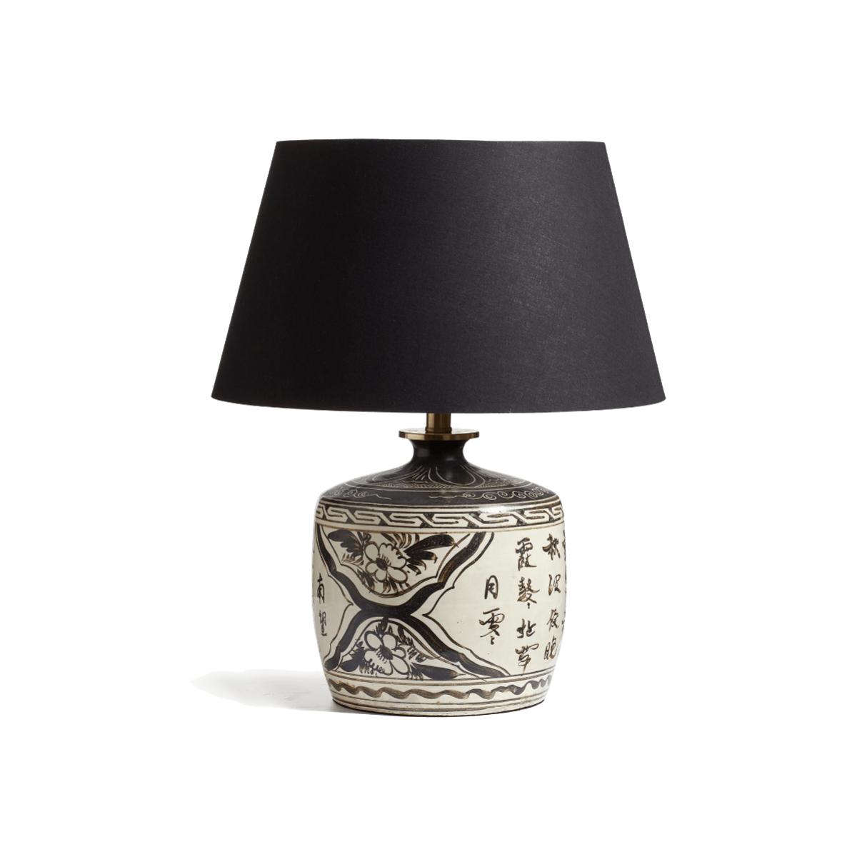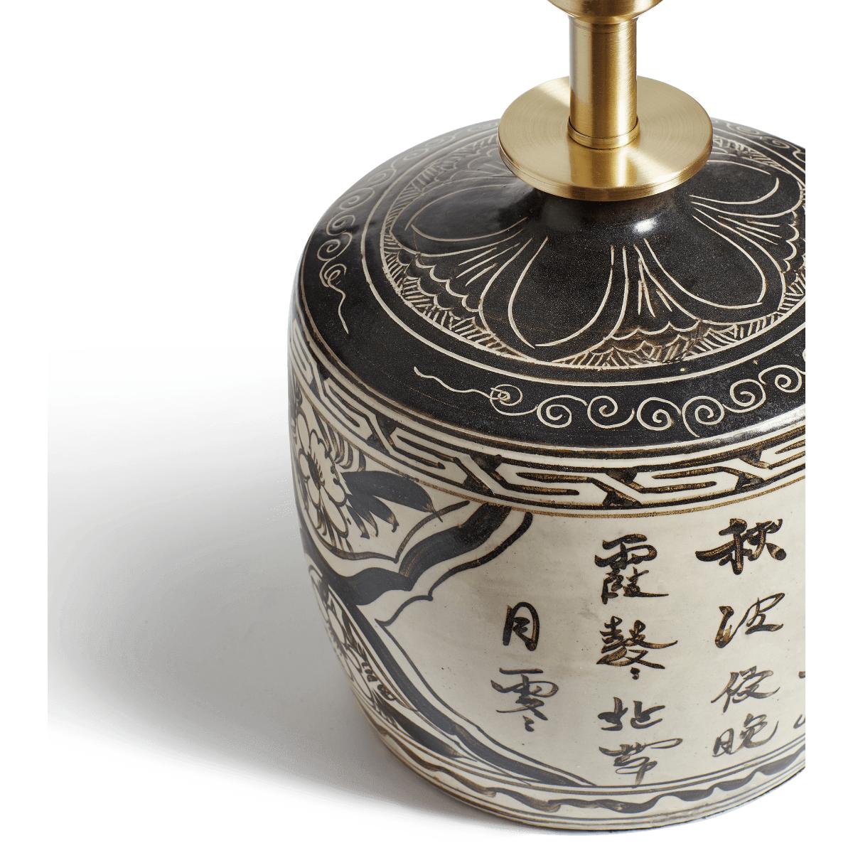 The black and white design of our Wintersweet Table Lamp is complemented by a gold-finished aluminium bulb socket. It showcases beautiful floral and swirling motifs, and is named for the flower that features in the poem translated from the Chinese symbols on its façade: Side A: I look at the wind and snow at dawn in the south, The door in the north has locked up the pearl [in my heart], Meet wild goose alone in the east mountain, Rain from the west come along with a boat. Side B: Spring wave the green twig by her breeze, Summer makes various mountains magnificent, bizarre, Autumn sprinkle the golden sunset on the lake, Winter wrap wintersweet with silver snow.