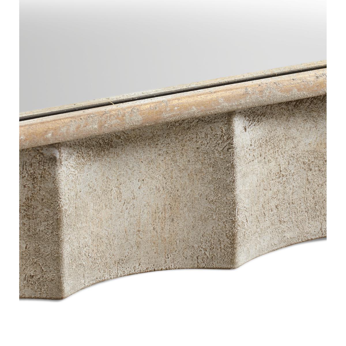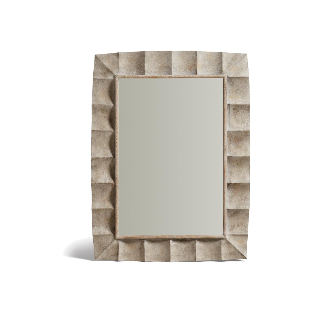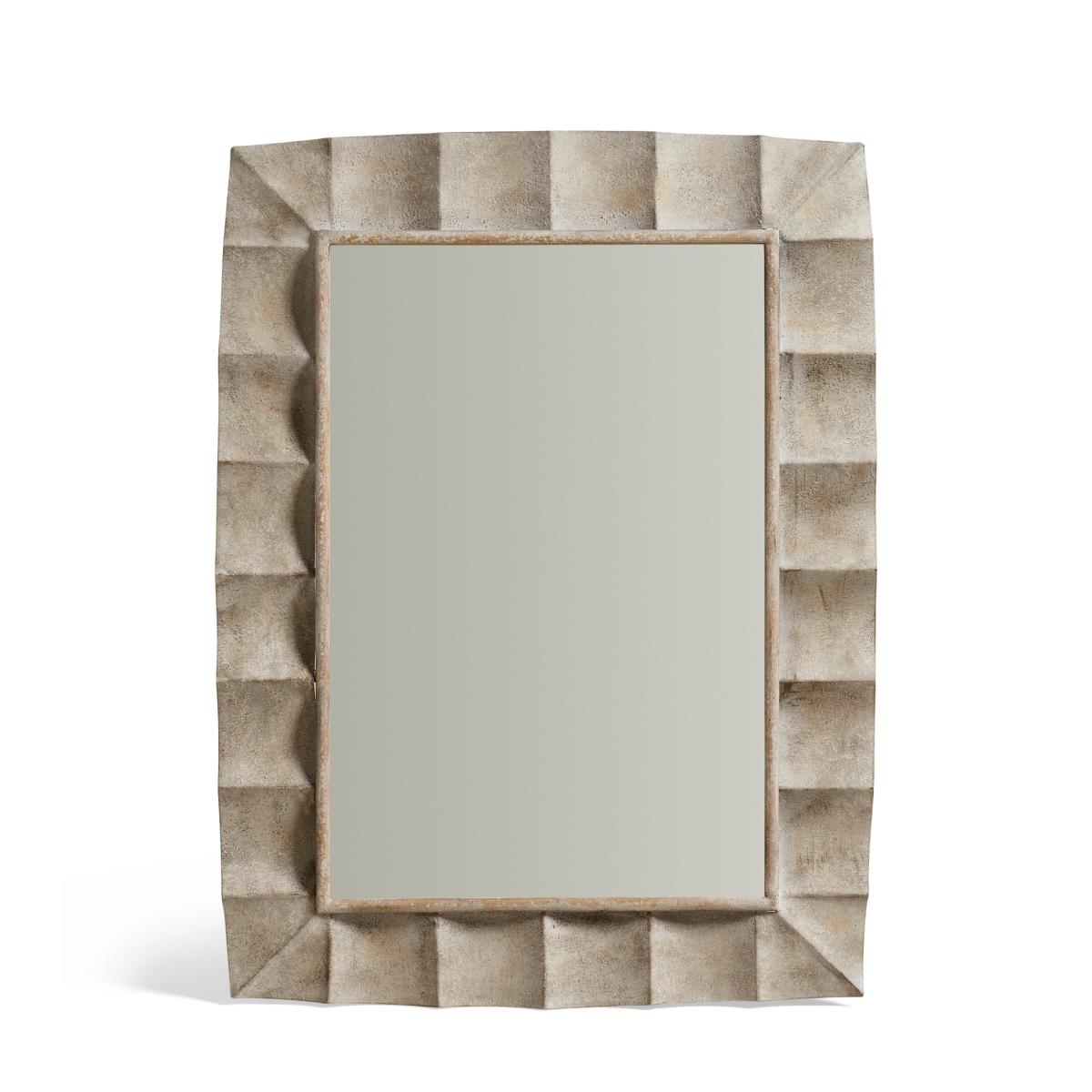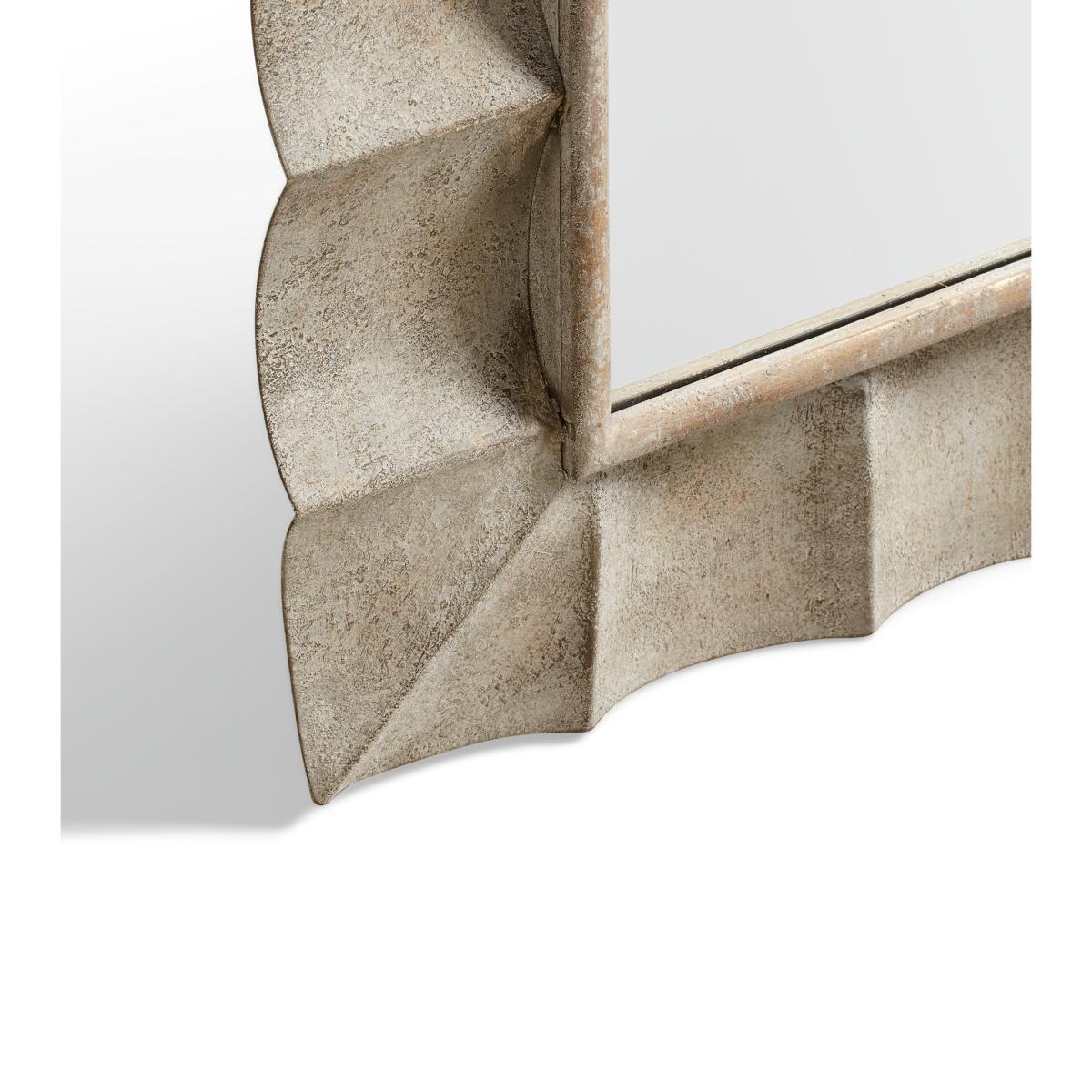 The Okean mirror has a real sense of presence with its wave-like scalloped metal edge framing the reflective surface. The metal is painted in in a distressed grey which lends it a delicate and calming appearance with the timeless aura of an antique.