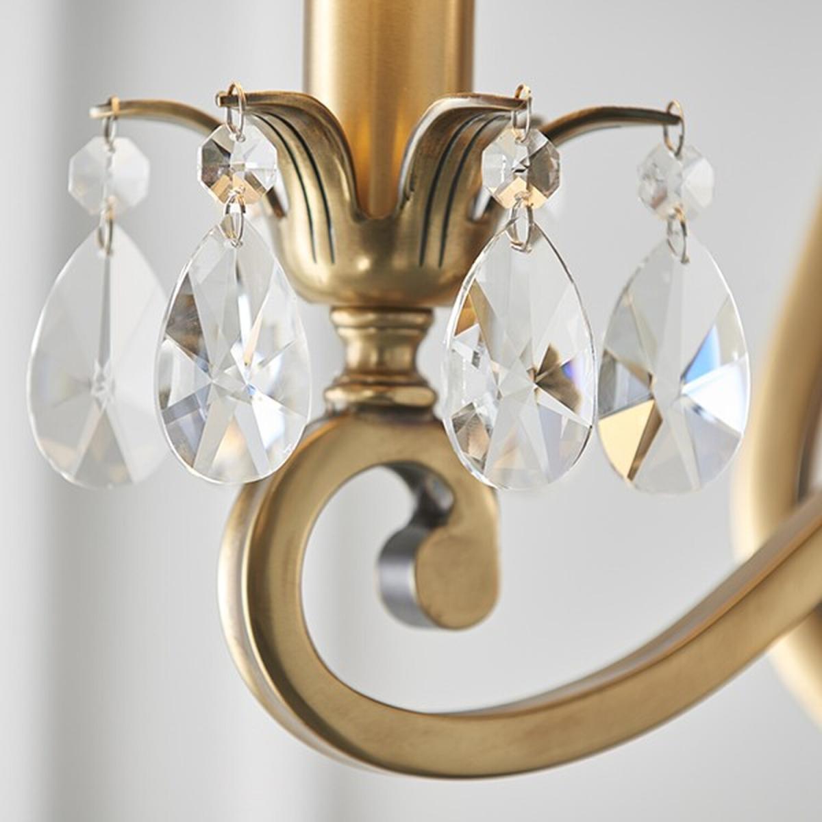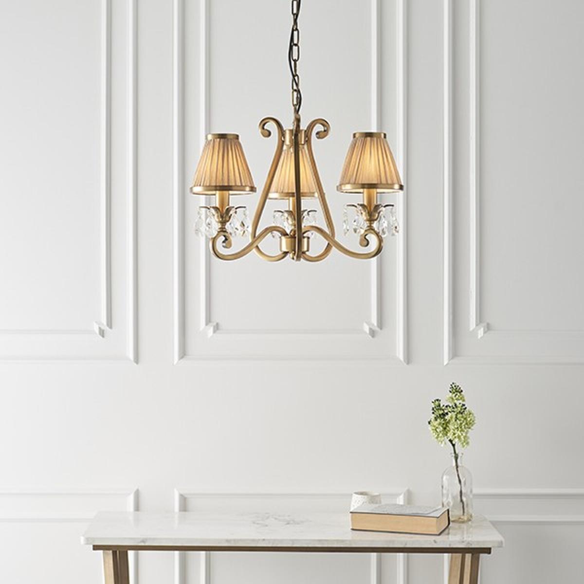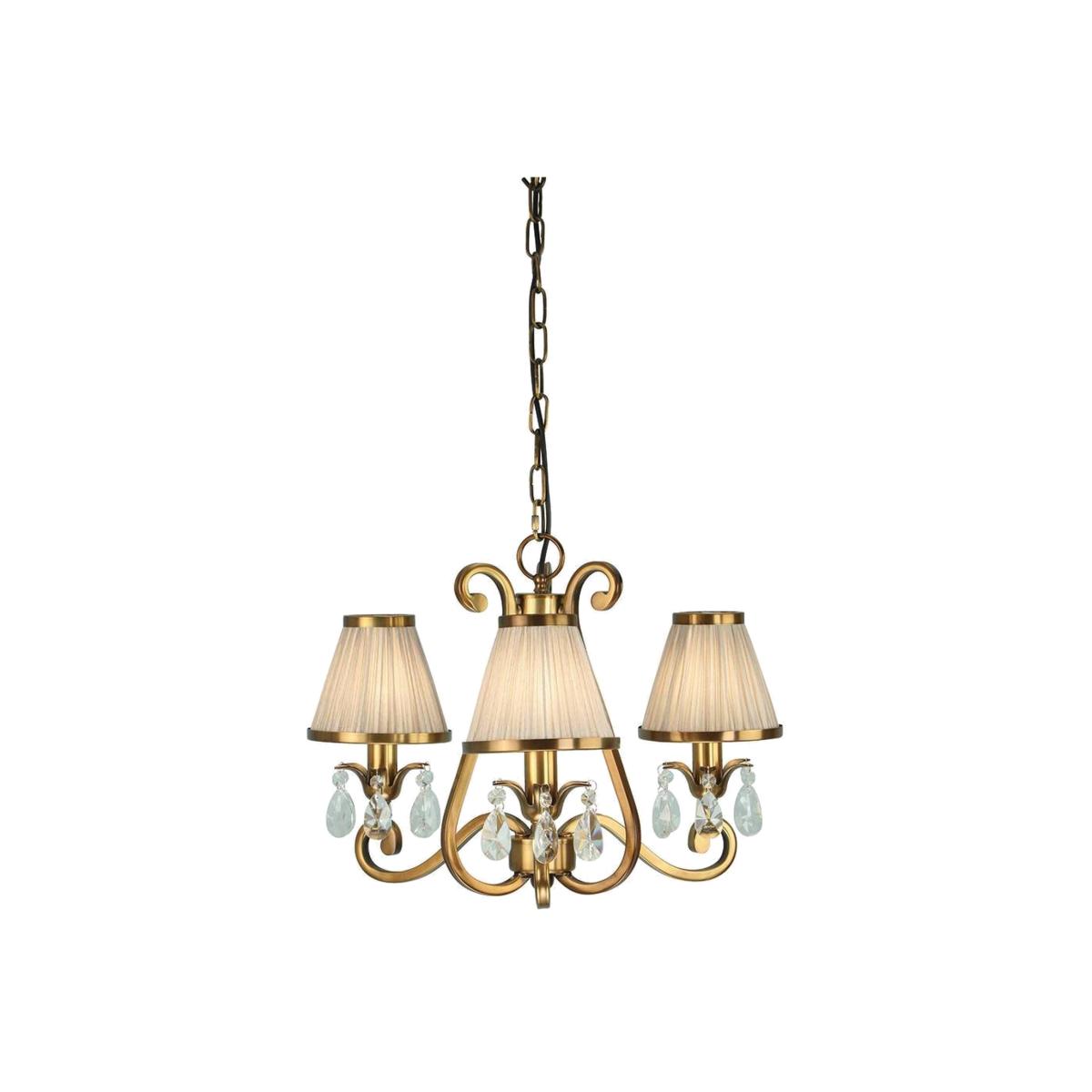 A three light pendant from the antique brass range. Features faceted lead crystal droplets around the lamp holder on each decorative arm. Matching items available and compatible with LED lamps.